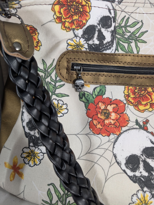 Handcrafted convertible shoulder purse to backpack floral skulls