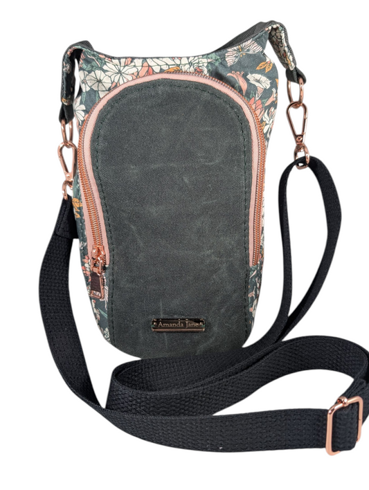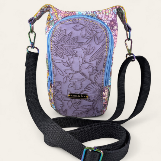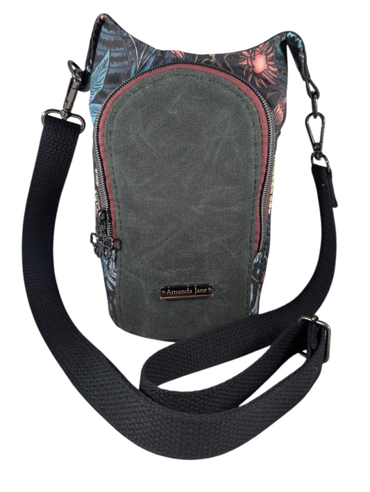 Handcrafted water bottle holder with card slots ferns and mushrooms