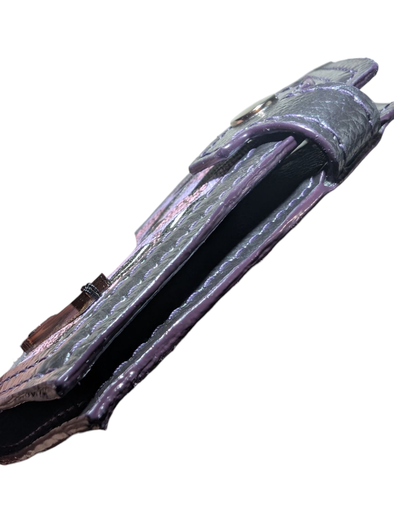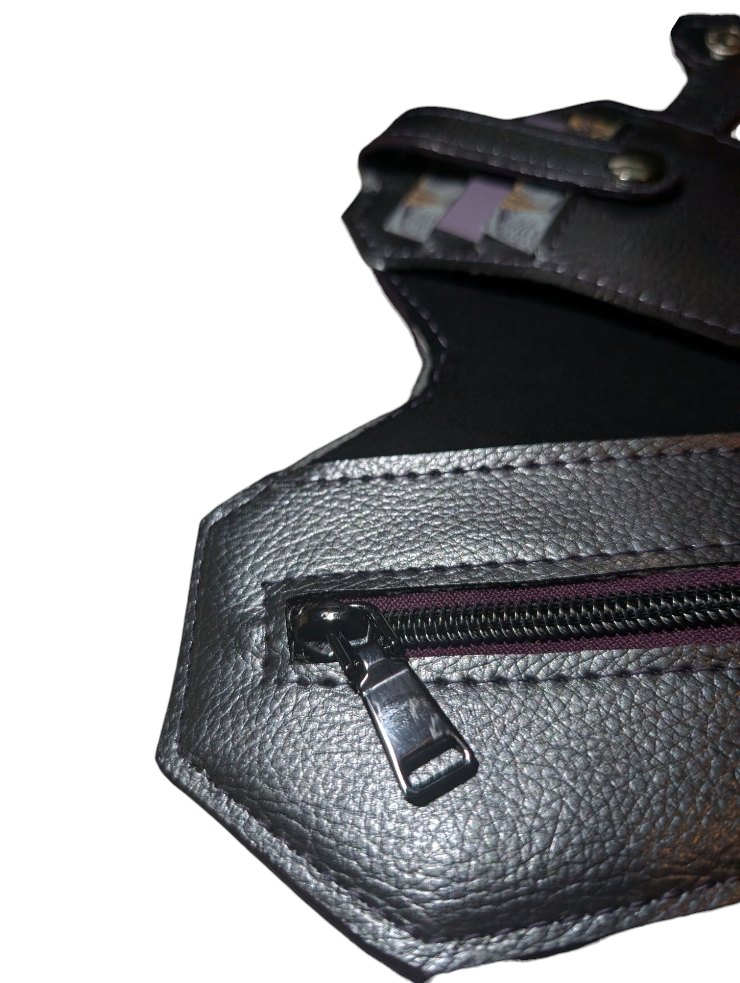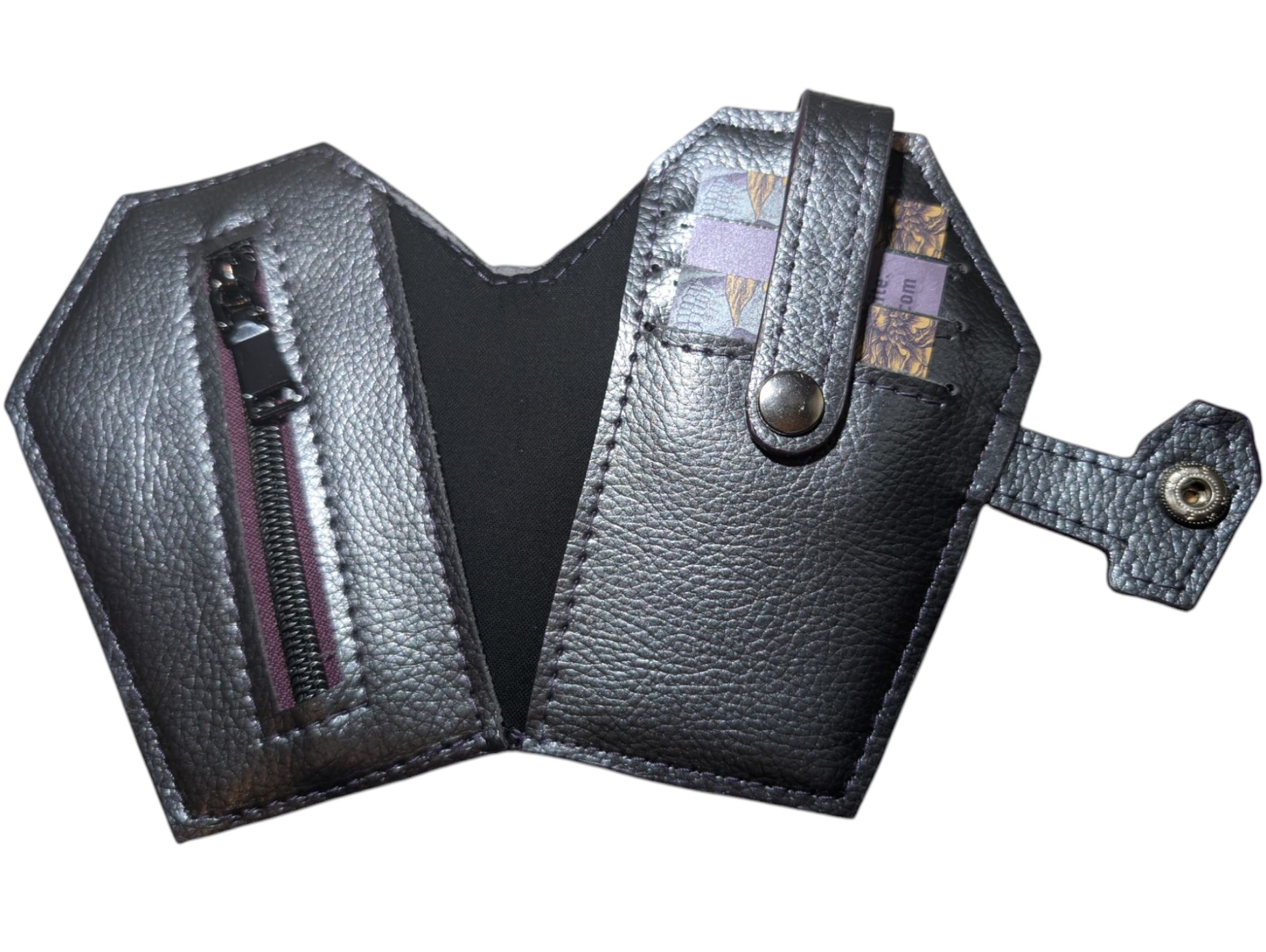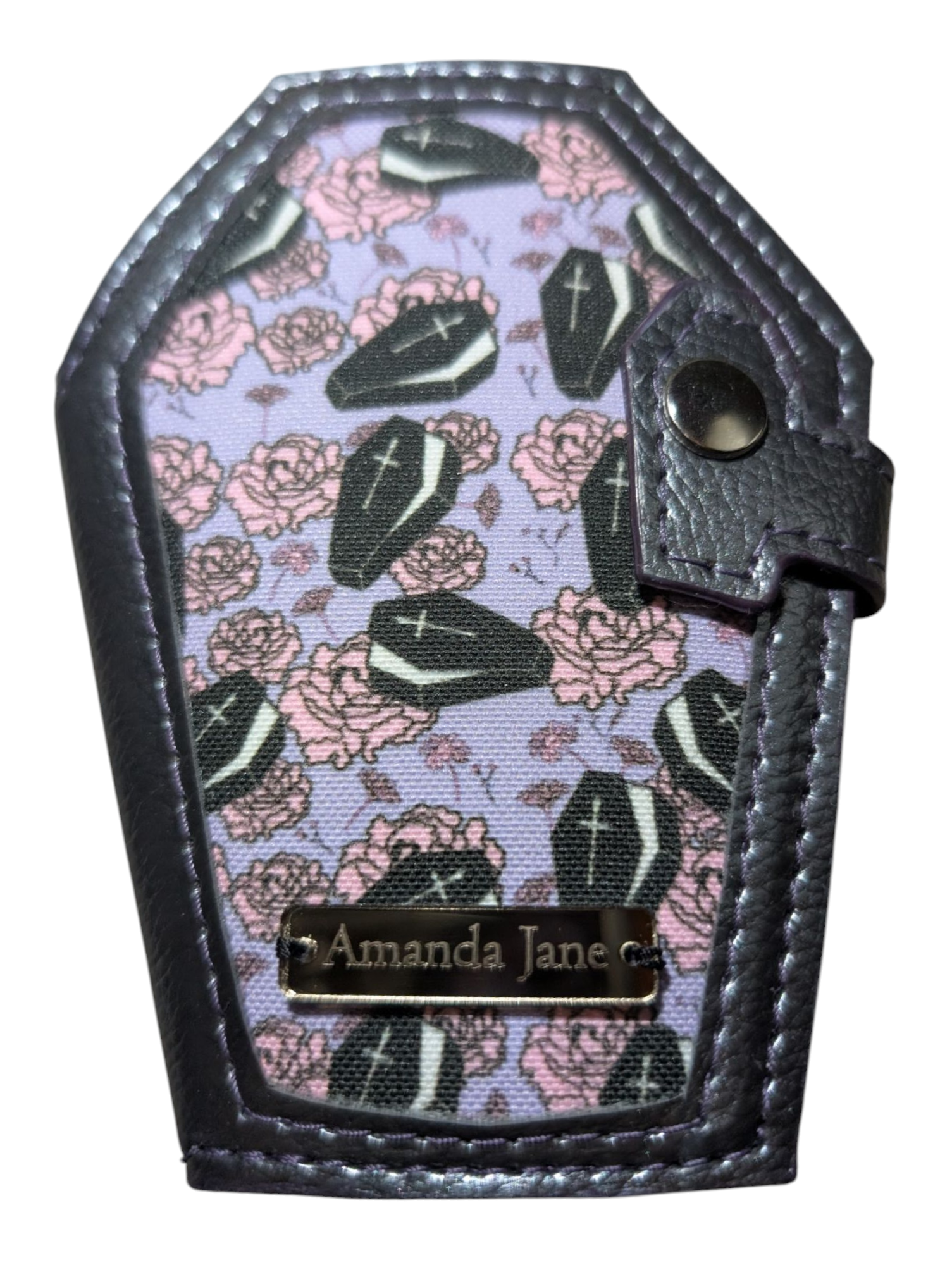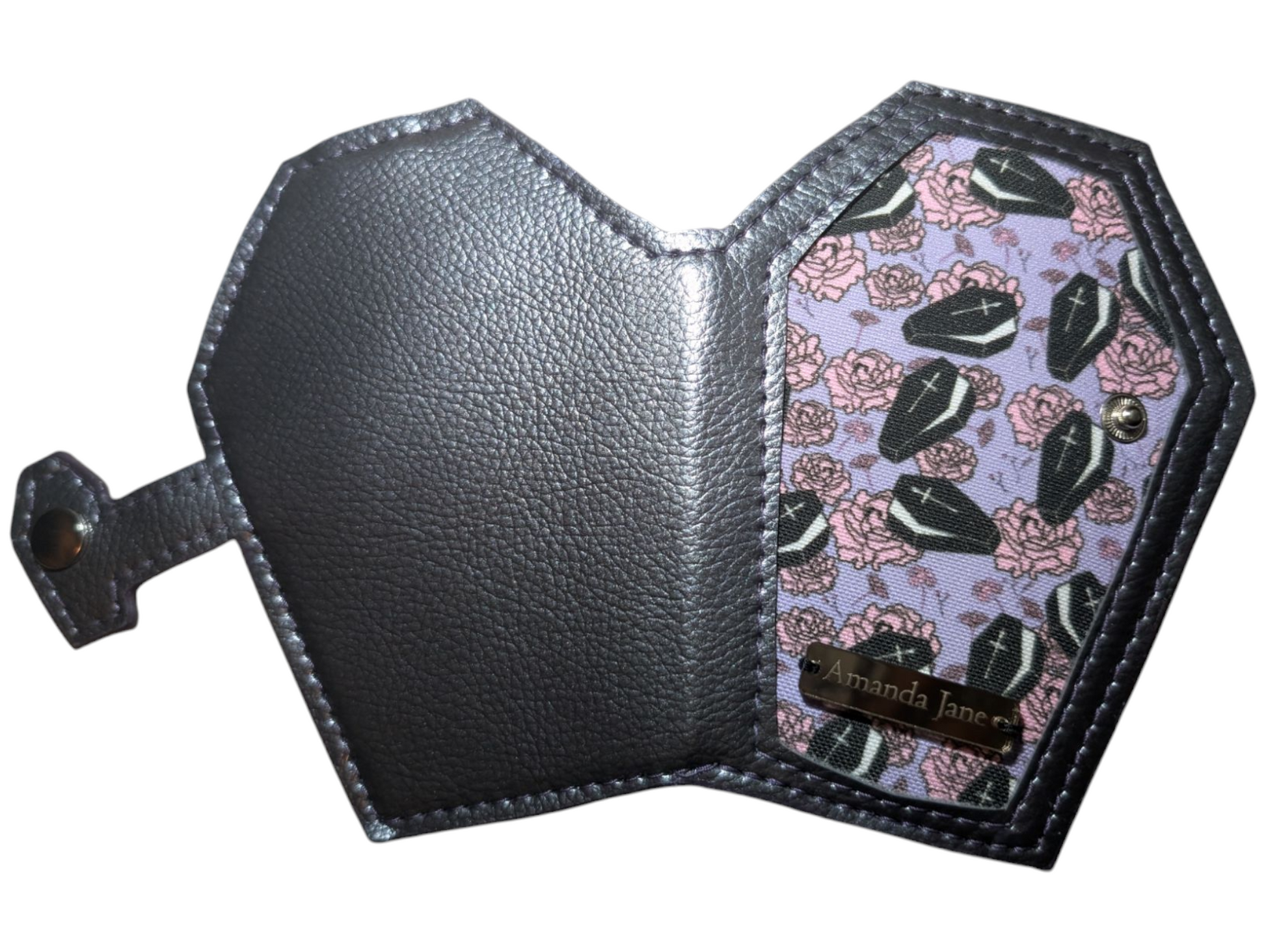 Lots of love and time was put until making these awesome coffin wallets! They feature a spot to put three cards on one side on the inside which closes with a snapped flap. On the other side inside is a zippered pocket to put coins or bills. Behind both of these compartments is a slip pocket. Peep the zipper pull! All outside edges are sealed with leather edge paint for a professional finish. The exterior is made with grey vinyl that frames a beautiful purple coffin design.