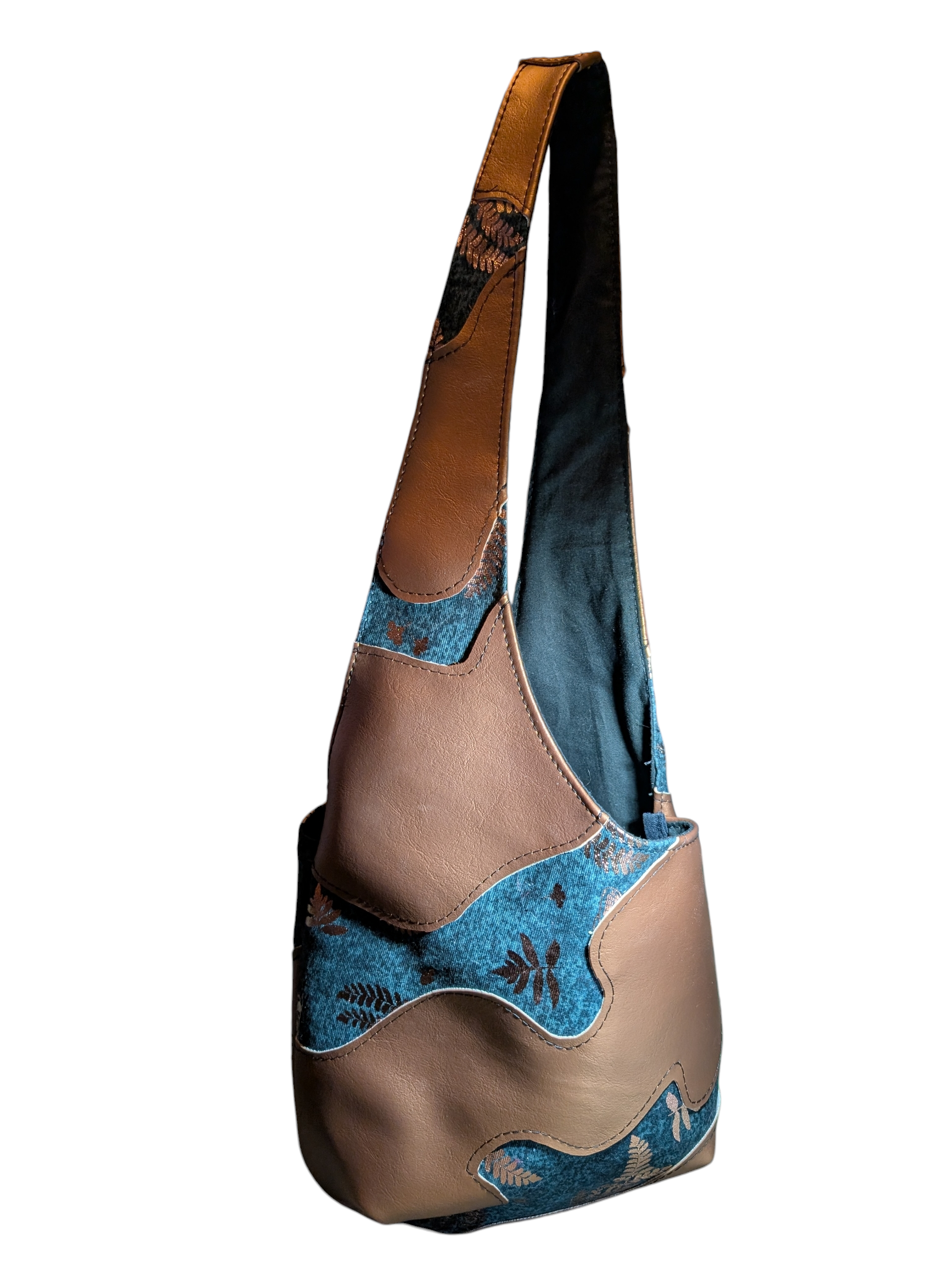 Lots of love and time was put into this purse! It has a fabric on the exterior that is teal with bronze flowers on it. There are matching bronze vinyl accents. It has a black lining on the inside.