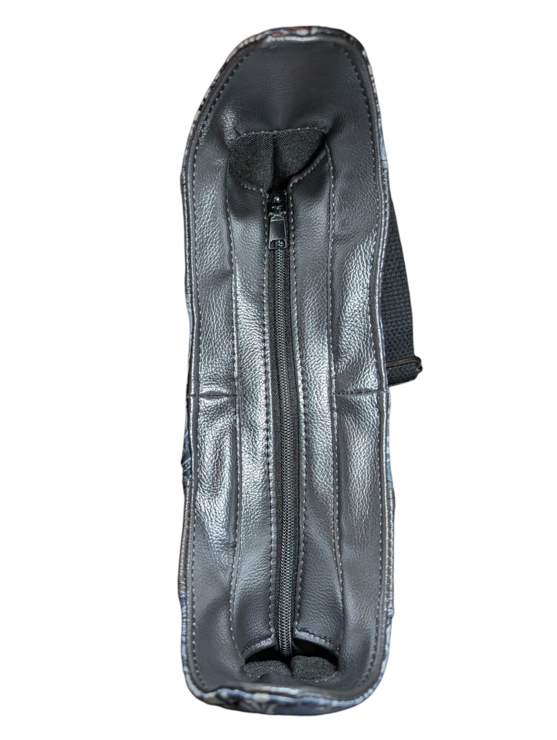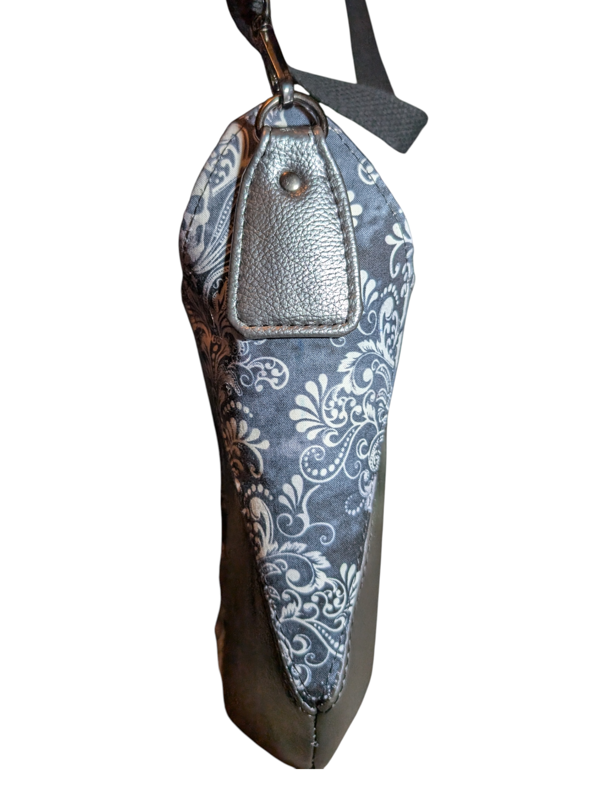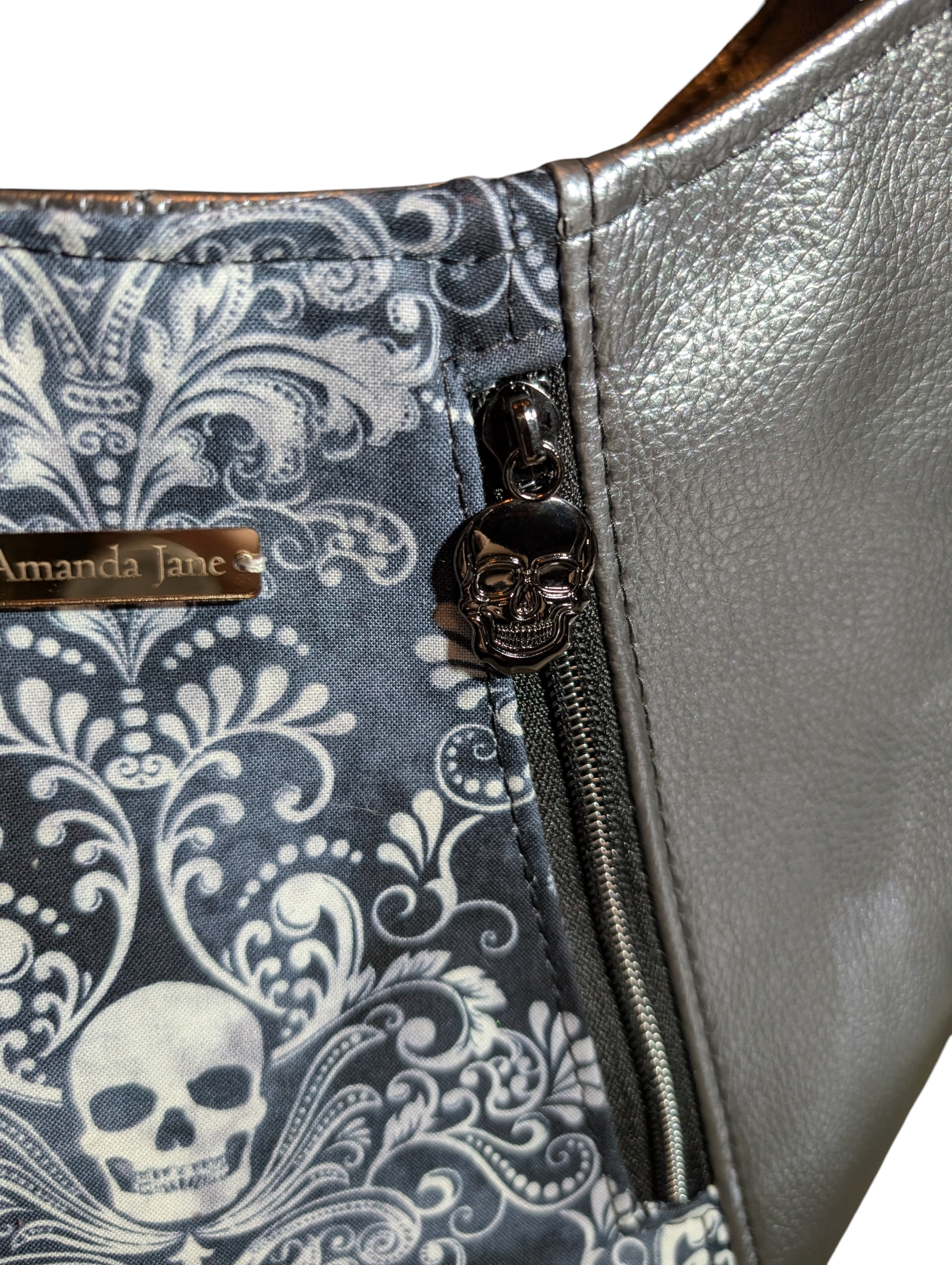 Lots of love and time was put into this purse! It has an grey and white skull and desmask pattern on it. There are matching silver vinyl accent panels. It has a black waterproof canvas lining on the inside. There is also a zipper pocket and 2 slip pockets on the inside of the purse. There is also an exterior pocket. There is a removable, adjustable crossbody strap included.