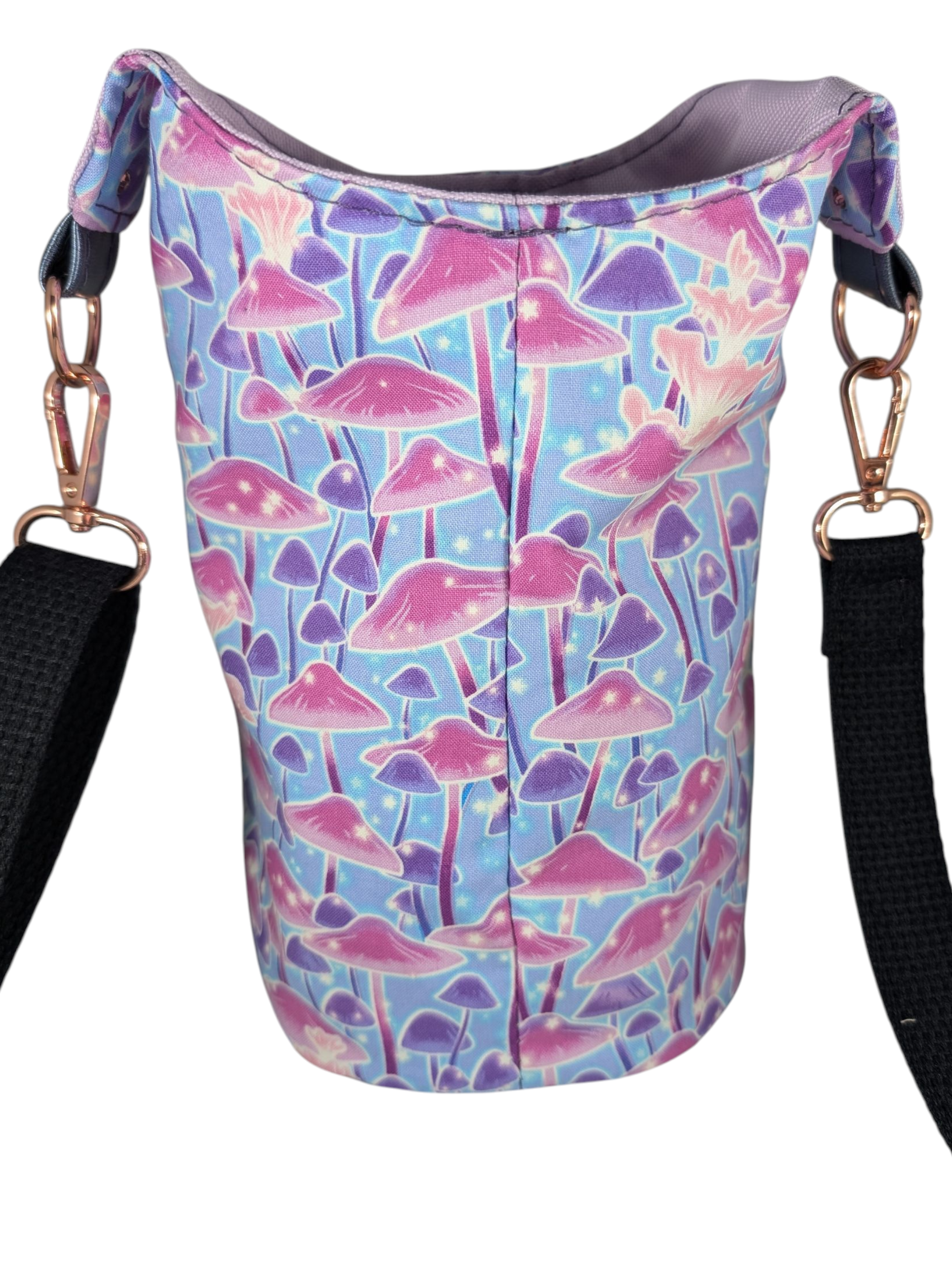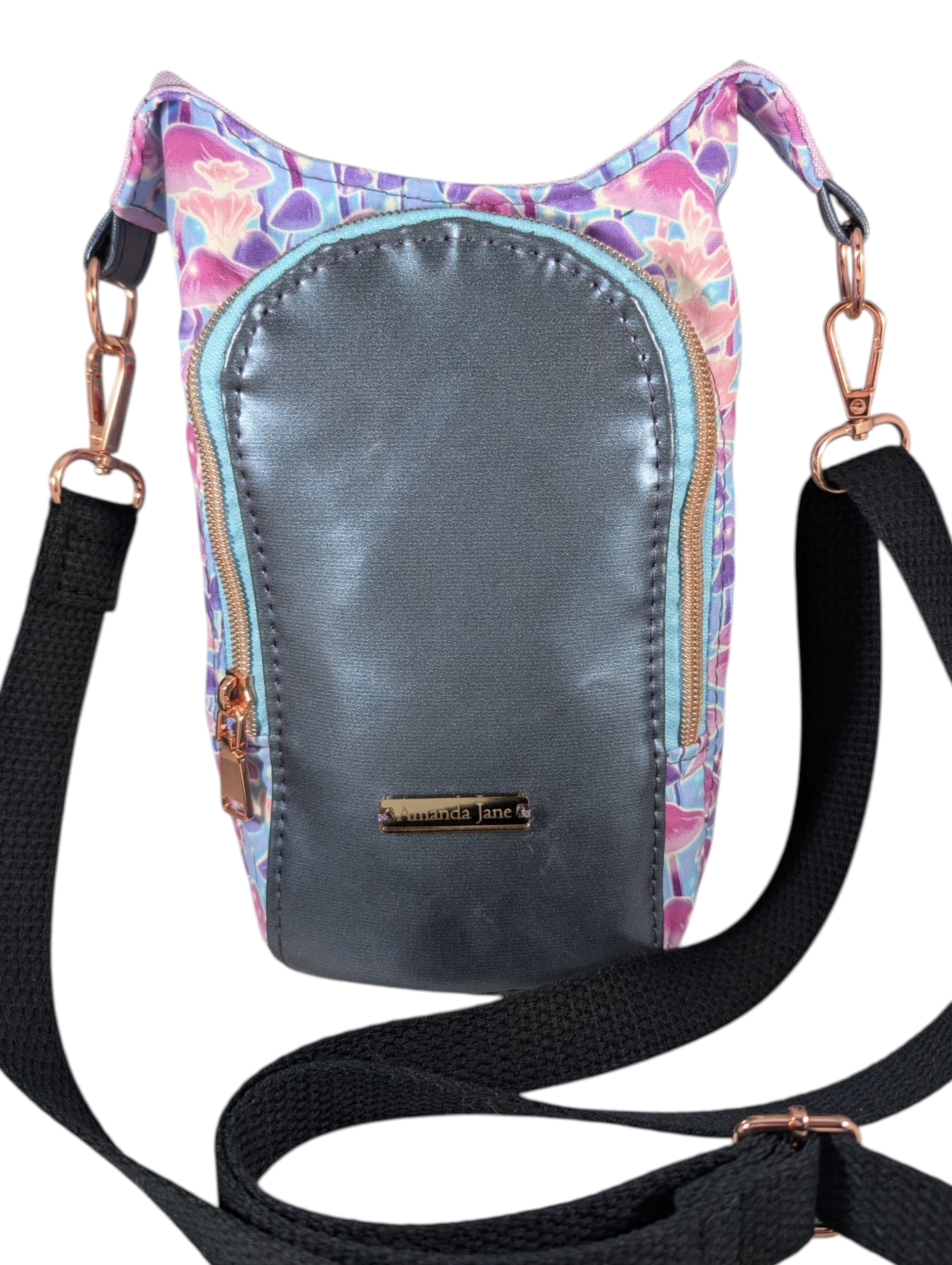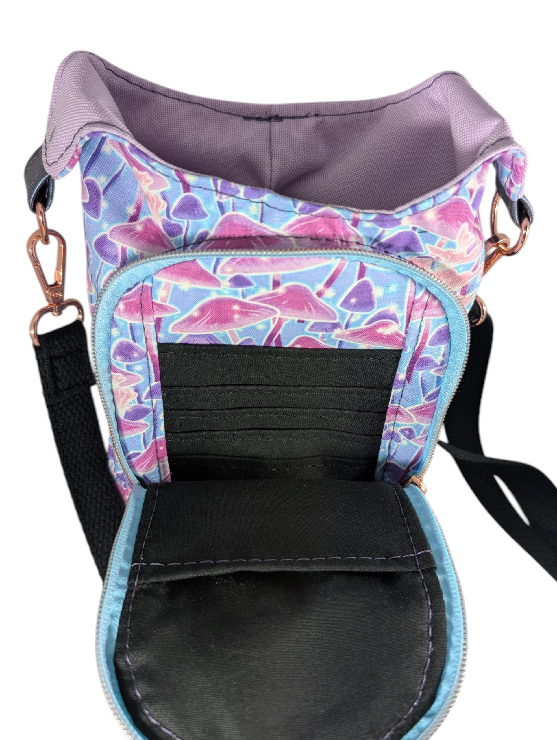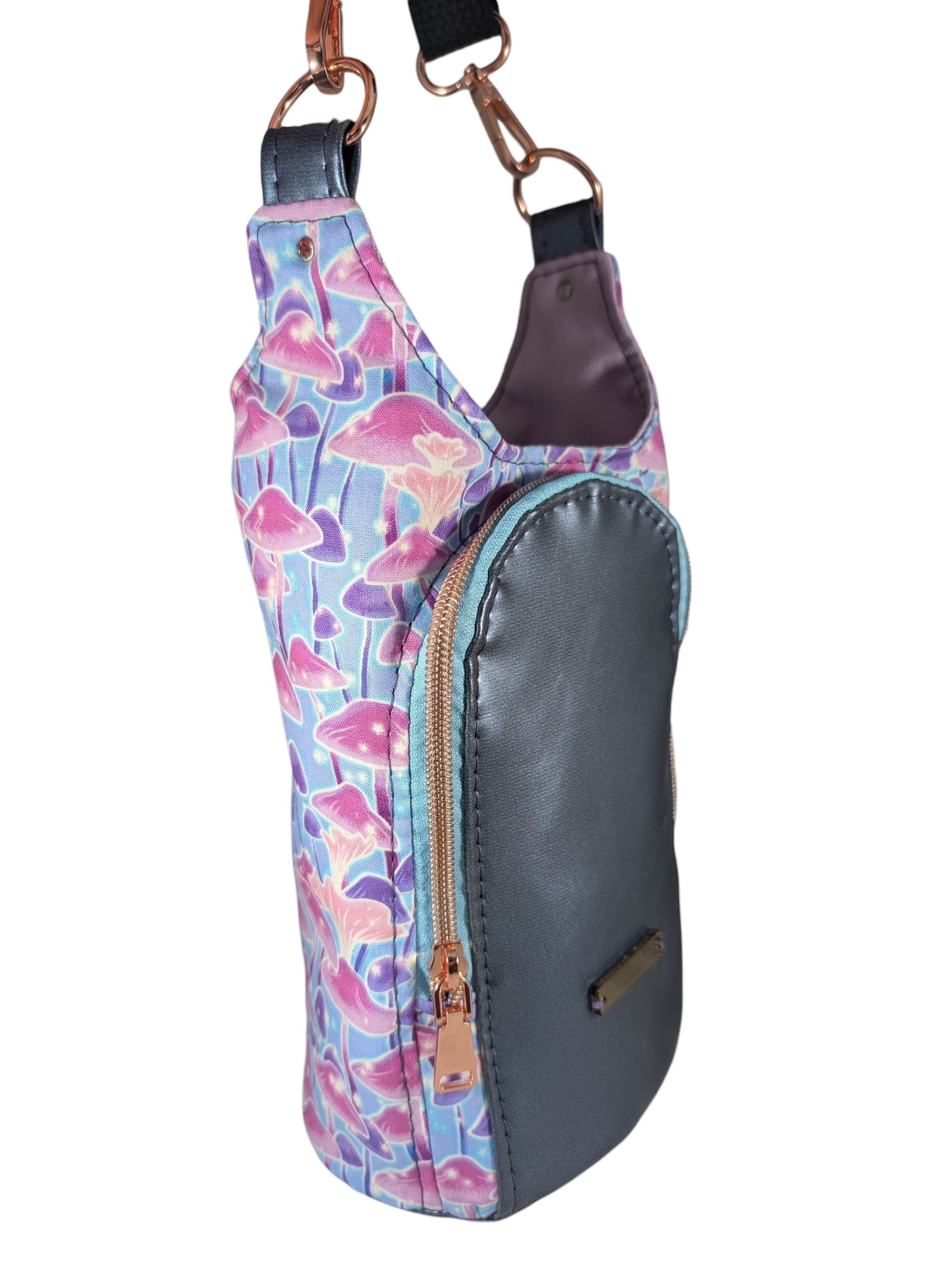 Handcrafted water bottle holder with card slots glow in the dark neon mushrooms