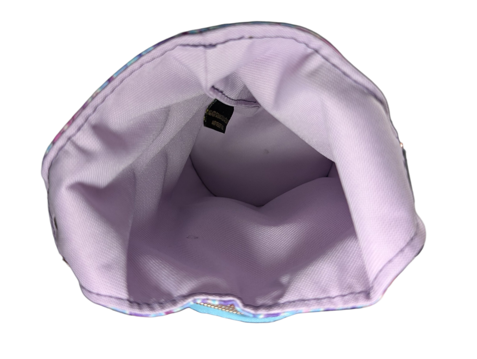 Lots of love and time was put into this! It has an awesome main fabric that has a cute neon mushroom (it glows in the dark!) print on it. There is a glossy blue vinyl front zipper pocket. The inside has a lilac waterproof canvas. The front zipper panel has a space for four cards and a slip pocket behind it made with black fabric. The other side of the zipper pocket has a slip pocket for a phone. It has a detachable adjustable crossbody strap made with cotton webbing.