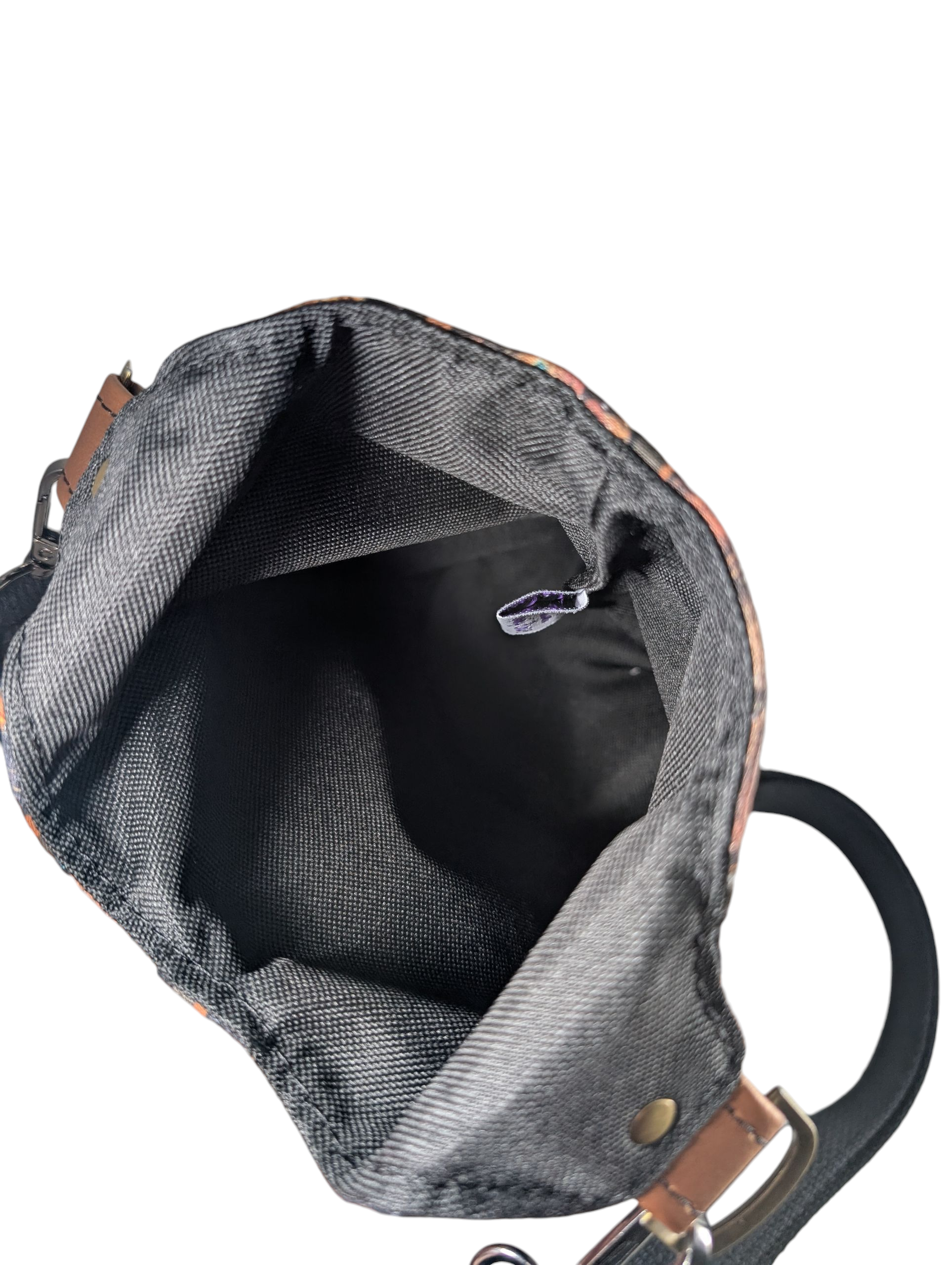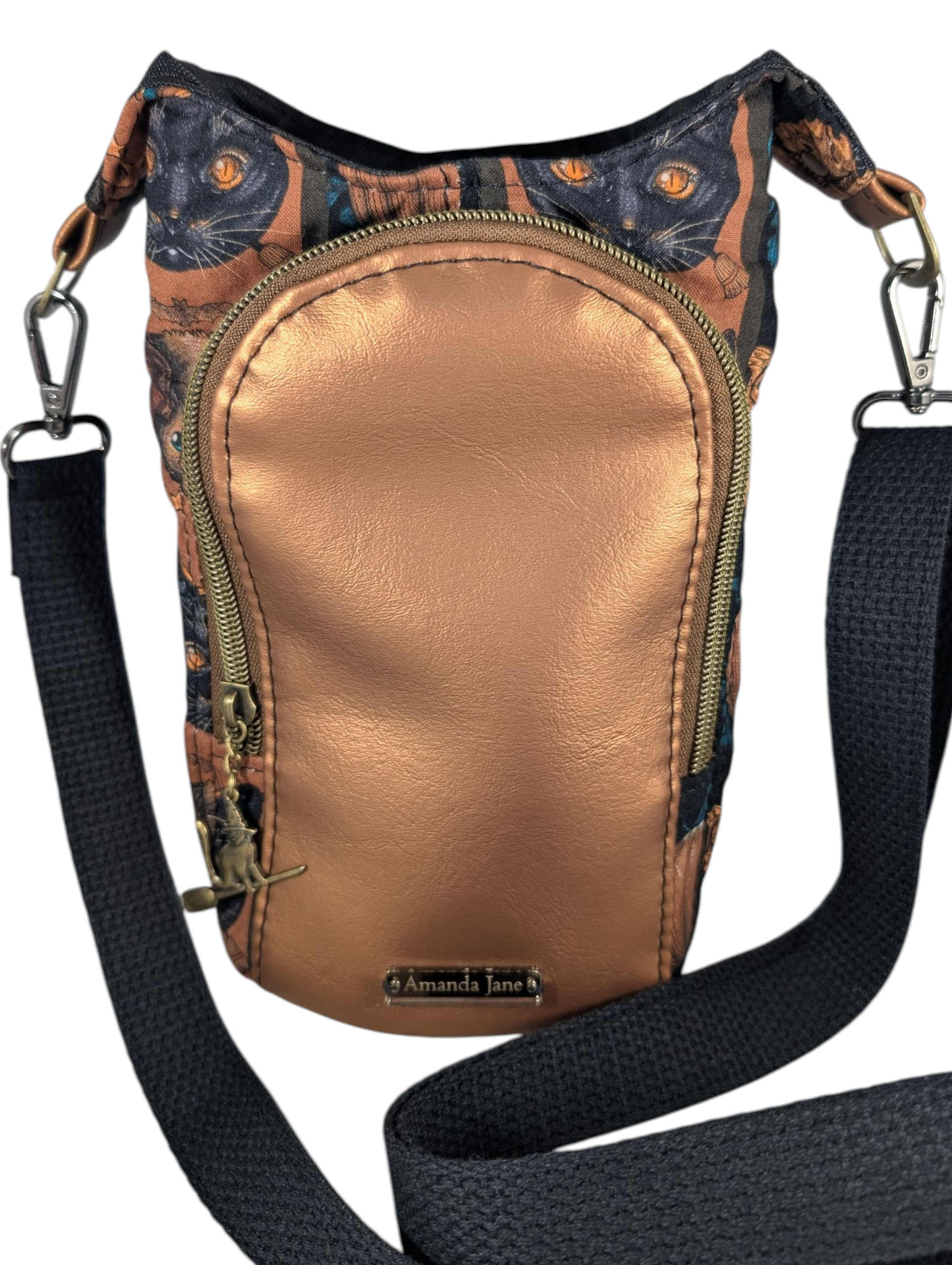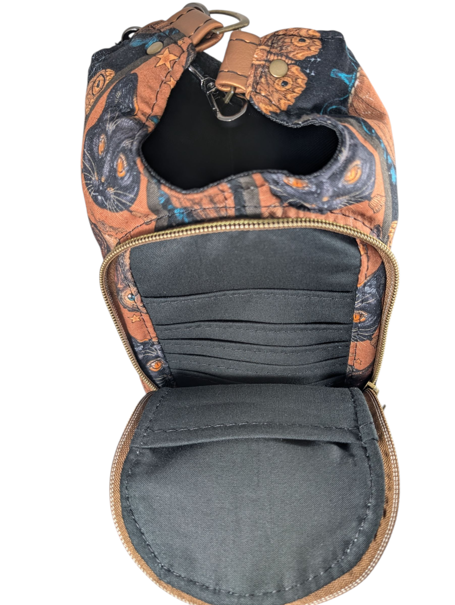 Lots of love and time was put into this! It has an awesome main fabric that has a bat and cat print on it. There is a glossy brown vinyl bottom and front zipper pocket. The inside has a black waterproof canvas. The front zipper panel has a space for four cards and a slip pocket behind it made with black fabric. The other side of the zipper pocket has a slip pocket for a phone. It has a detachable adjustable crossbody strap made with cotton webbing.