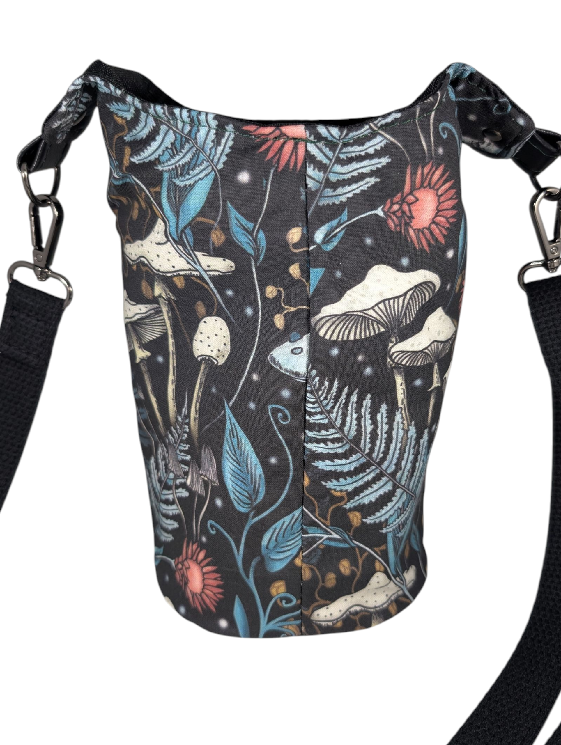 Handcrafted water bottle holder with card slots ferns and mushrooms