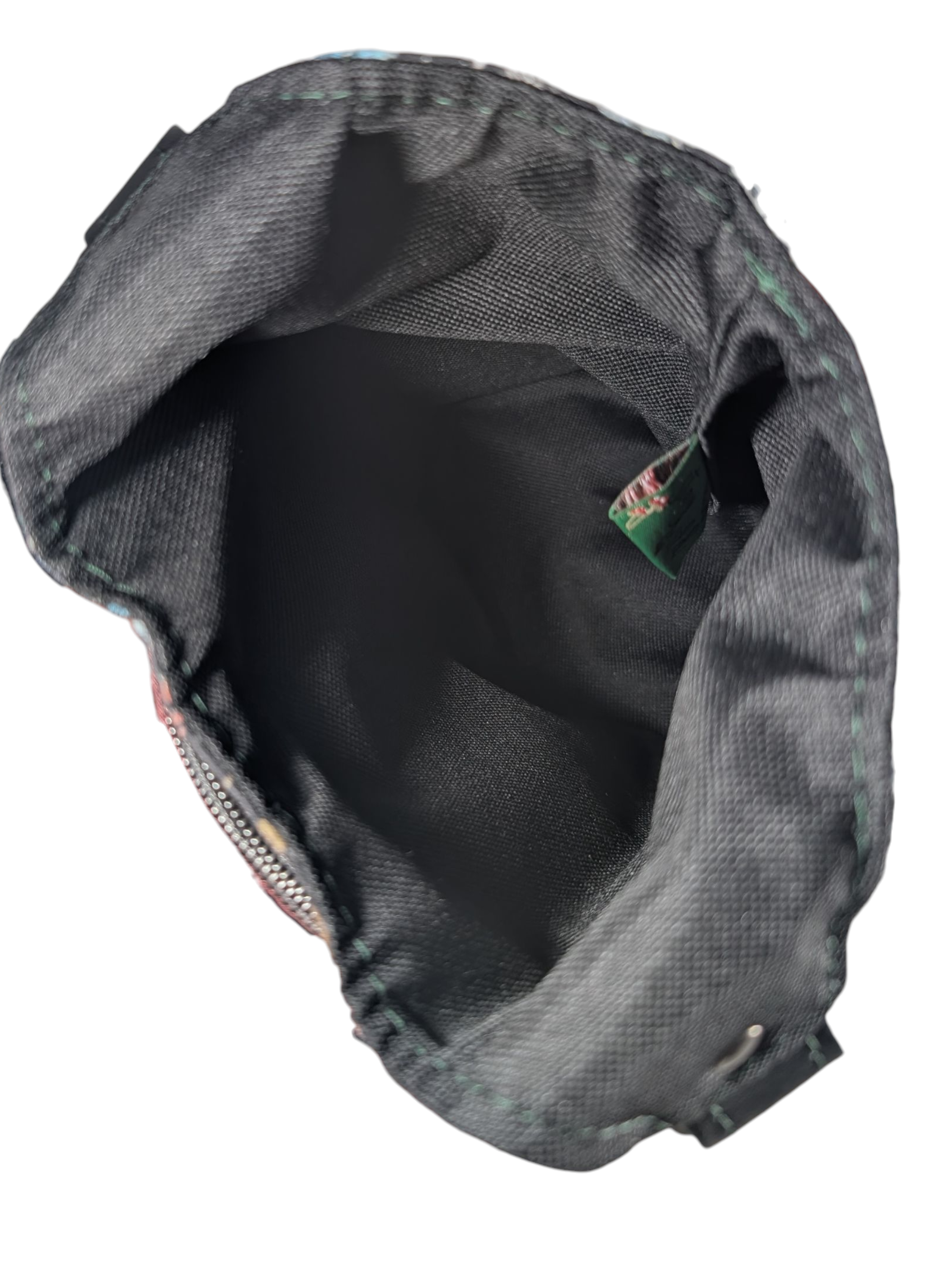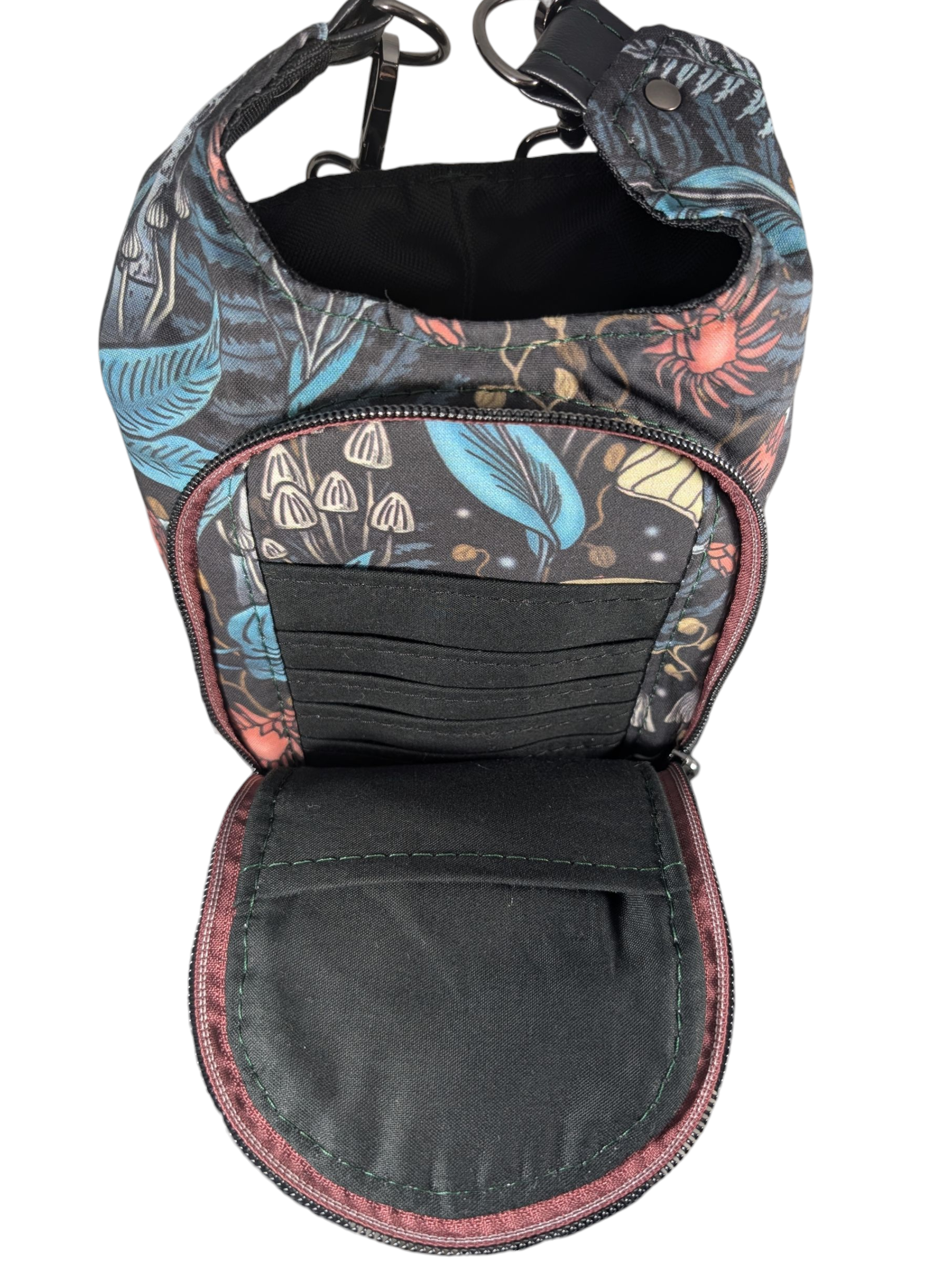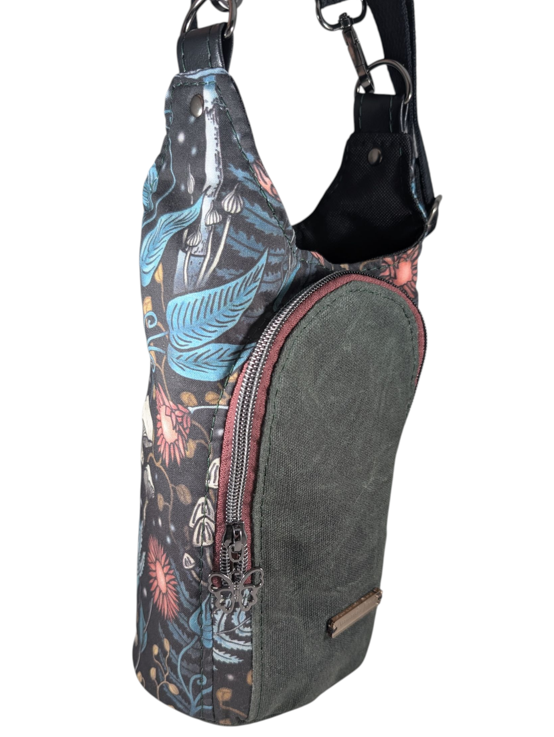 Lots of love and time was put into this! It has an awesome main fabric that has a beautiful fern, floral, and mushroom print on it. There is a dark green waxed canvas bottom and front zipper pocket. The inside has a black waterproof canvas. The zipper pull has a rose gold colored butterfly. The front zipper panel has a space for four cards and a slip pocket behind it made with black fabric. The other side of the zipper pocket has a slip pocket for a phone. It has a detachable adjustable crossbody strap made with poly webbing.