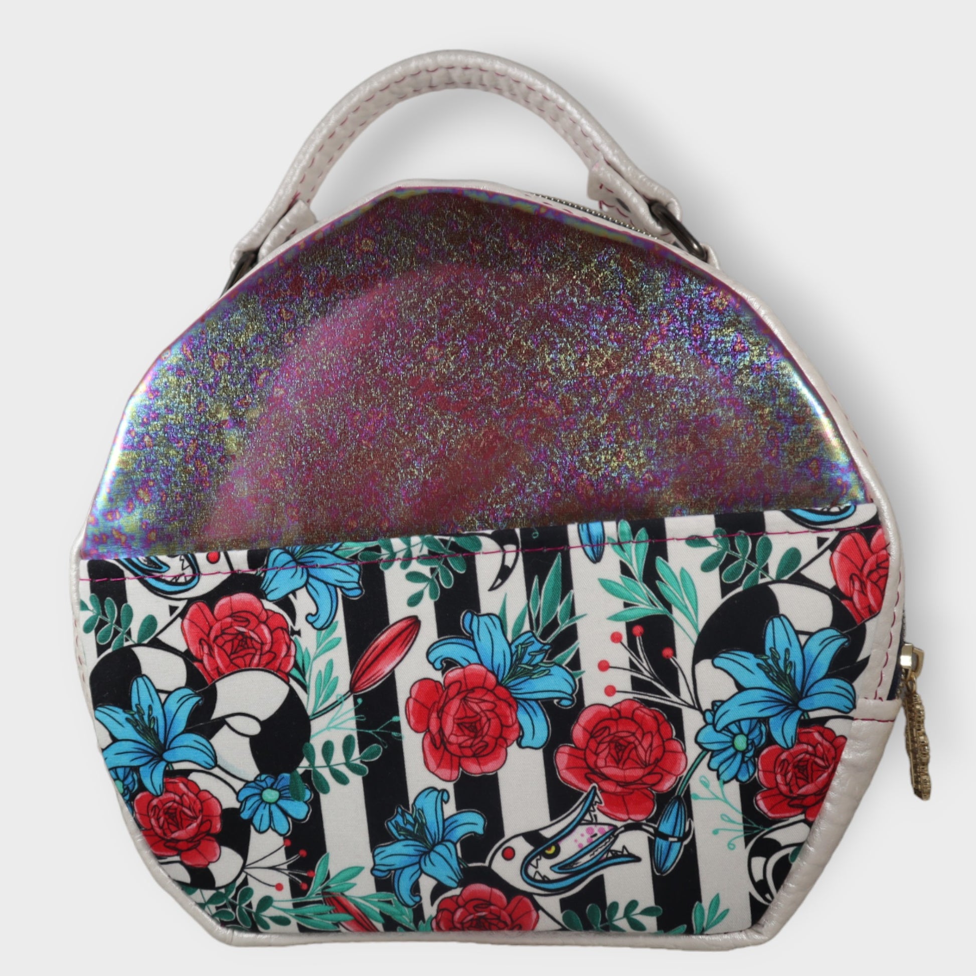 Lots of love and time was put into this pouch! It has a custom print that has sandworms from that Beetle guy movie. It has a pink transparent vinyl top that also has an iridescent finish to it. All fabric (besides the vinyl) has been interfaced with woven interfacing and stablizers for stability. It has a black waterproof canvas as lining on the inside bottom. The inside also has divided elastic to hold your make up brushes.