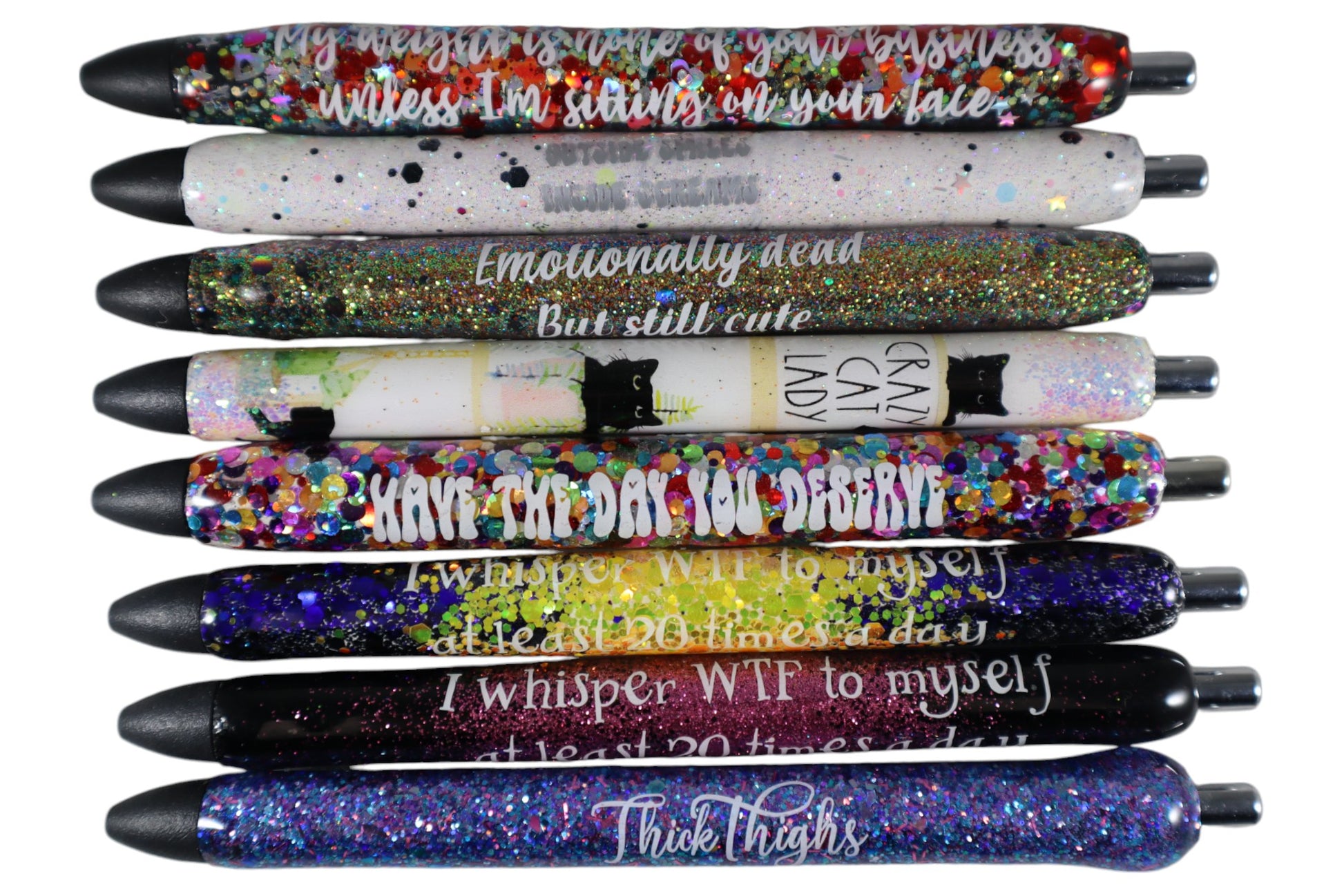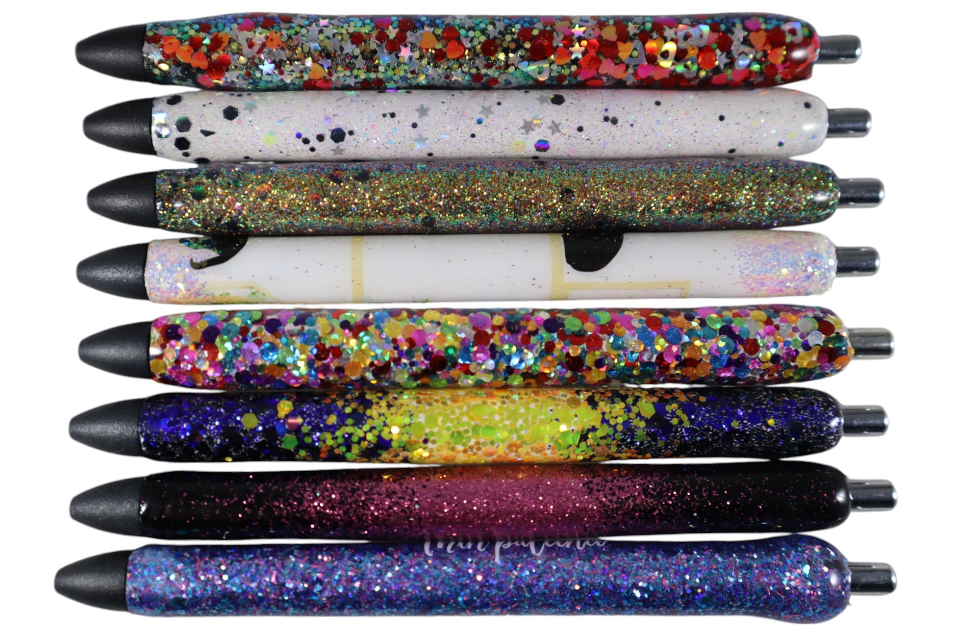 This listing is for ONE of the pictured glitter pens. Please select your choice from the options below. They will be listed from top to bottom in the picture. These pens can be refillable with Energel 0.7mm refills. If you're interested in getting your own custom pen made, please click here.