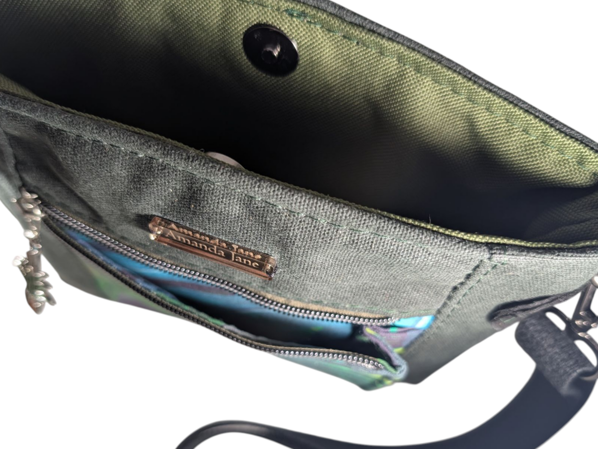 Lots of love and time was put into this purse! It has a custom printed main panel with a tropical leaf print on it. There is a green waxed canvas that makes up the sides, back, and gusset. It has a green waterproof canvas lining on the inside. There is a zippered pocket located on the inside and 2 zippered pockets on the outside. There is also a slip pocket on the inside. There is an adjustable, removable crossbody strap.