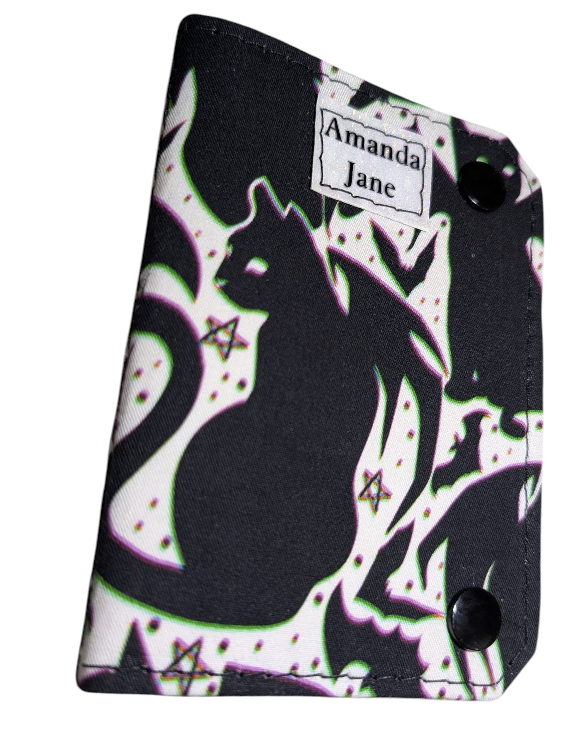 Lots of love and time was put until making this awesome wallet! This wallet has 3 card slots and a zippered pocket on the inside. The outside is made with a 3D bat cats print and the inside has grey leather. The exterior also has an ID window It is closed with 2 snaps.