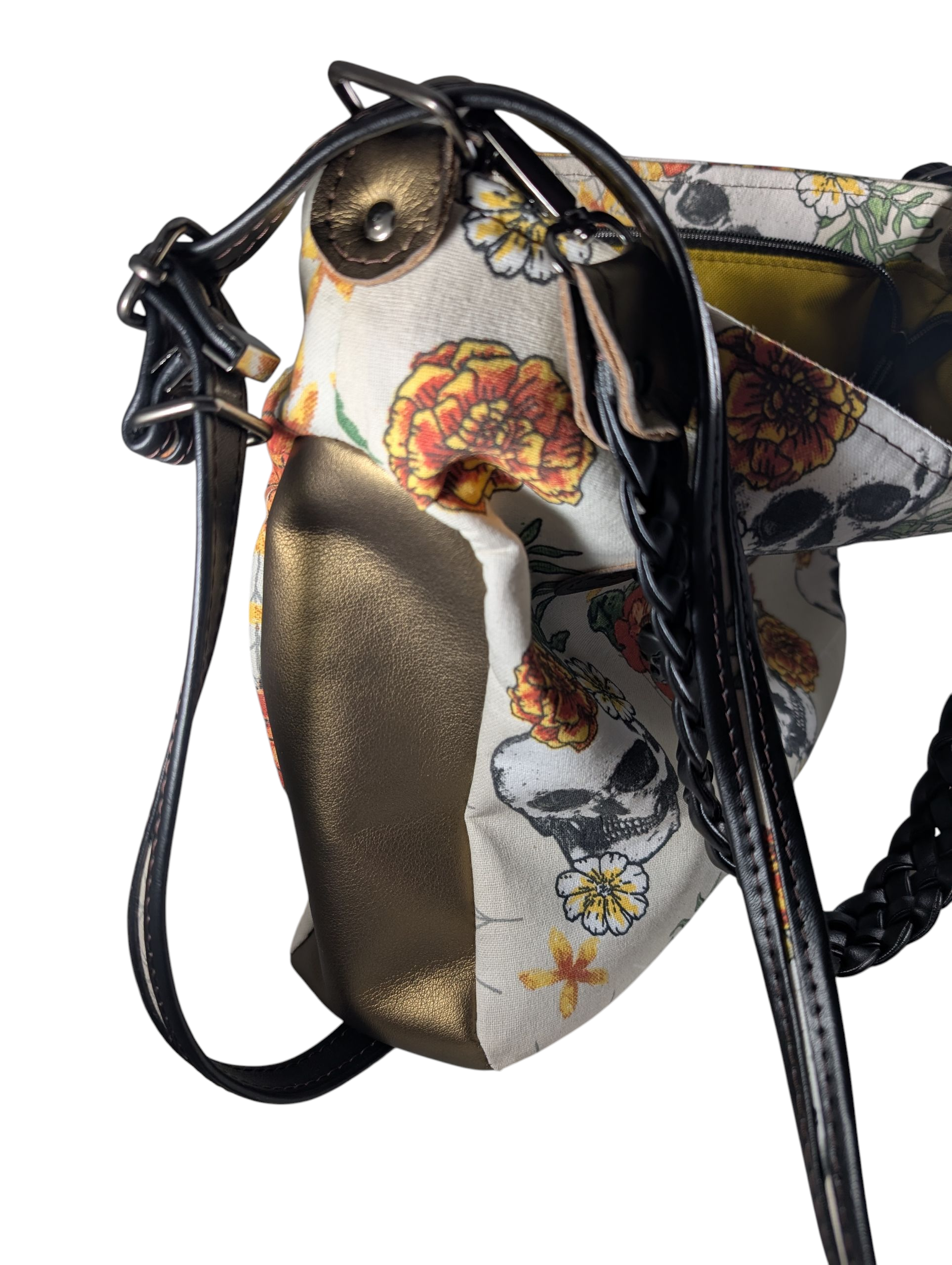 Handcrafted convertible shoulder purse to backpack floral skulls