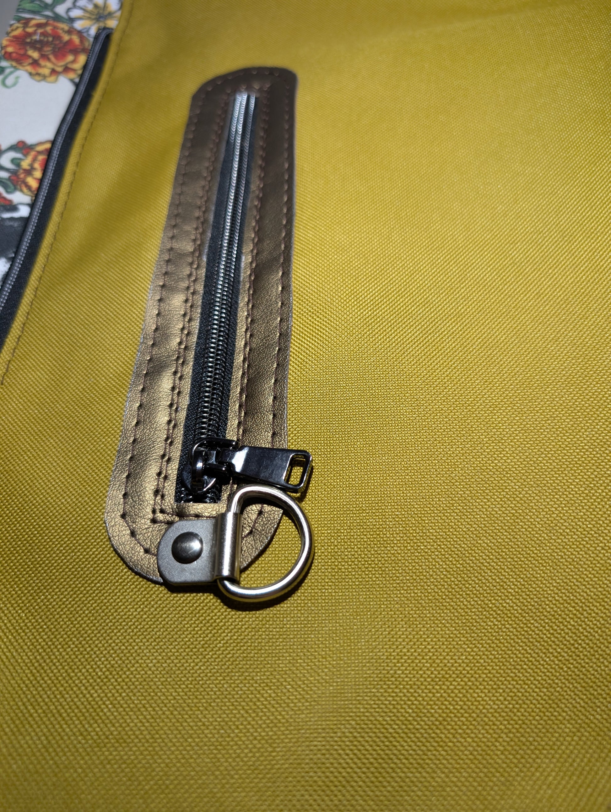 Lots of love and time was put into this back pack! It has a beautiful skull and flower pattern on it. All exterior fabric and pockets have been interfaced with woven fabric for stability. It has a gold waterproof canvas lining on the inside. The front of the purse/backpack has a zipper pocket. The inside has a slip pocket as well as a zippered pocket. The straps can be altered to either wear this as a shoulder purse or a backpack. It also has a removable handcrafted braided shoulder strap.