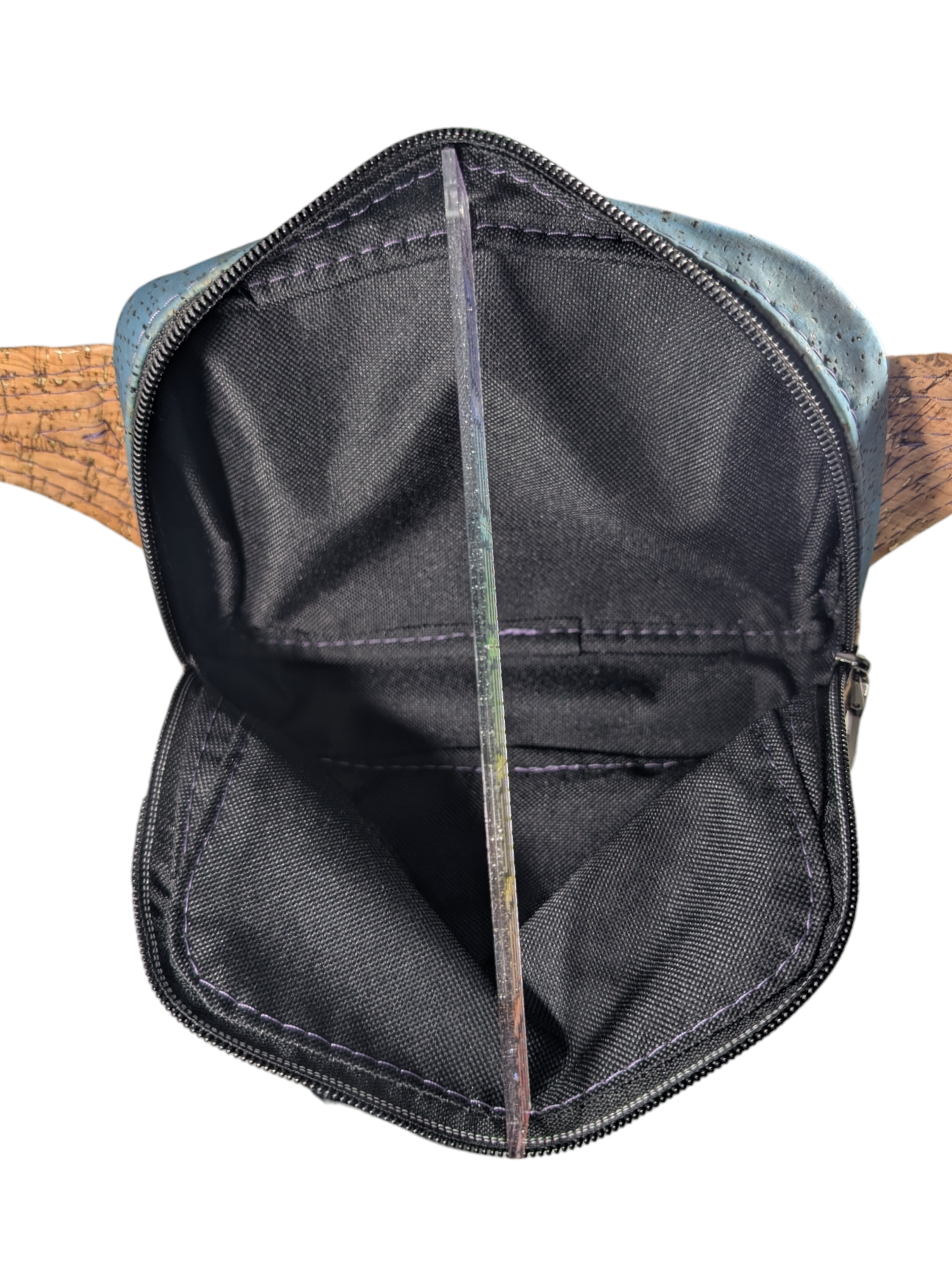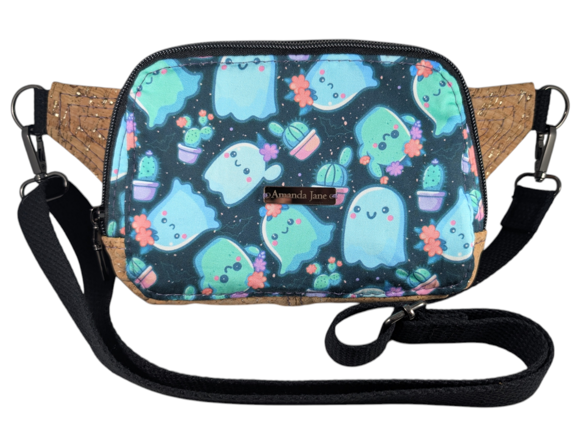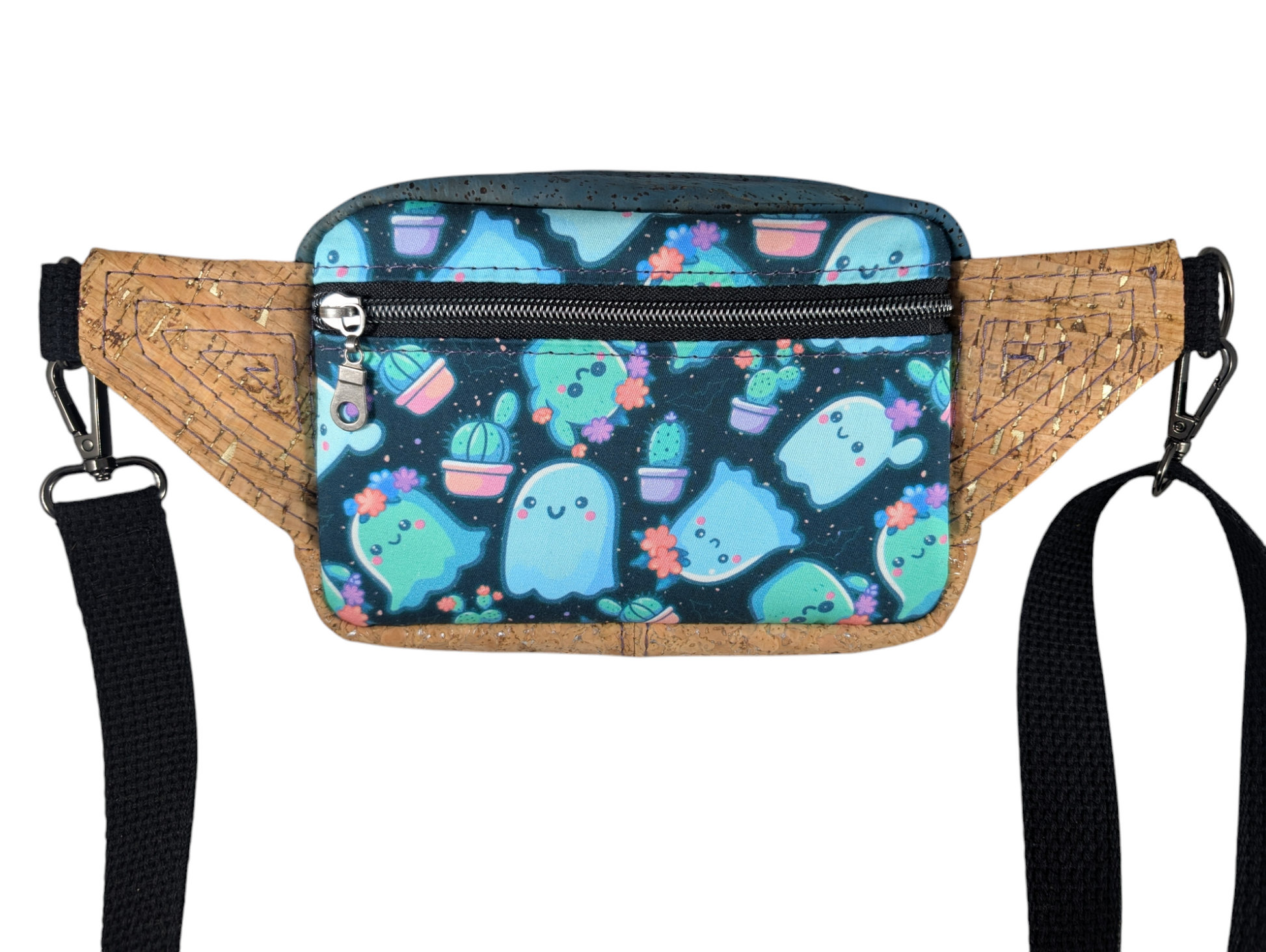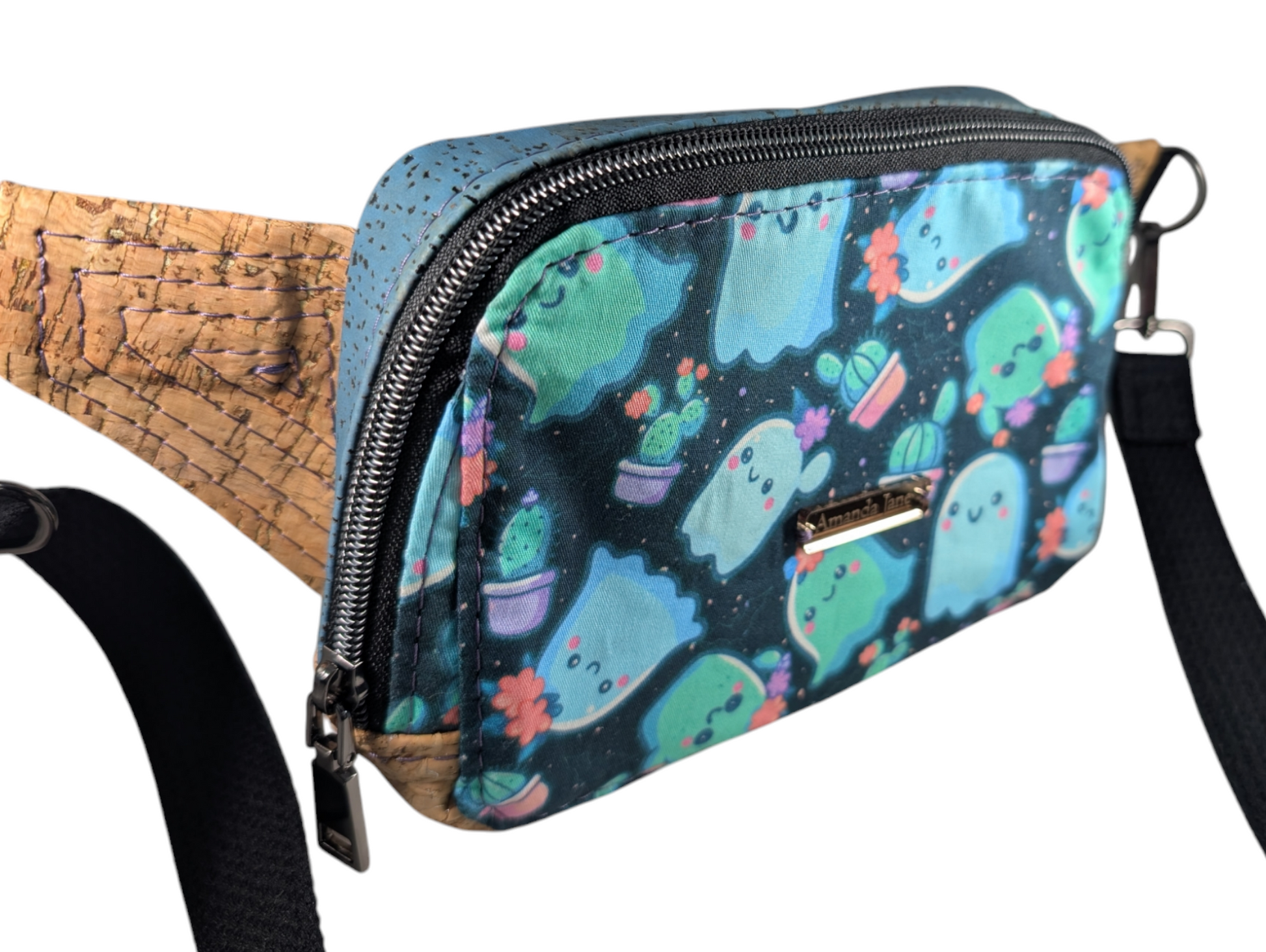 The exterior is made with a custom print that has cute ghosts and plants on it. There is also a matching natural and blue cork on the exterior. There is a zippered pocket on the back (facing your back). The strap is adjustable and can be removed and replaced if you feel inclined to change it. The interior has a black waterproof canvas.