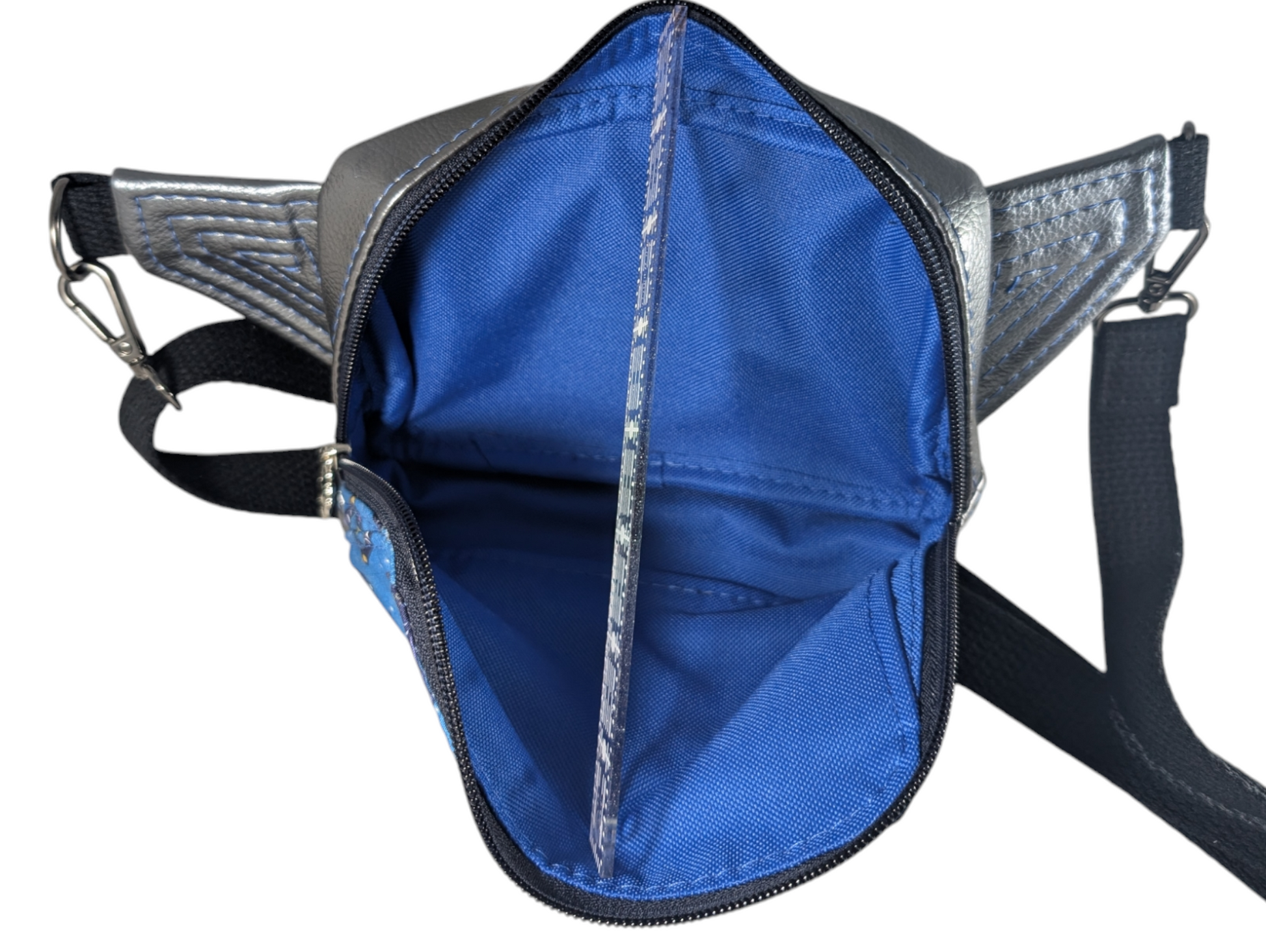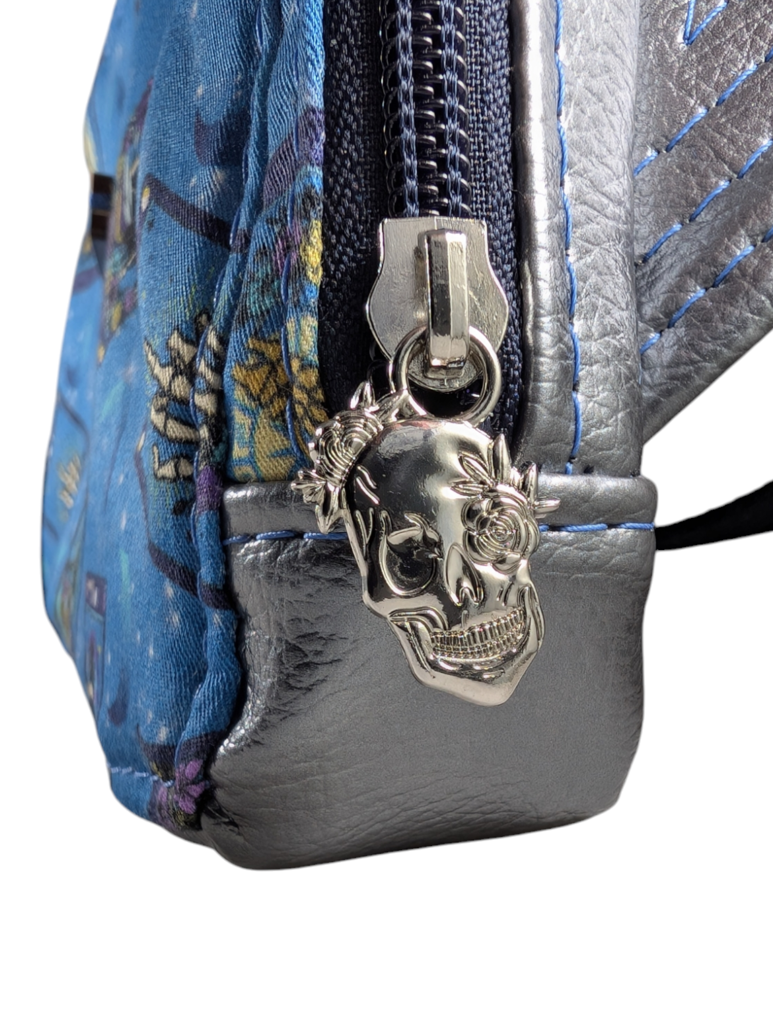 The exterior is made with a custom print that has skulls on tarot cards on it. There is also a matching textured silver vinyl on the exterior. There is a zippered pocket on the back (facing your back). The strap is adjustable and can be removed and replaced if you feel inclined to change it. The interior has a black and white chevron design waterproof canvas.