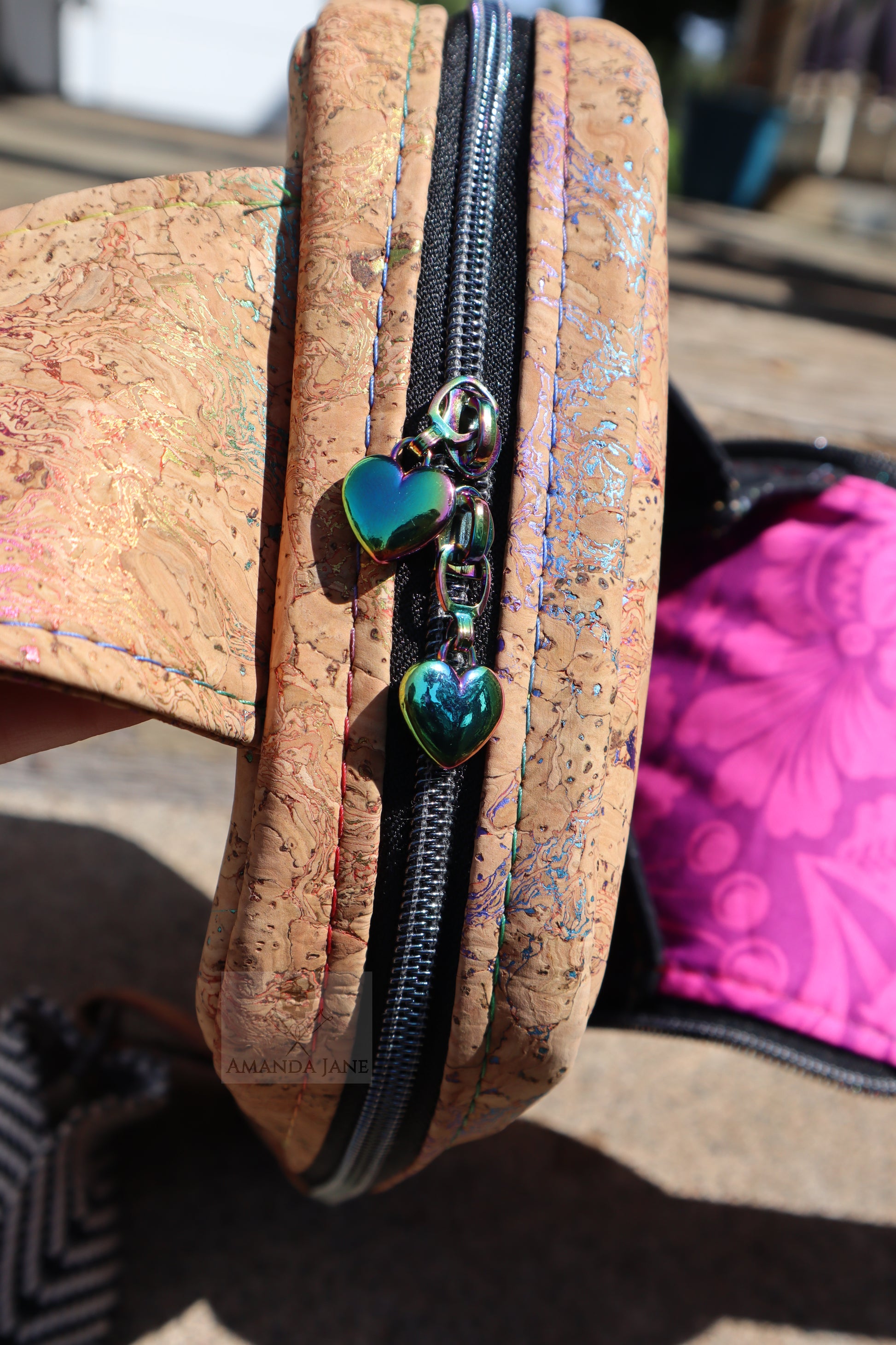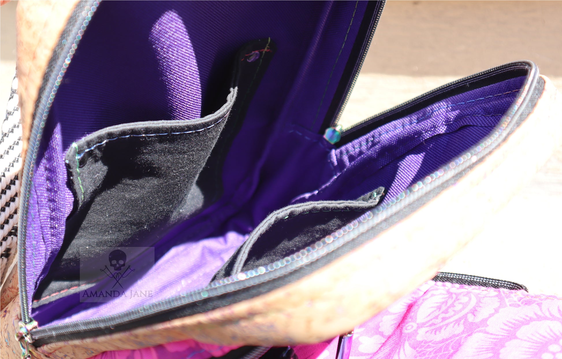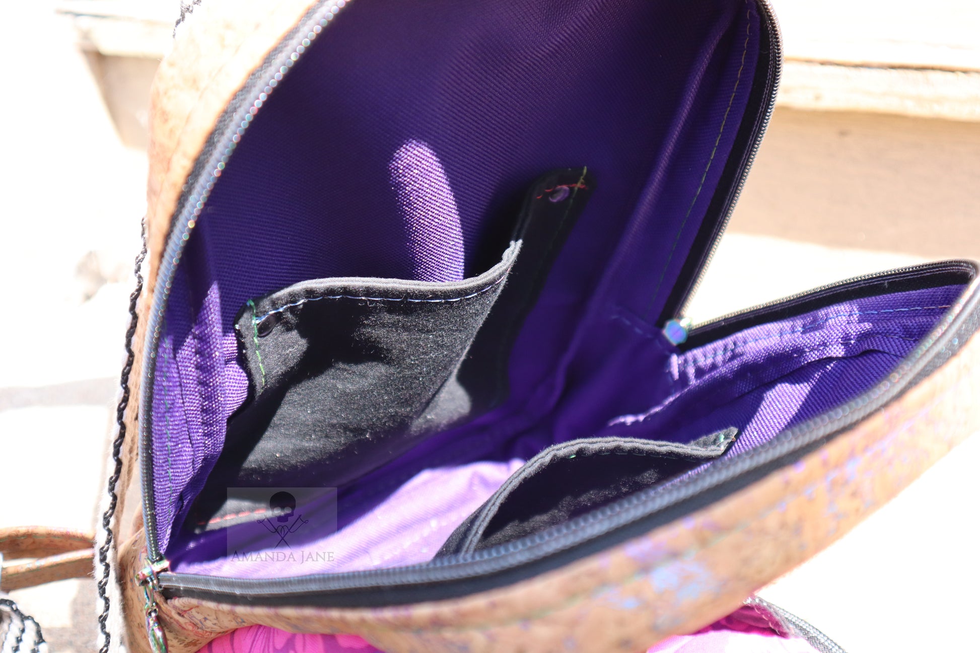 Lots of love and time was put into this sling! The exterior front is made with designer fabric by Tula Pink. The gusset and back is made with high quality rainbow Spanish cork.. The 1.5" wide strap is adjustable. The interior has purple waterproof canvas. There are also two slip pocket on the inside main compartment. The front zippered compartment has a zipper pocket and slip pocket. The two zipper pulls on the front are pink gems and are gunmetal colored. The two zipper pulls for the main compartment are rainbow hearts.