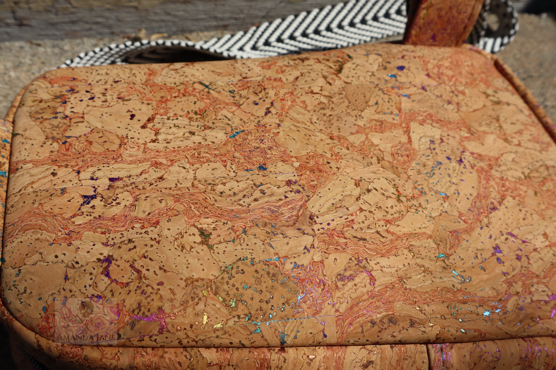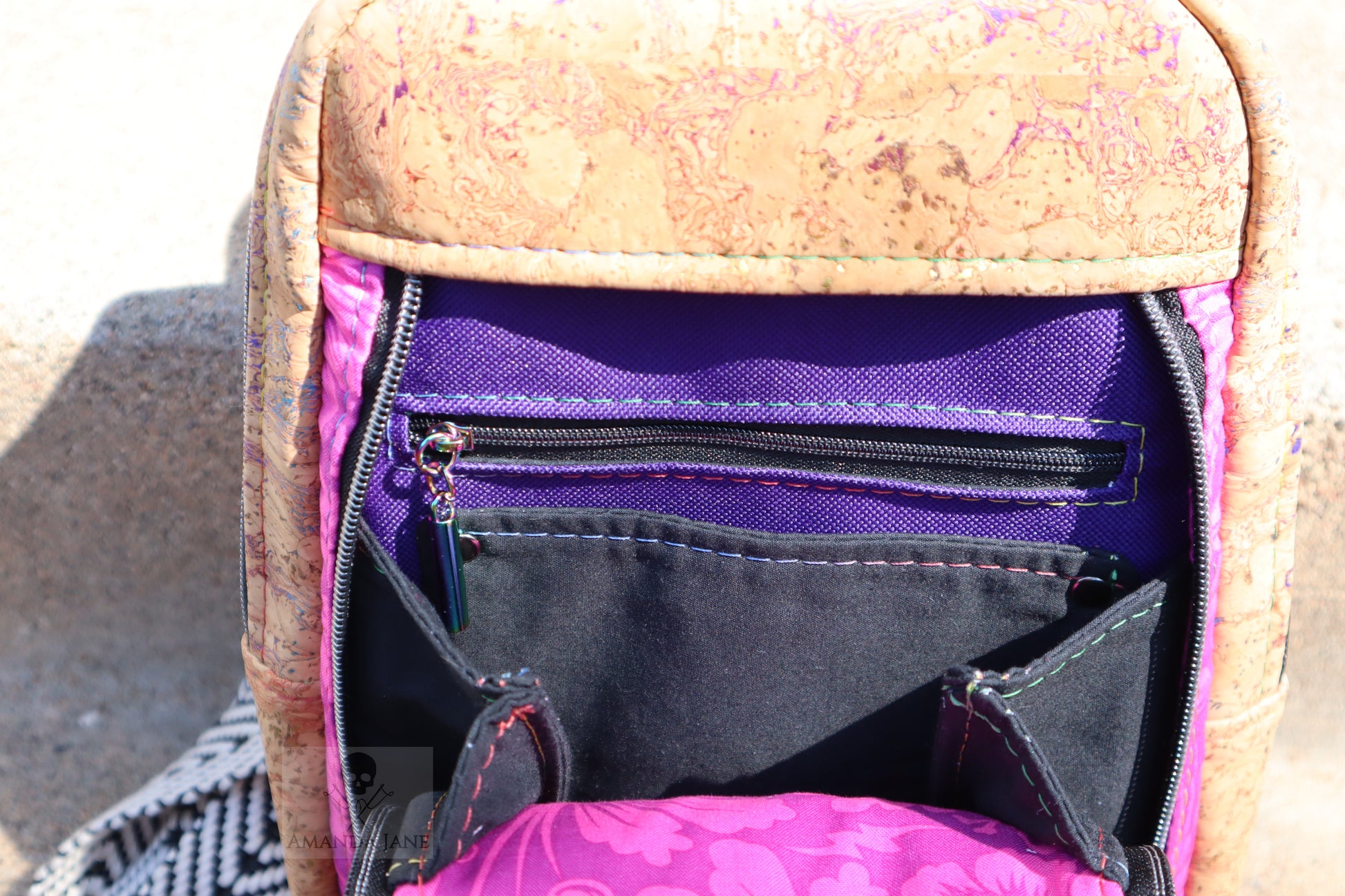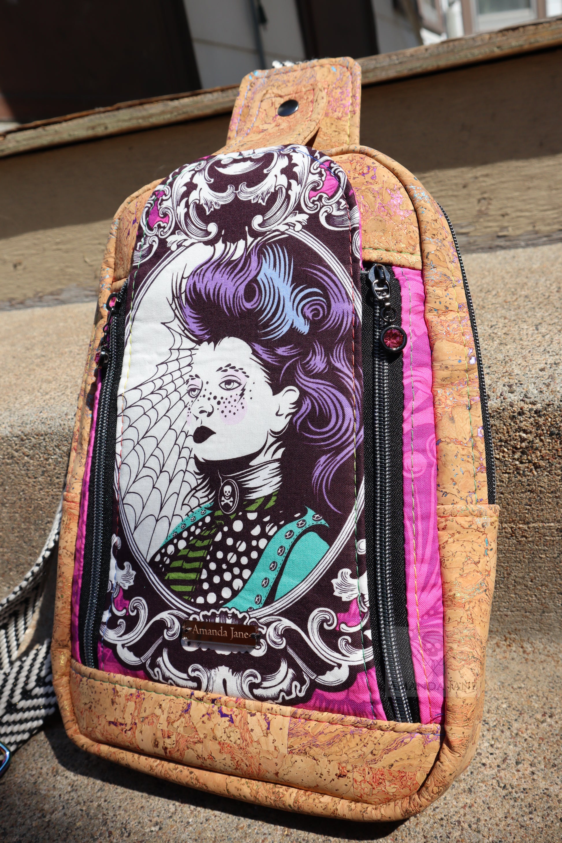 Lots of love and time was put into this sling! The exterior front is made with designer fabric by Tula Pink. The gusset and back is made with high quality rainbow Spanish cork.. The 1.5" wide strap is adjustable. The interior has purple waterproof canvas. There are also two slip pocket on the inside main compartment. The front zippered compartment has a zipper pocket and slip pocket. The two zipper pulls on the front are pink gems and are gunmetal colored. The two zipper pulls for the main compartment are rainbow hearts.