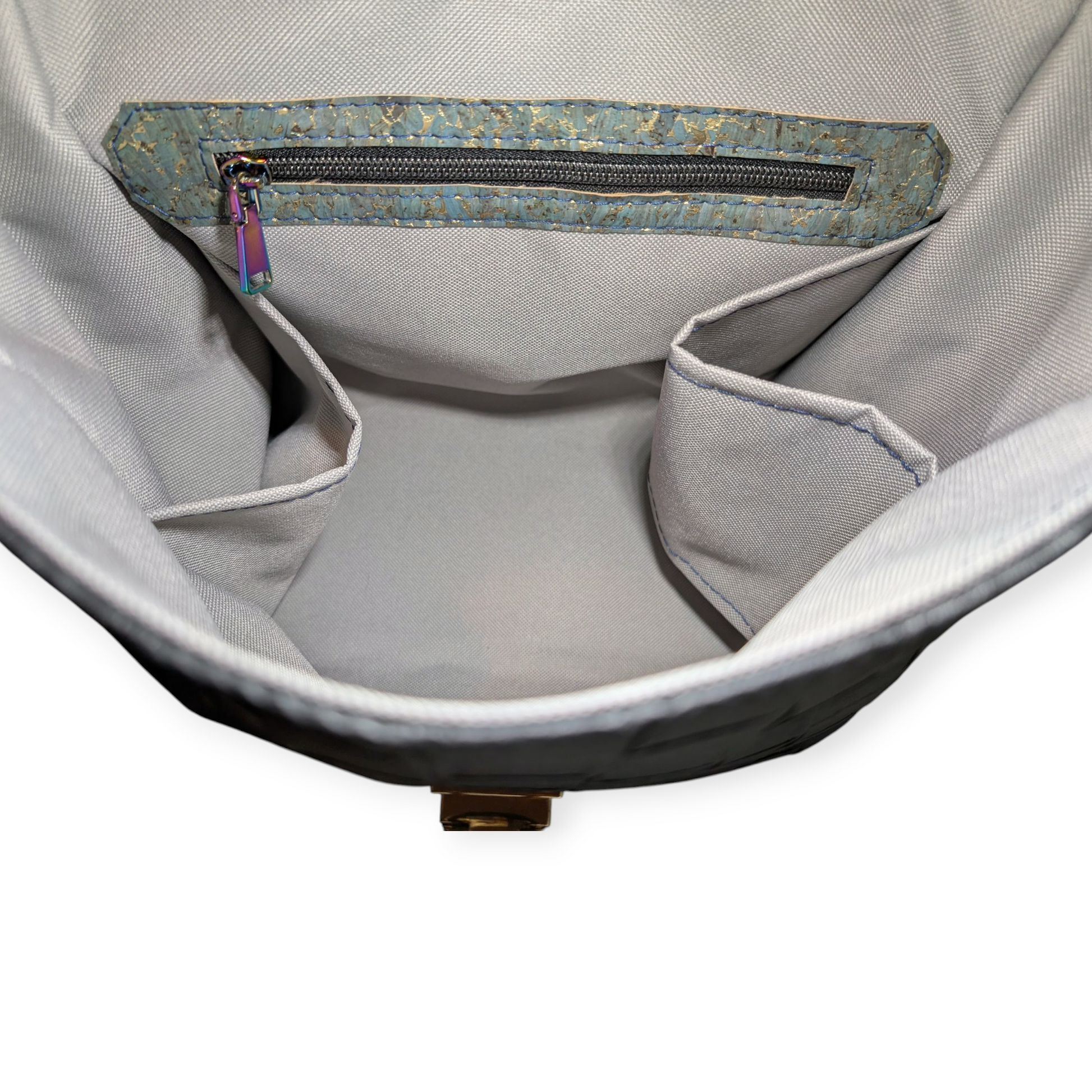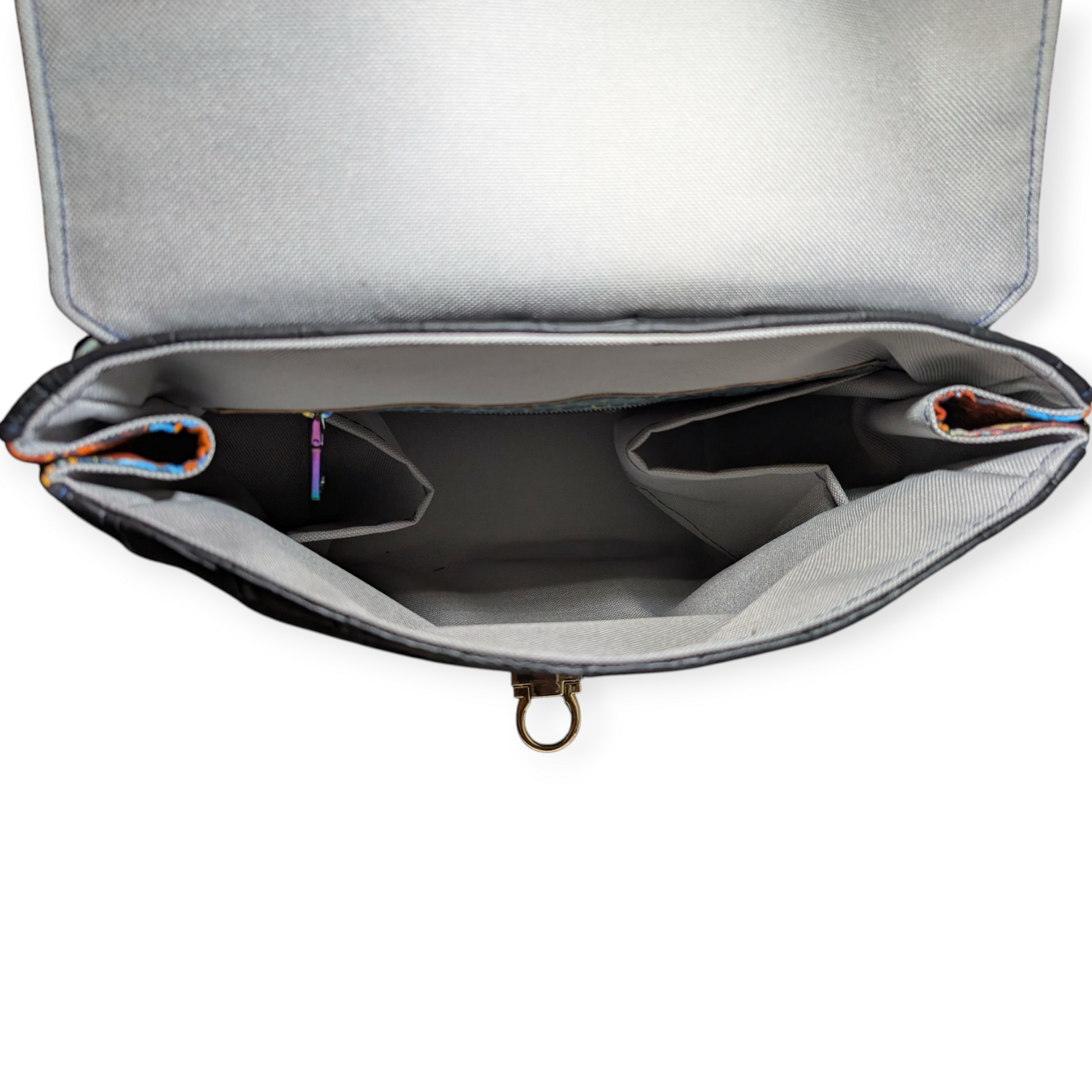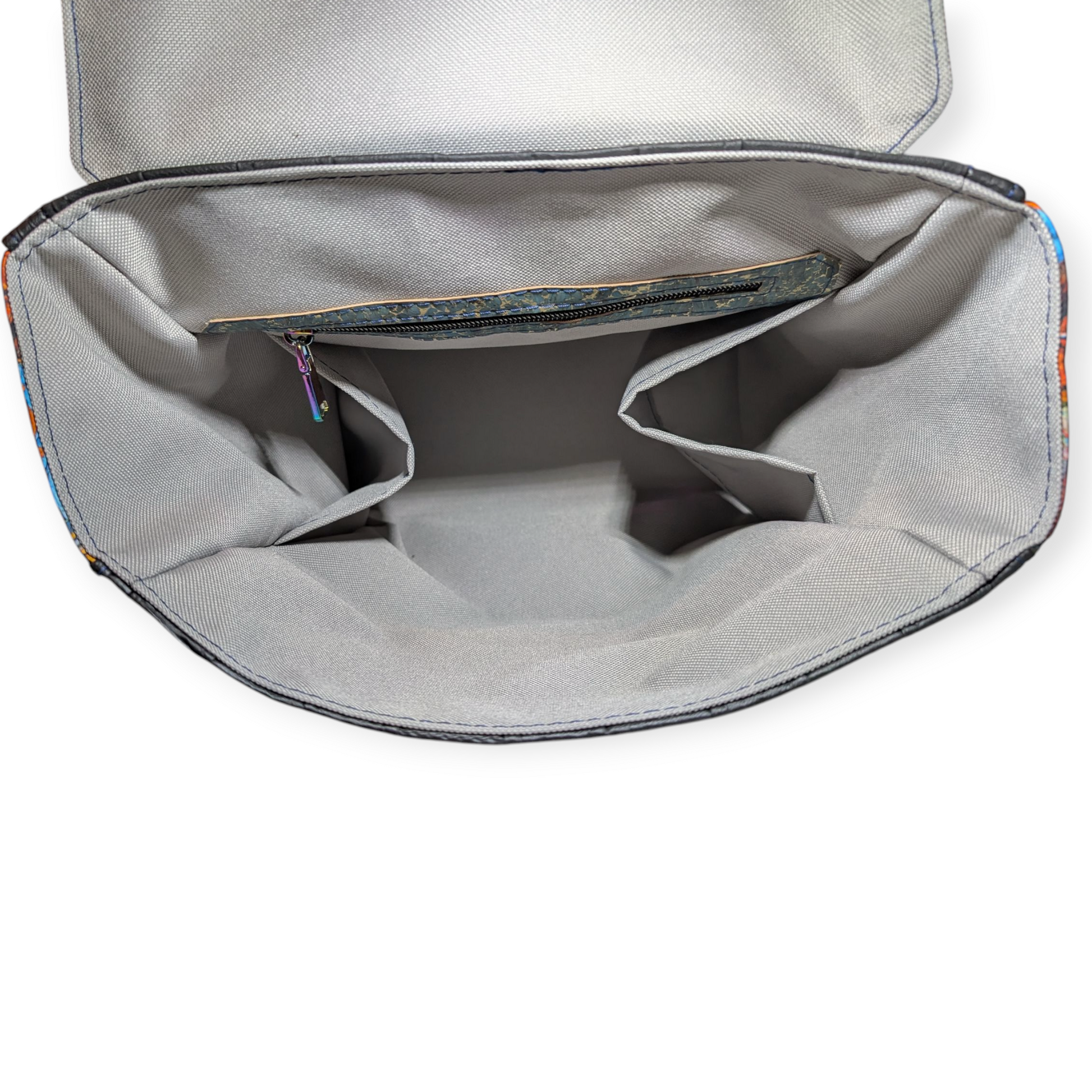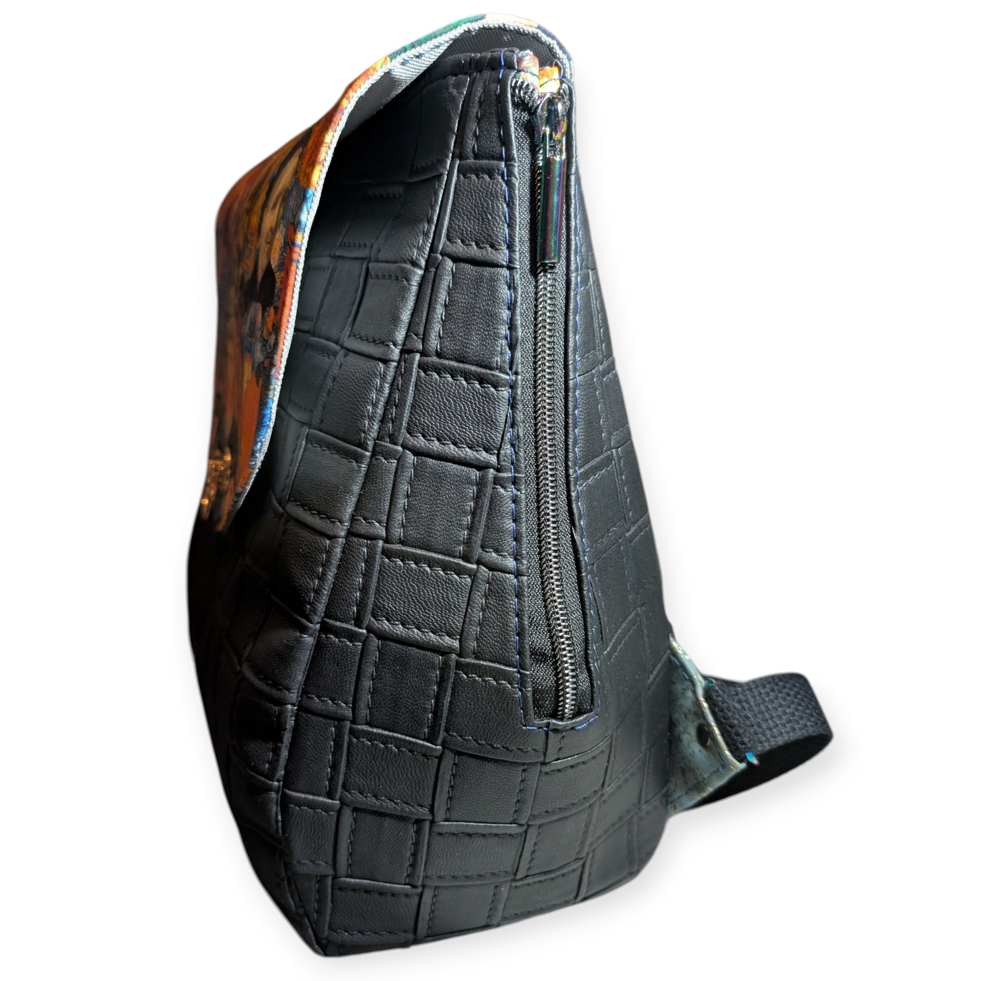 Lots of love and time was put into this sling! The exterior front flap is made with custom fabric that has a Van Gogh collage design on it. The main exterior is made with a black patchwork textured vinyl. The interior has grey waterproof canvas. On in the inside, there is one slip pocket, one water bottle holder, and one zippered pocket. On the exterior back, there is a zippered pocket. The exterior has two zippered parts where you can expand the backpack.