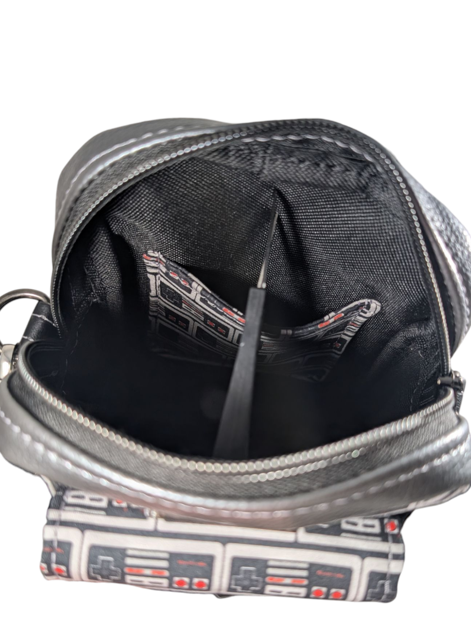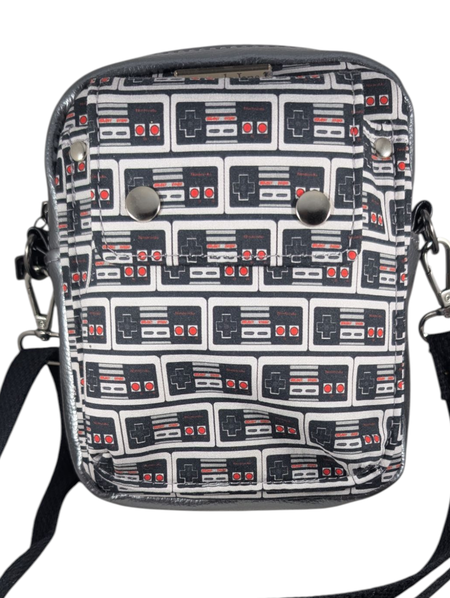Lots of love and time was put into this purse! It has a custom video game controller design on the front flap. It also is made with textured grey vinyl. It has a black waterproof canvas lining on the inside. There is an exterior front pocket that closes with 2 snaps on a flap. This pocket would be perfect for your phone! Peep the zipper pull! There is a slip pocket located on the inside of one side and a slip pocket on the other side.