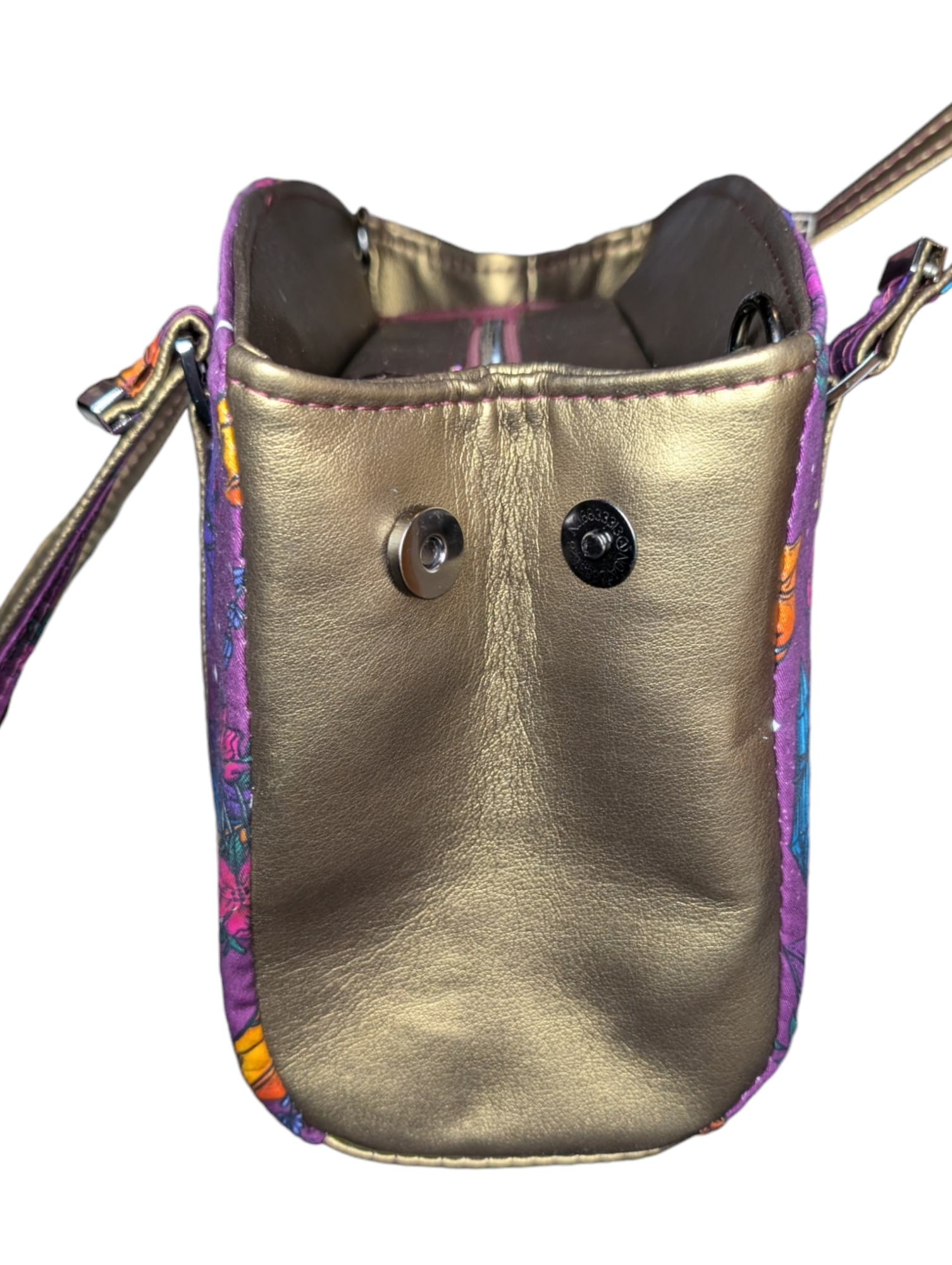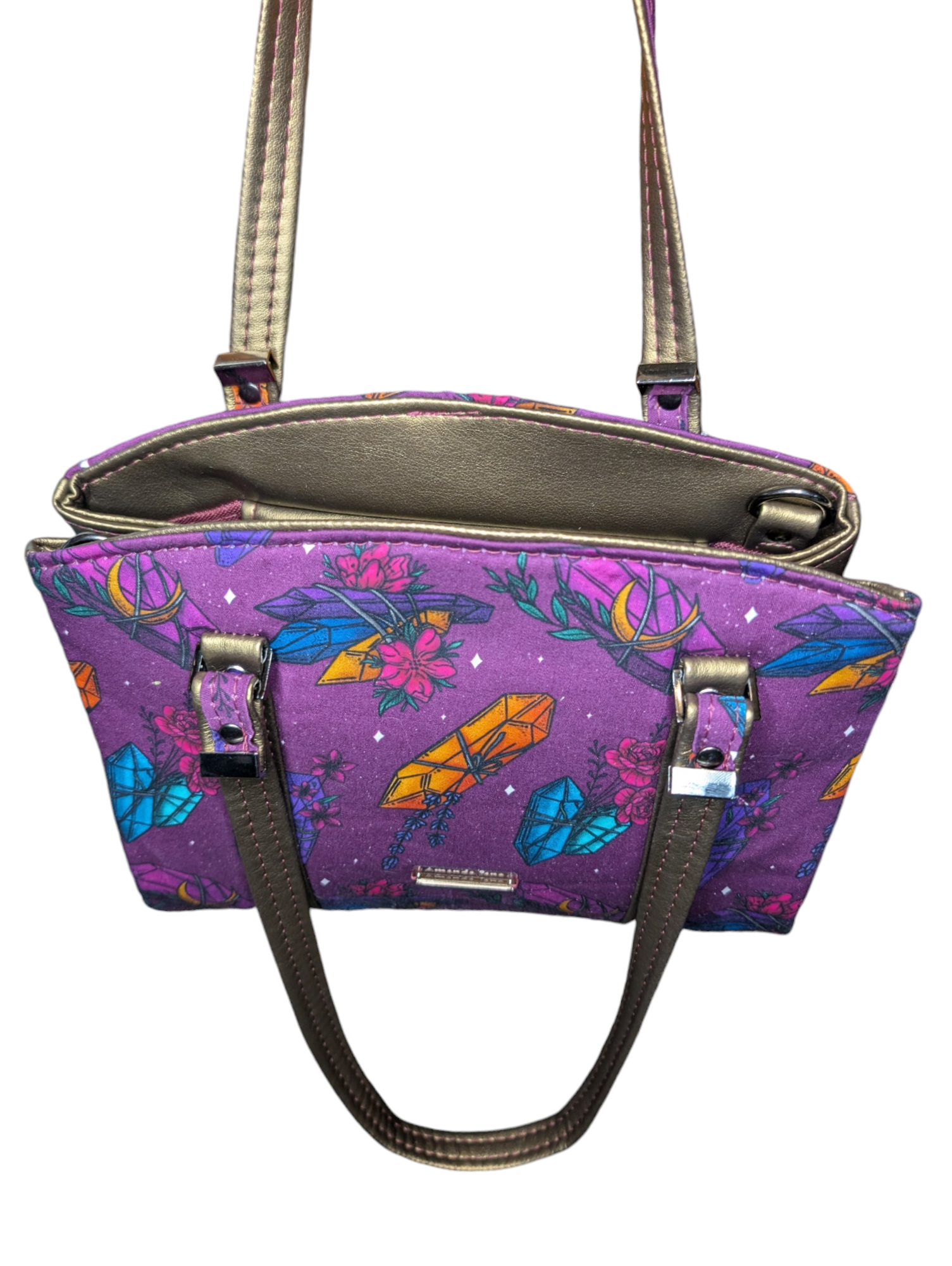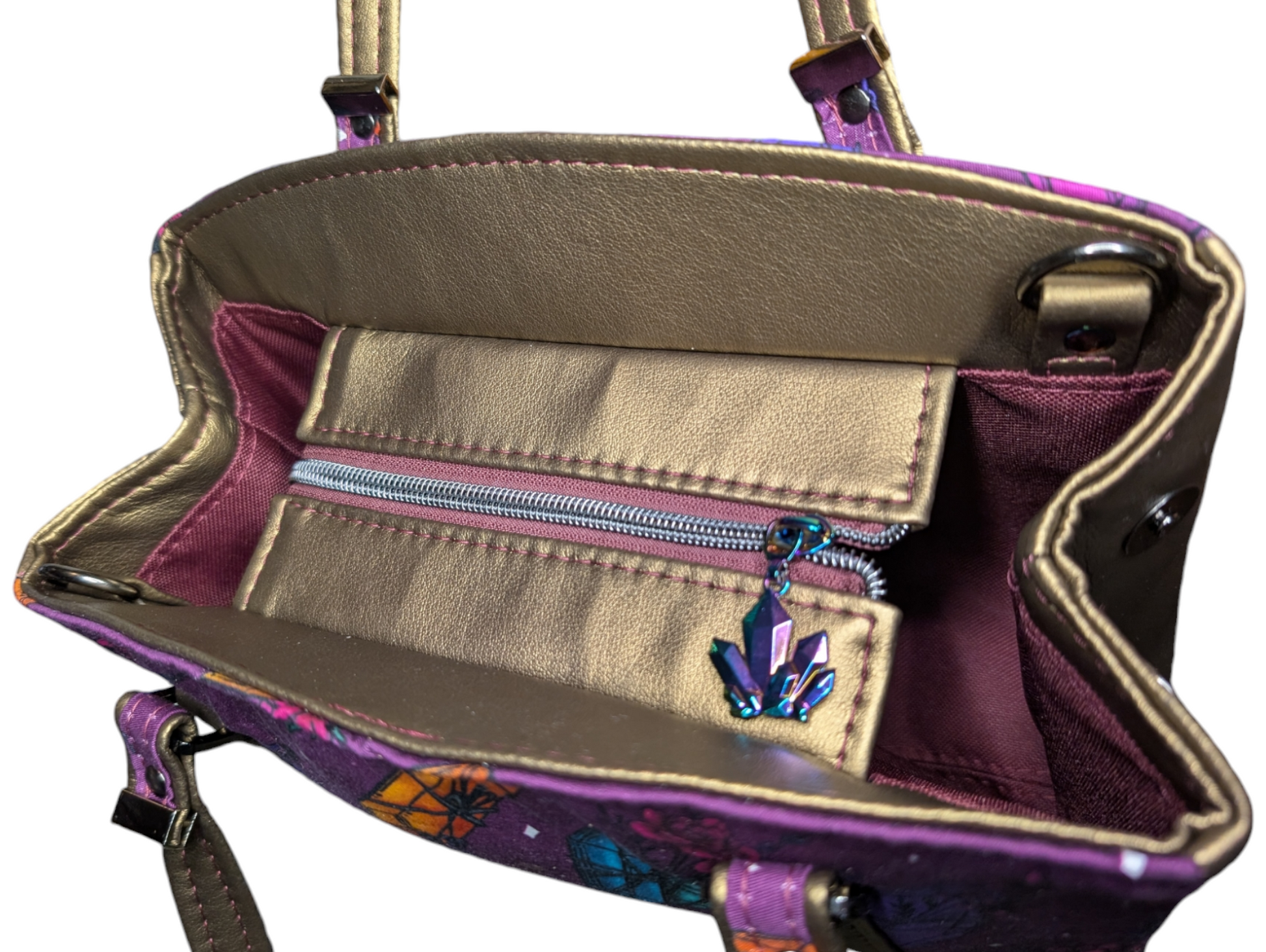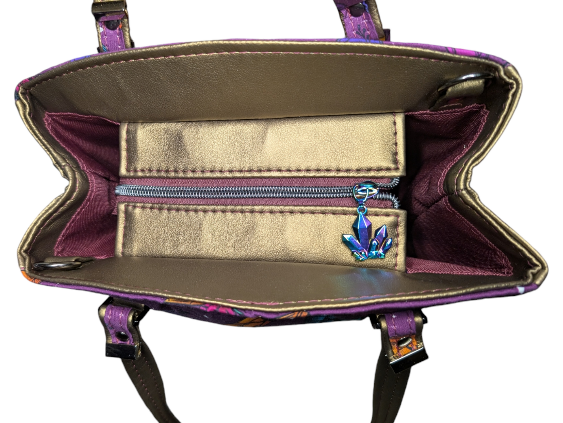 Lots of love and time was put into this purse! It has an awesome custom print with crystals and flowers with a bronze colored vinyl sides, handles, and bottom. All fabric has been interfaced with woven fabric and/or foam backing for stability. It has a cranberry colored waterproof canvas lining on the inside. There is also a slip pocket on the inside of the purse. The sides are closed with magnetic snaps and the top has a recessed zipper.