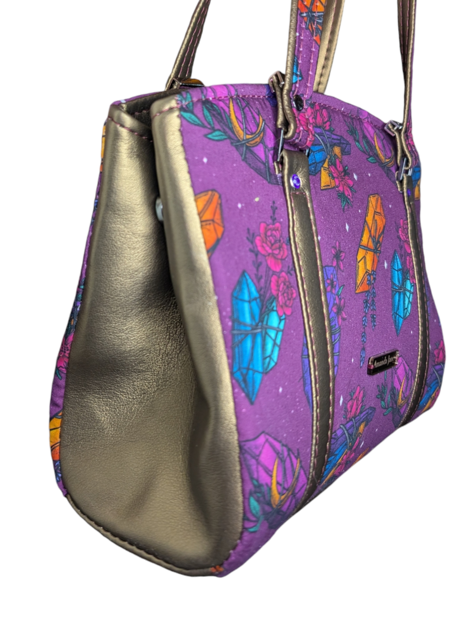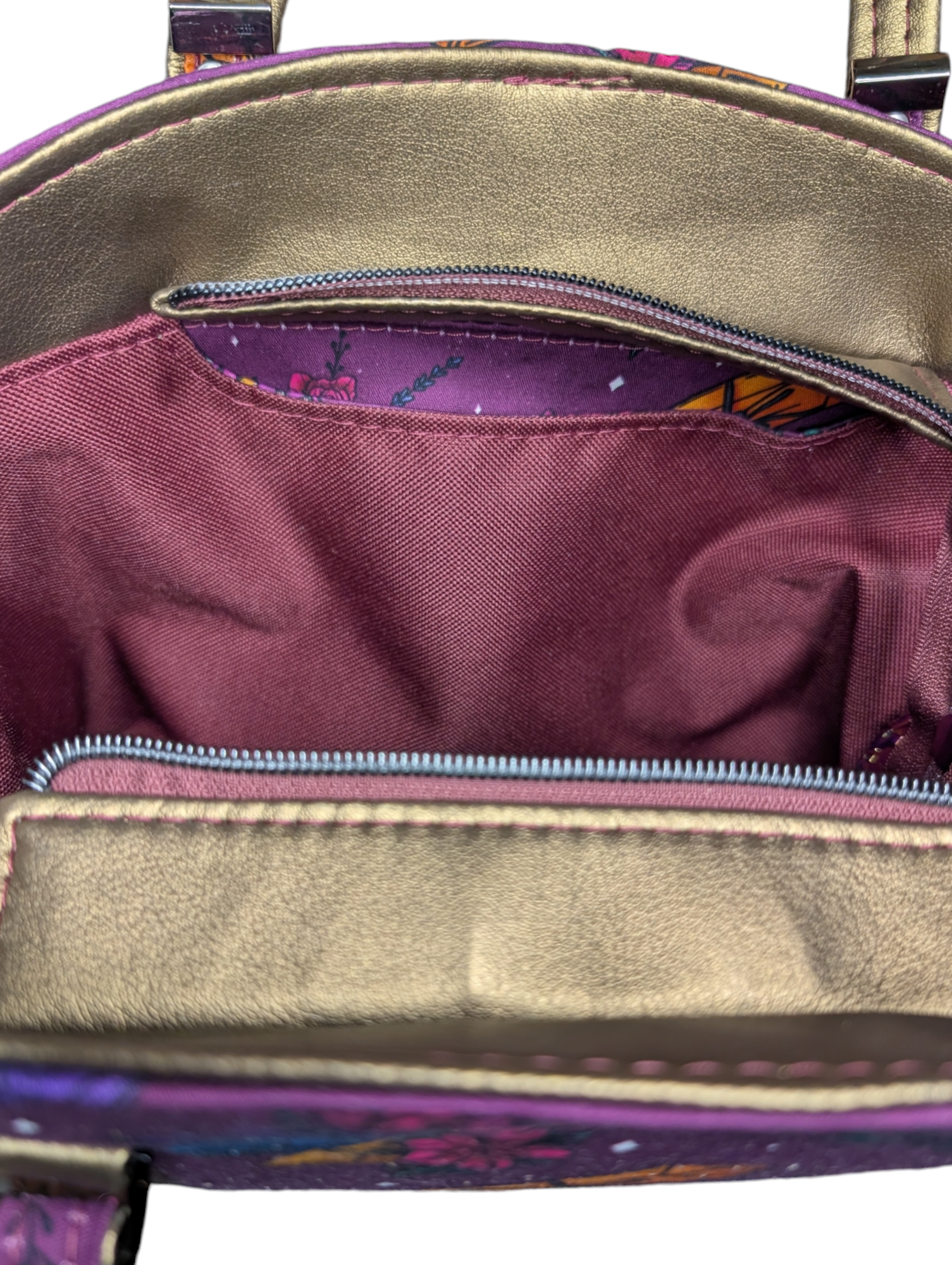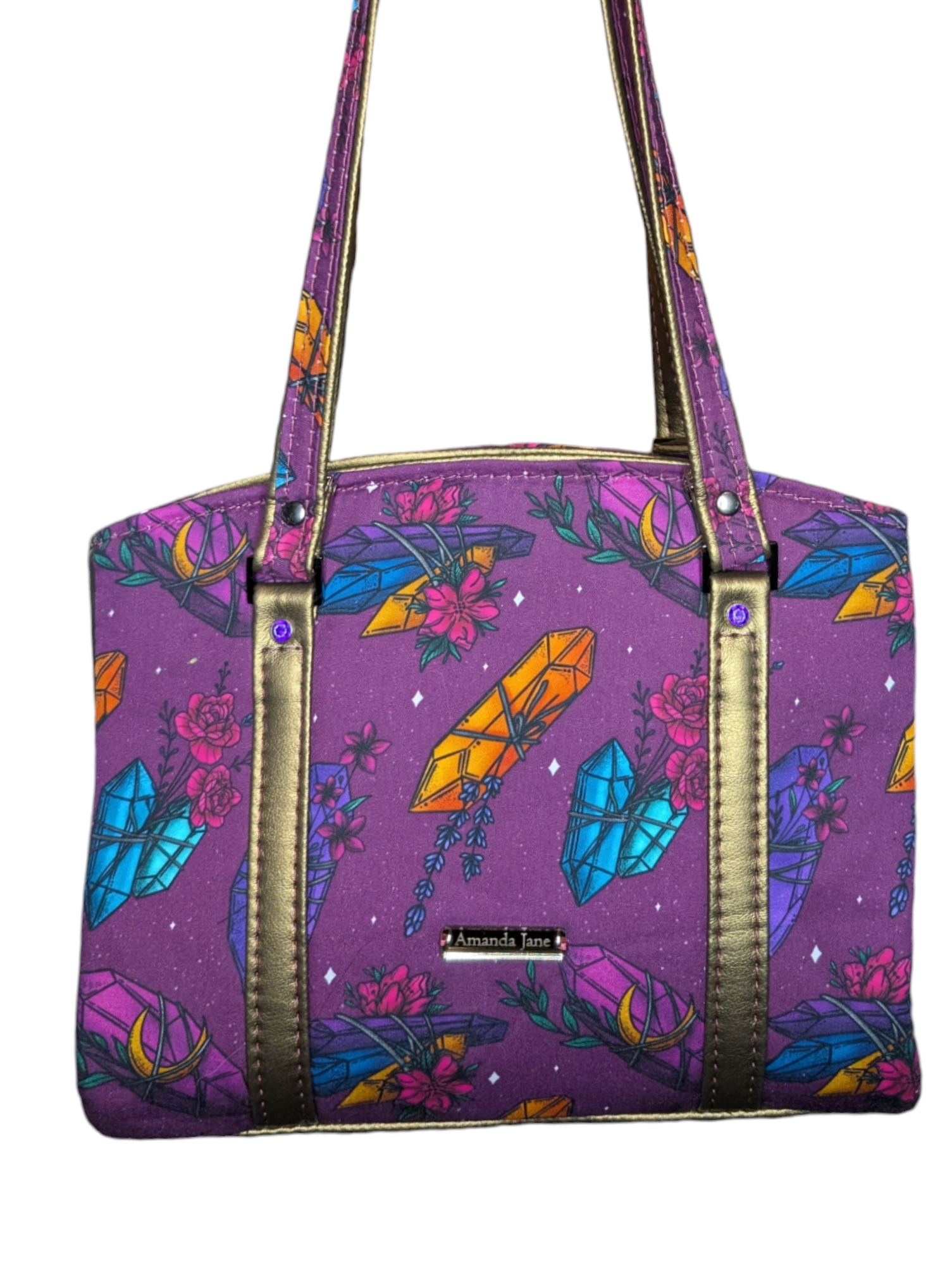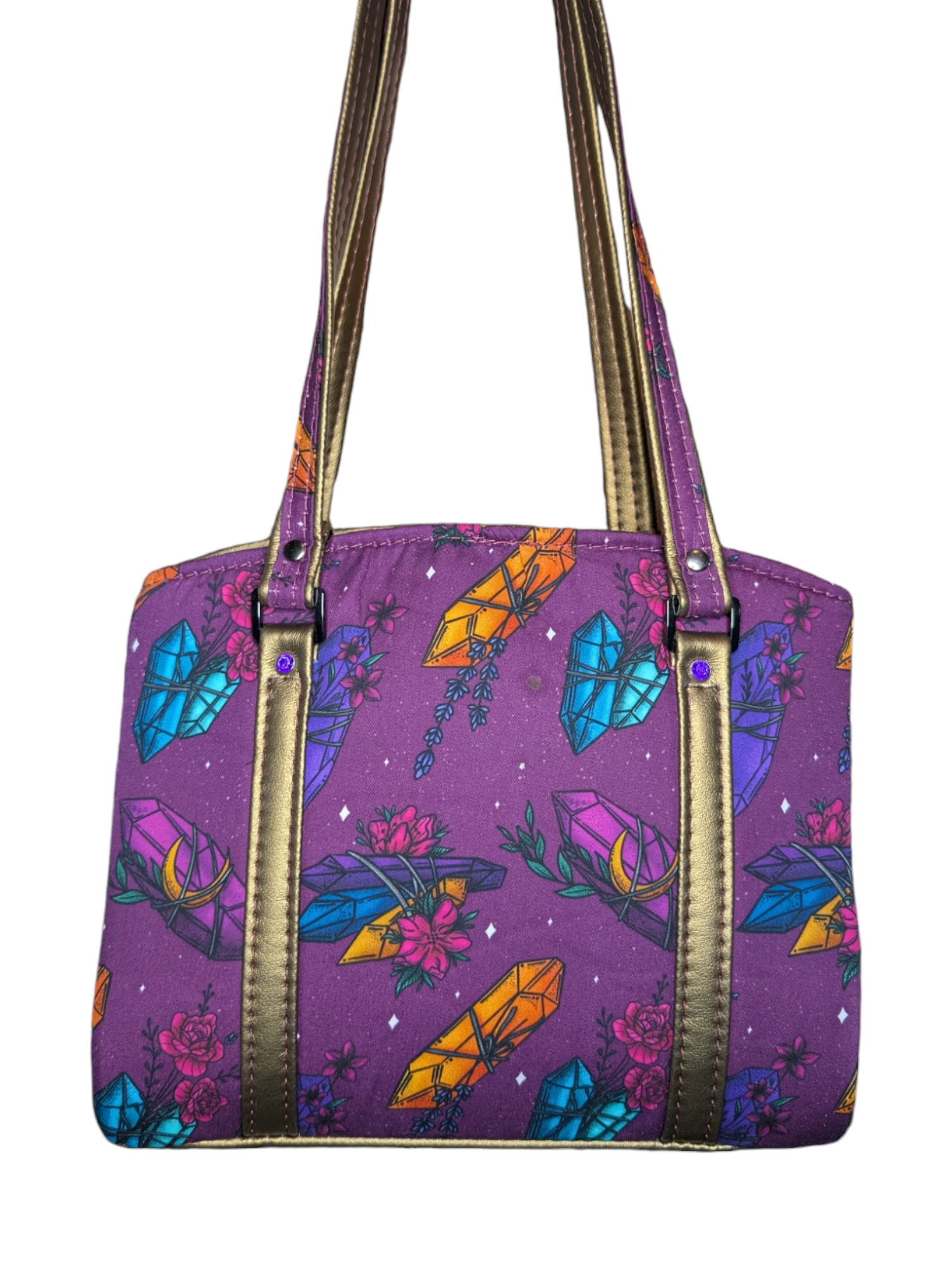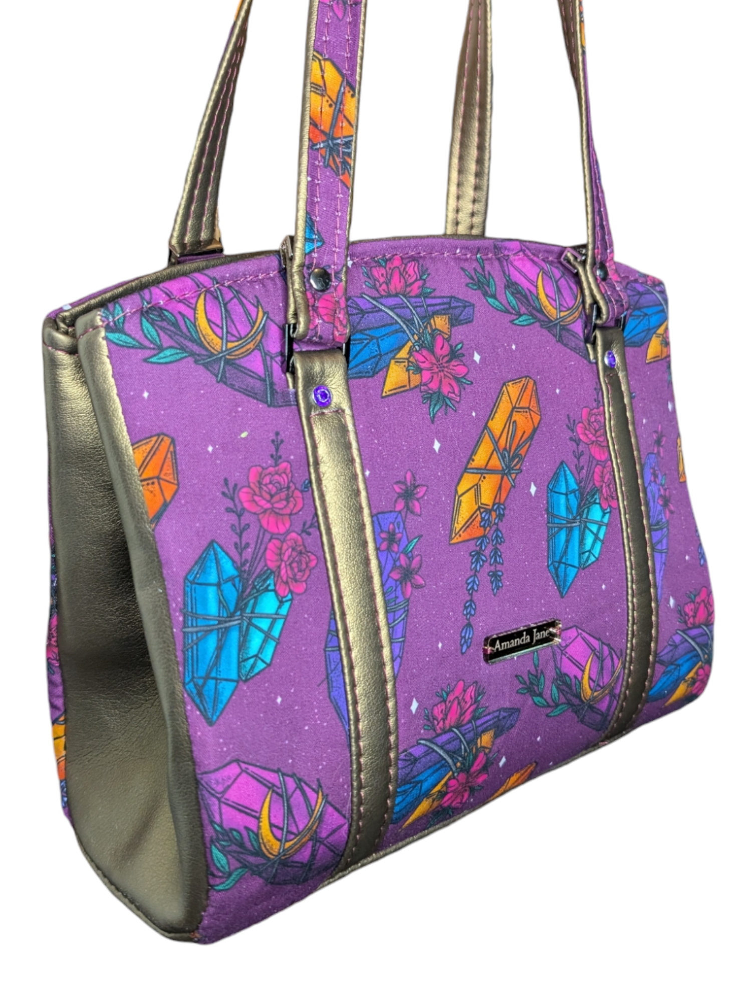 Lots of love and time was put into this purse! It has an awesome custom print with crystals and flowers with a bronze colored vinyl sides, handles, and bottom. All fabric has been interfaced with woven fabric and/or foam backing for stability. It has a cranberry colored waterproof canvas lining on the inside. There is also a slip pocket on the inside of the purse. The sides are closed with magnetic snaps and the top has a recessed zipper.