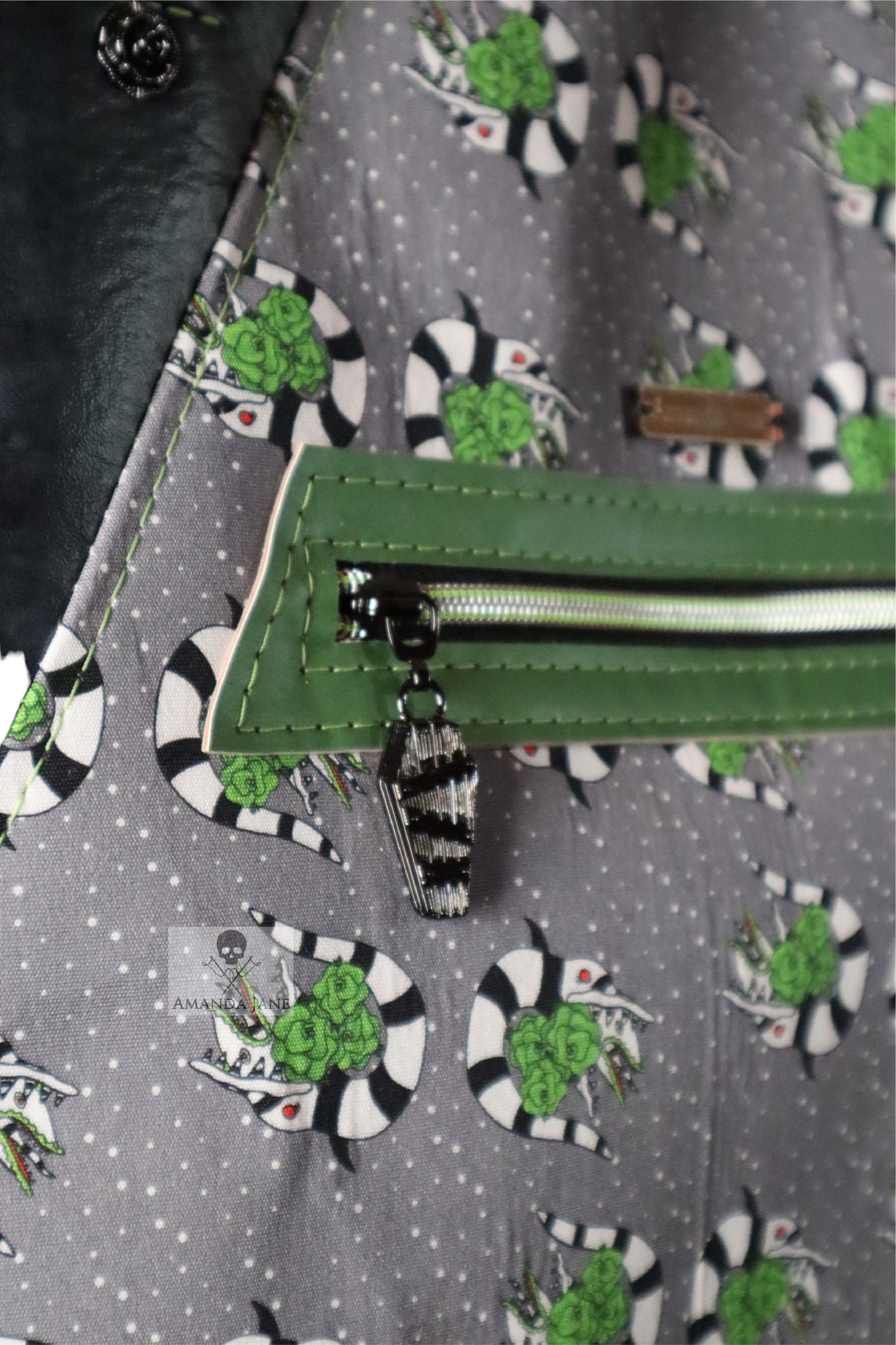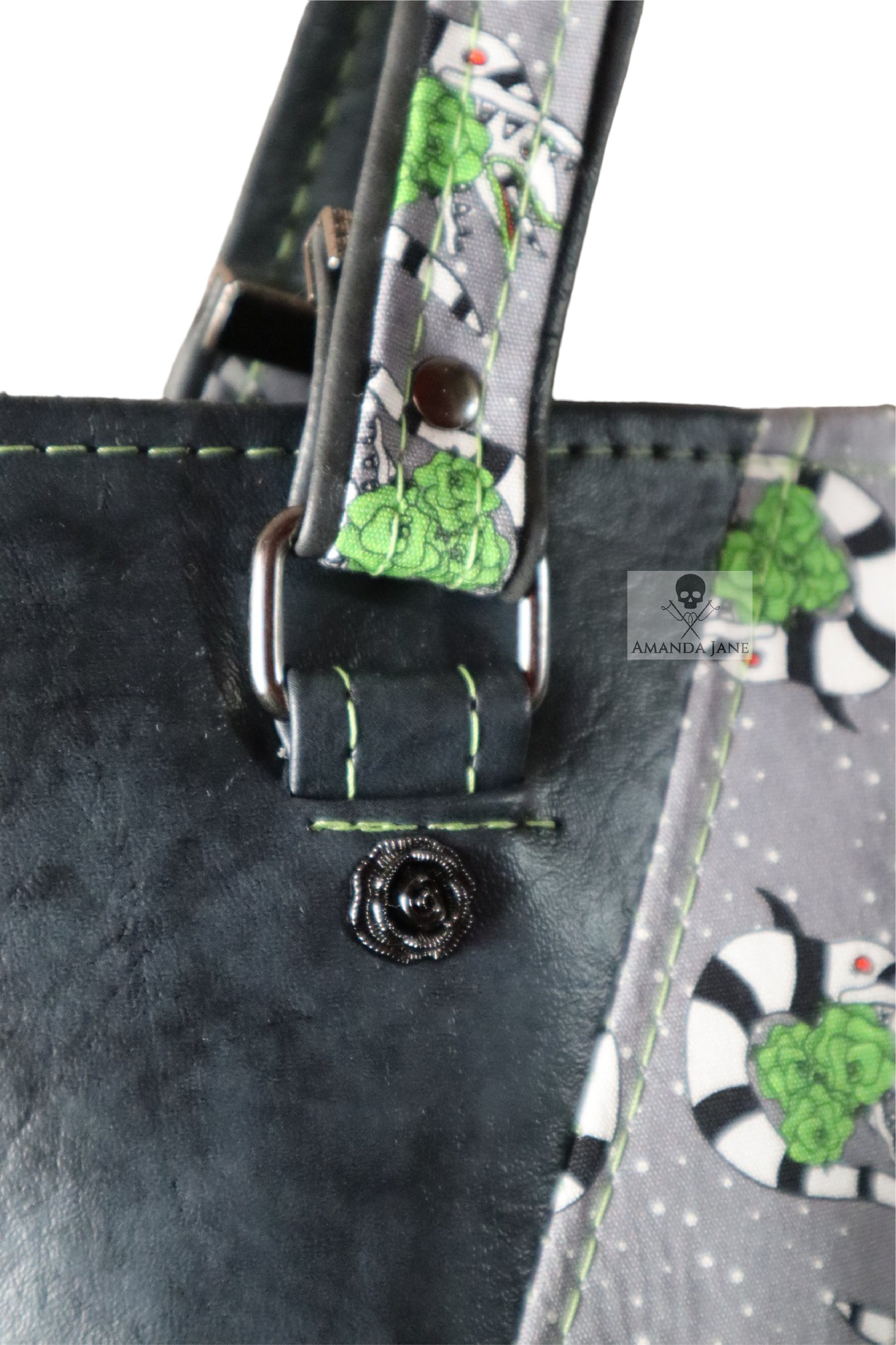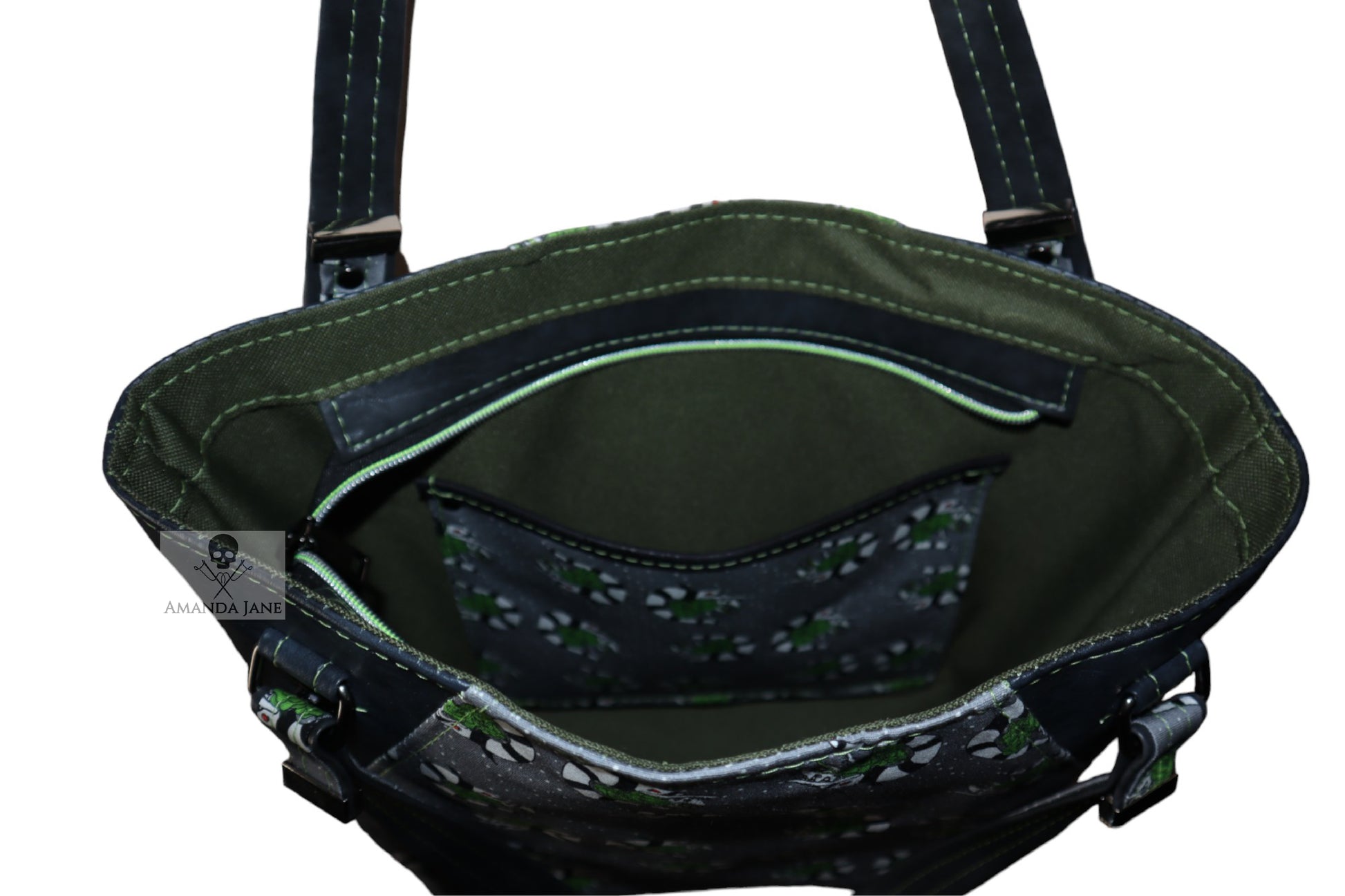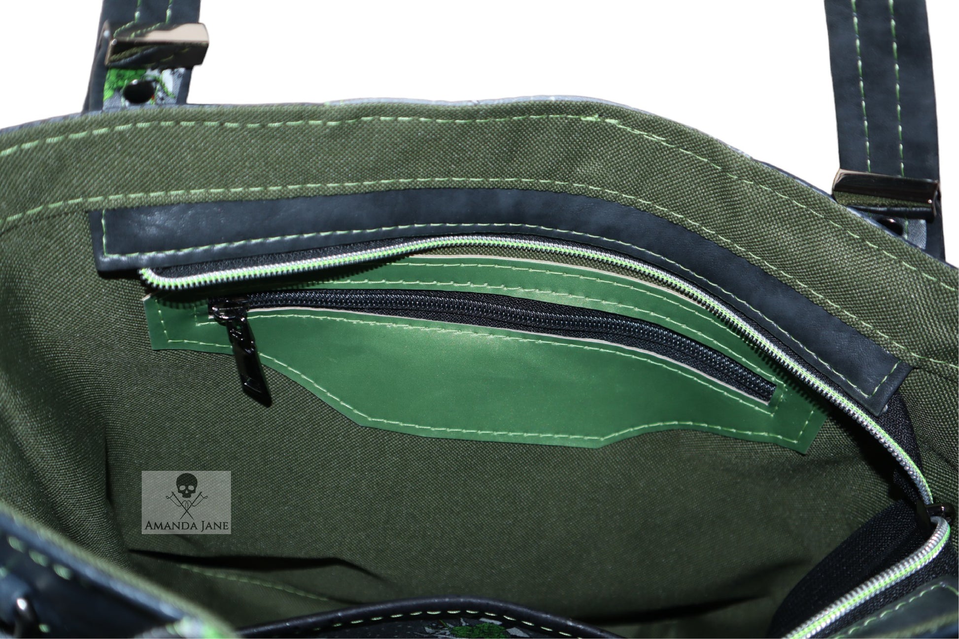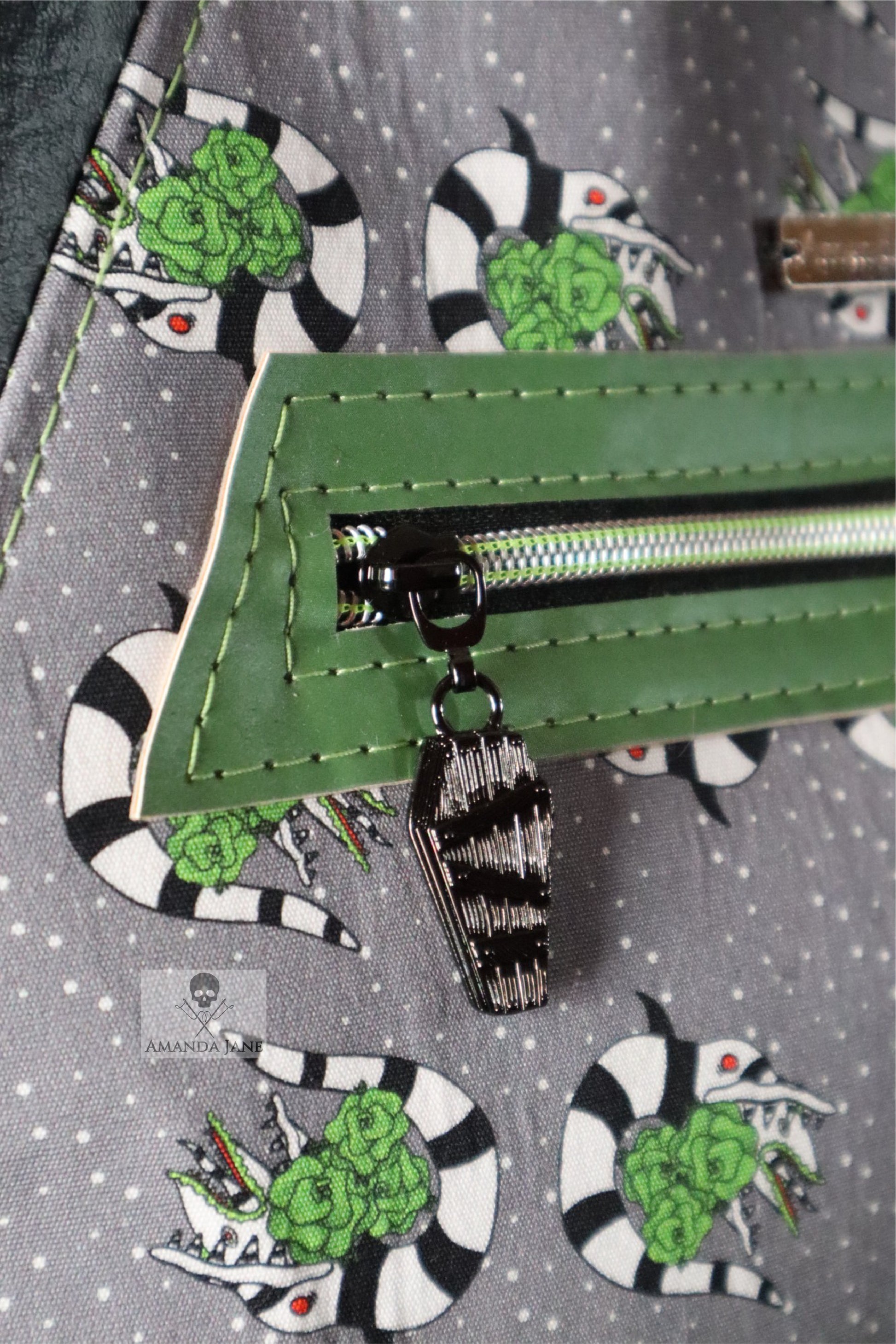 Lots of love and time was put into this purse! It has a beautiful custom printed fabric with sand worms from that beetle guy movie on it and green flowers. There is also a dark grey marble vinyl on the exterior and handles. Handles have been reinforced with gunmetal colored floral Chicago screws for strength. All fabric (besides the vinyl) has been interfaced with woven fabric and foam for stability. It has a dark green waterproof canvas lining on the inside. There is an exterior front zipper pocket. Peep the zipper pull! There is a zipper pocket located on the inside of one side and a slip pocket on the other side.