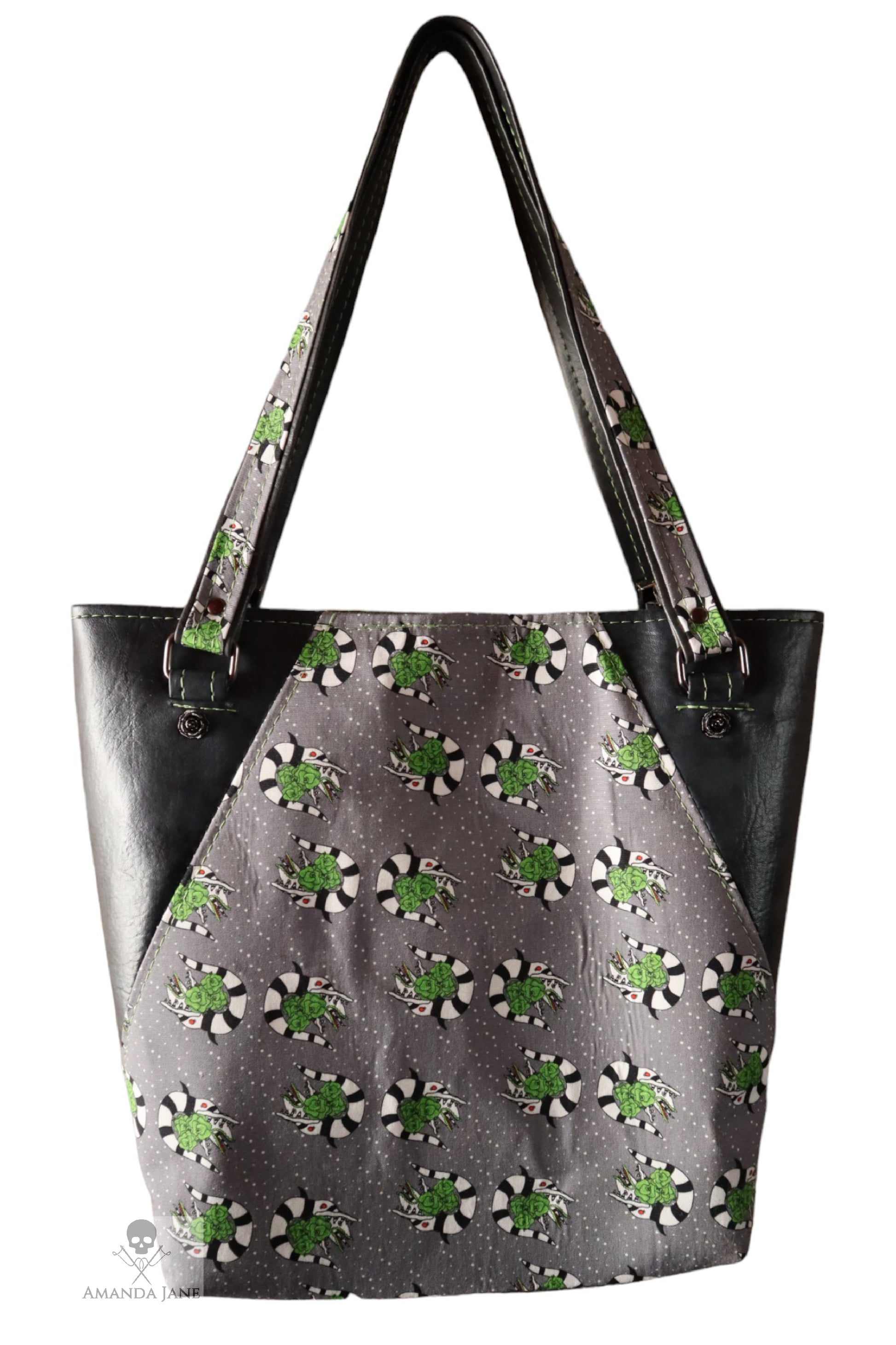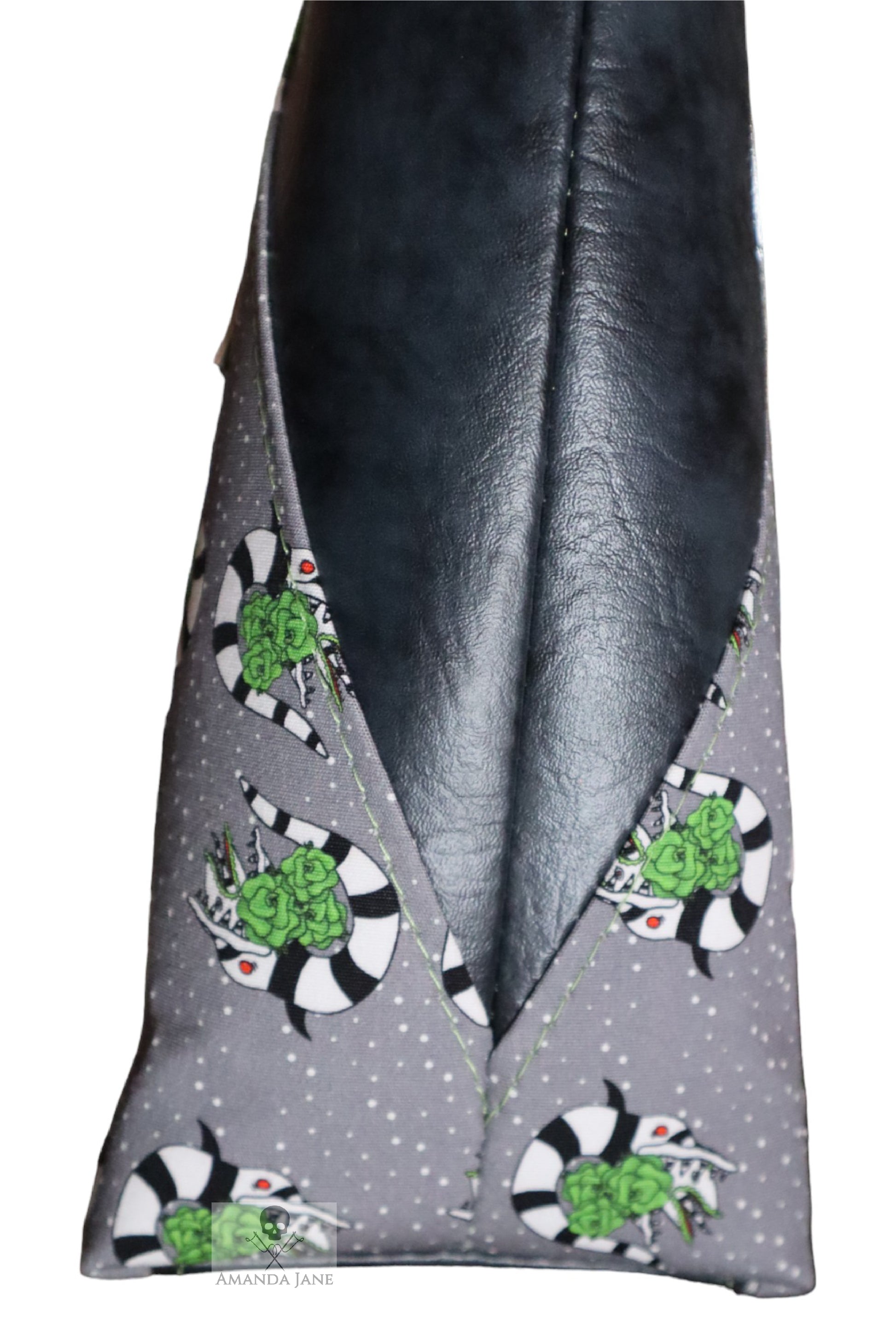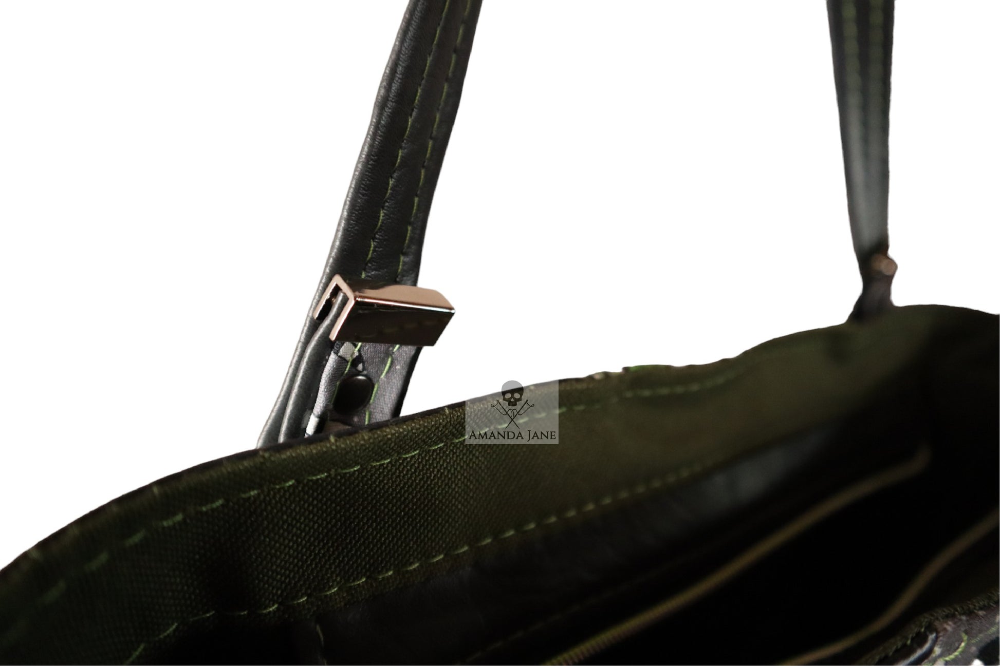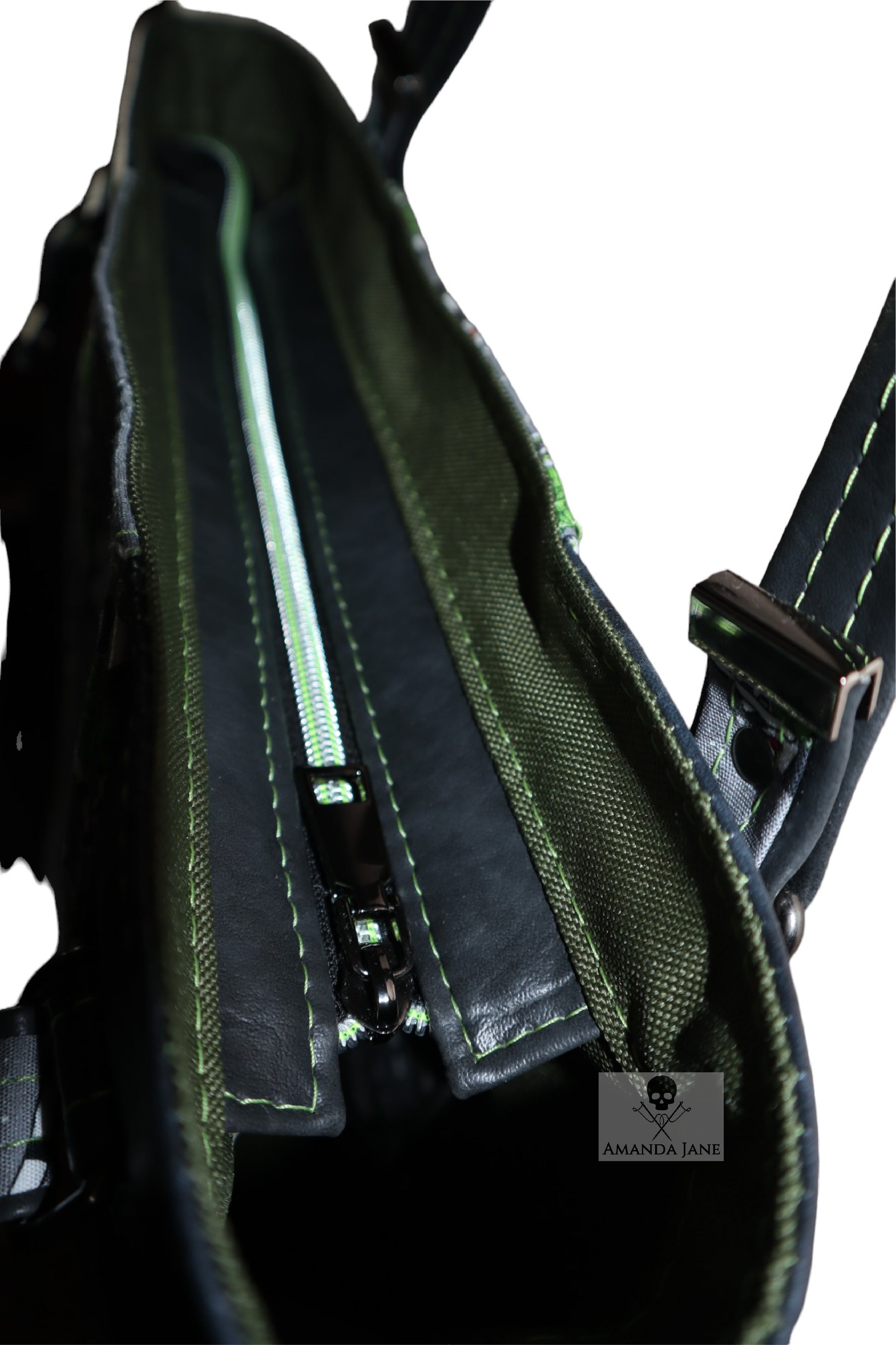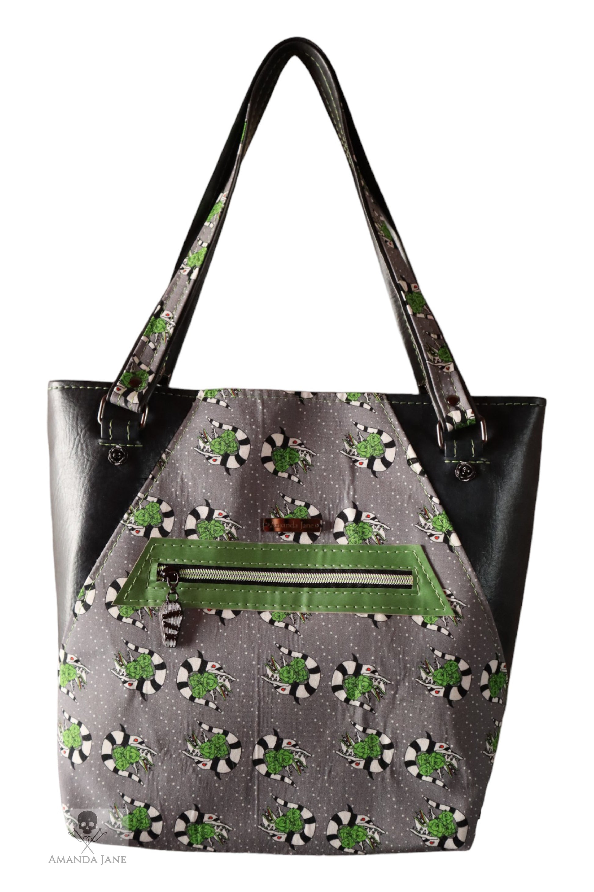 Lots of love and time was put into this purse! It has a beautiful custom printed fabric with sand worms from that beetle guy movie on it and green flowers. There is also a dark grey marble vinyl on the exterior and handles. Handles have been reinforced with gunmetal colored floral Chicago screws for strength. All fabric (besides the vinyl) has been interfaced with woven fabric and foam for stability. It has a dark green waterproof canvas lining on the inside. There is an exterior front zipper pocket. Peep the zipper pull! There is a zipper pocket located on the inside of one side and a slip pocket on the other side.