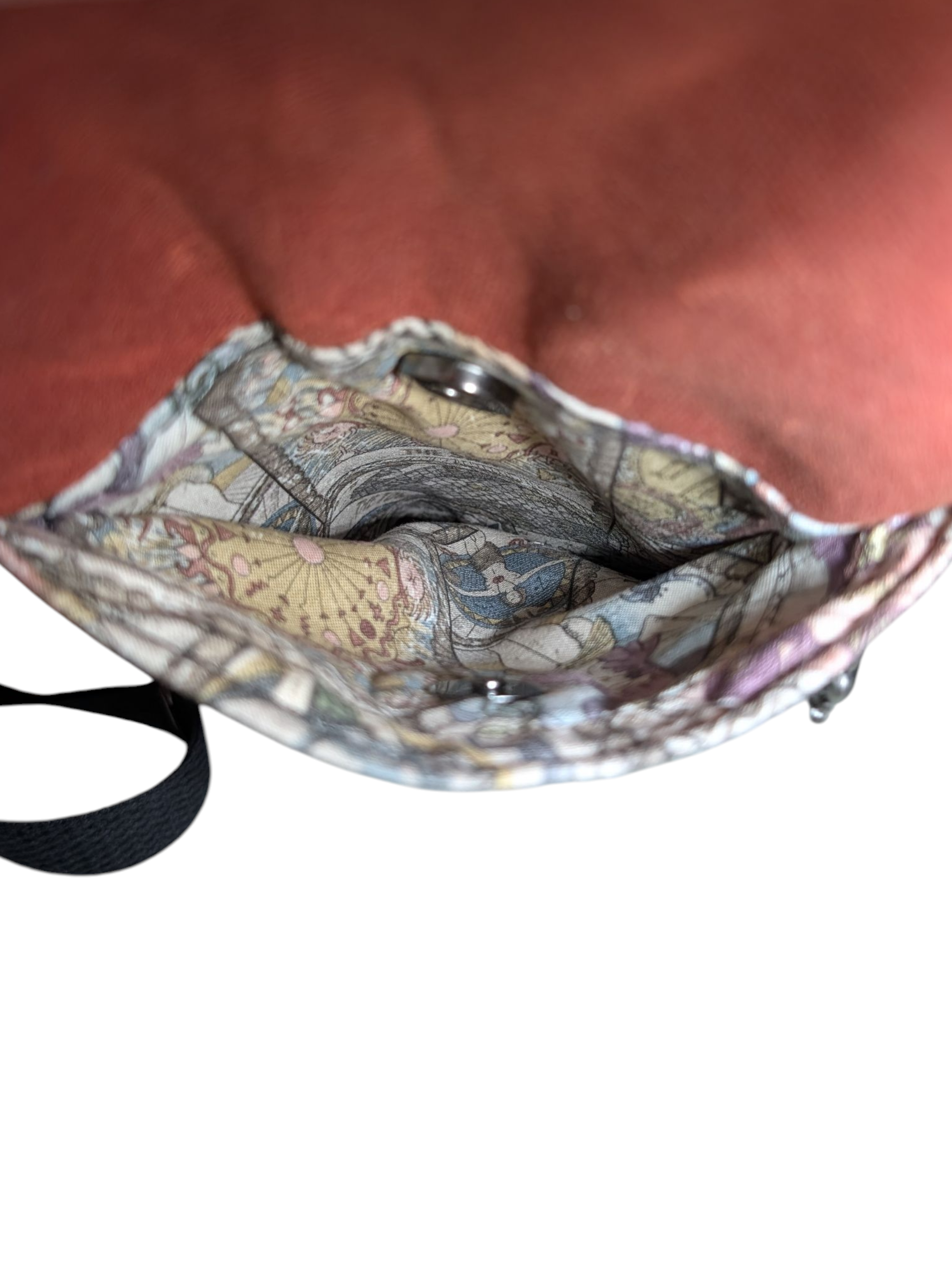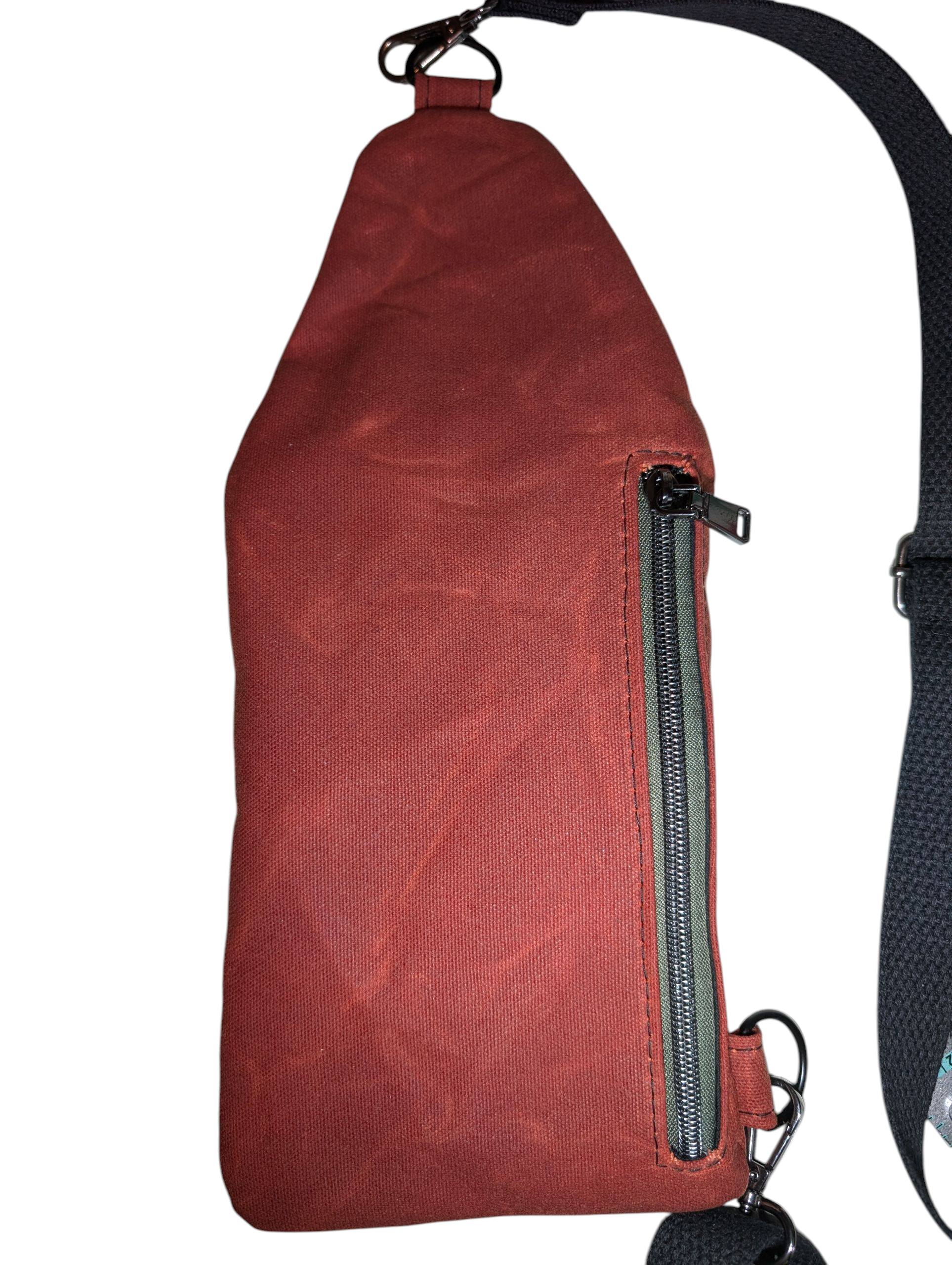 Lots of love and time was put into this sling! It has a beautiful tarot card design on the front. It also is made with a orange waxed canvas for the top, bottom, and back. There is an exterior front pocket and zip pocket that closes with a magnetic snap. There is also a back zippered pocket. This sling would be perfect for your phone and essentials! Peep the zipper pull!