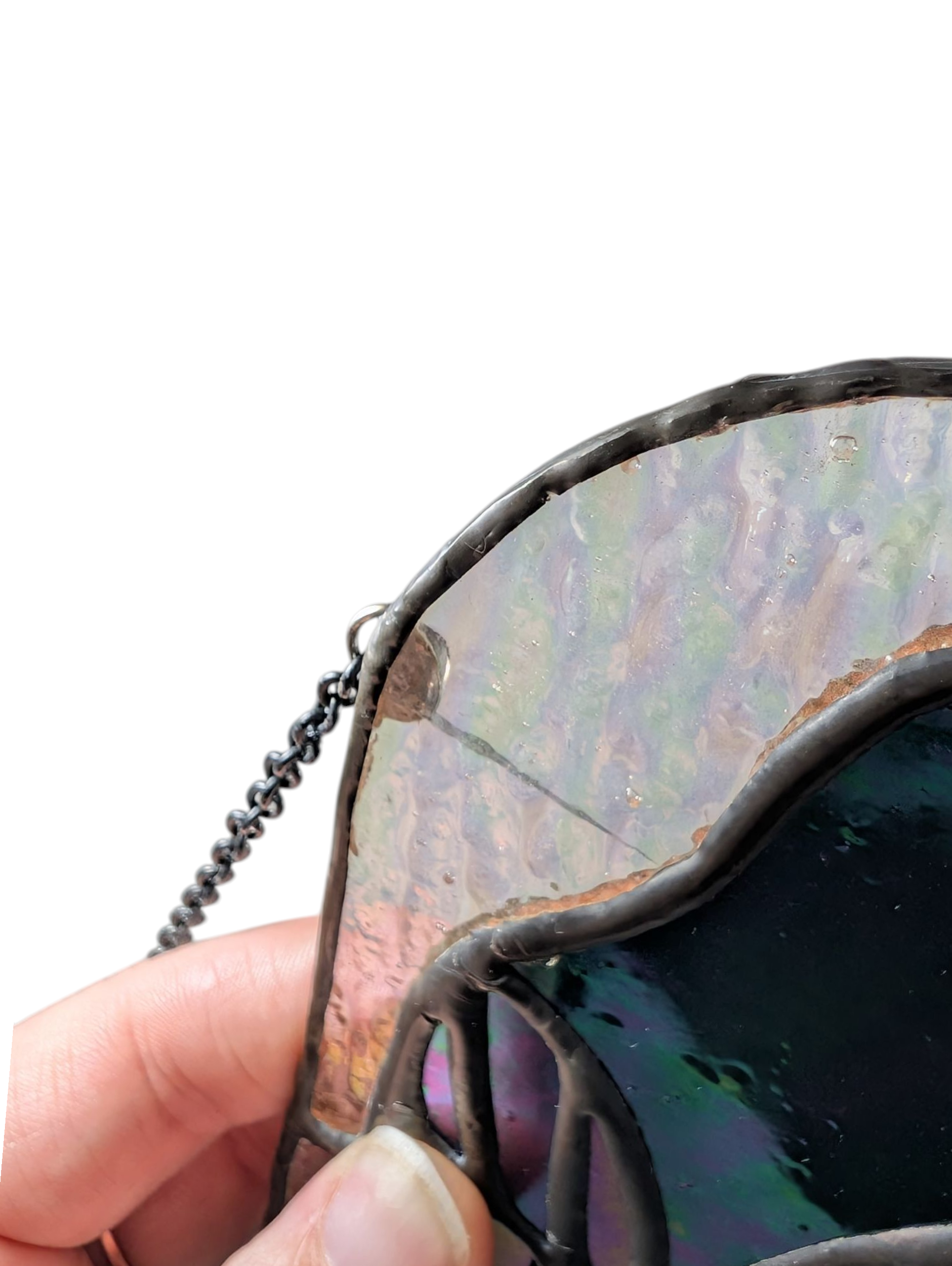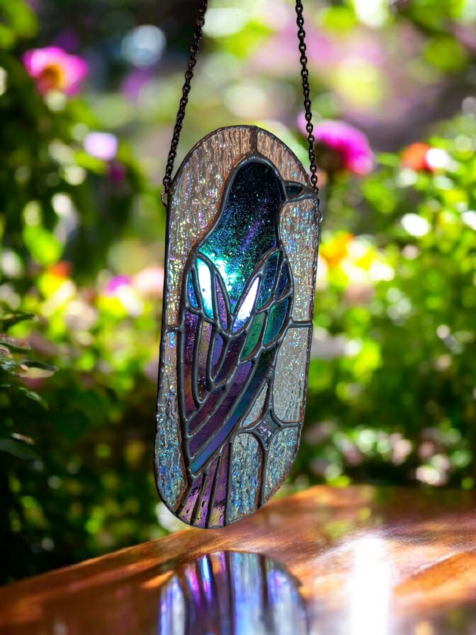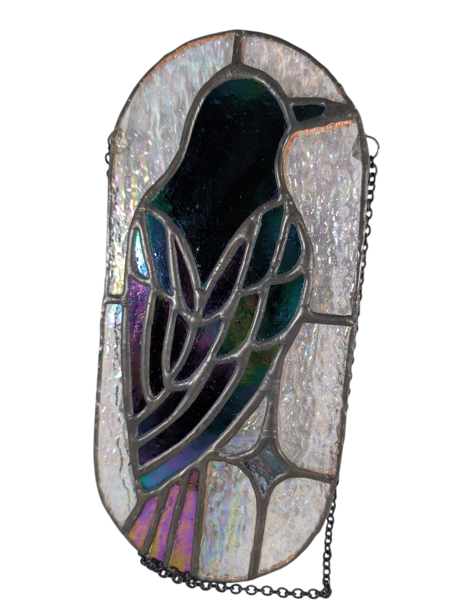 I used a black patina on the solder, which I think fits this design well! It features a black raven with iridescence with a textured clear glass background.