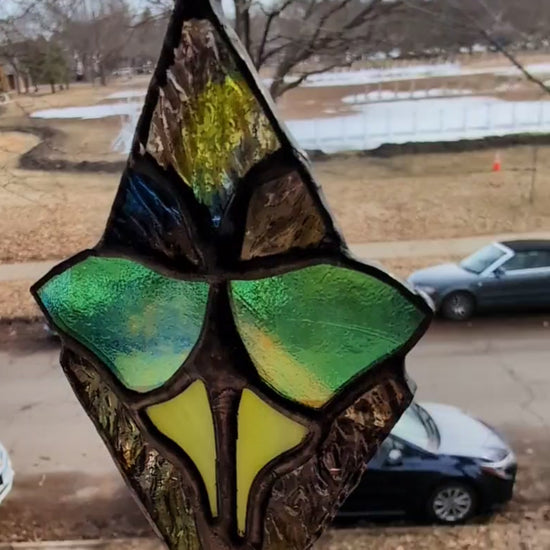 This pretty stained glass features a luna moth design. All my stained glass is constructed with 60/40 lead solder and is for decoration only.