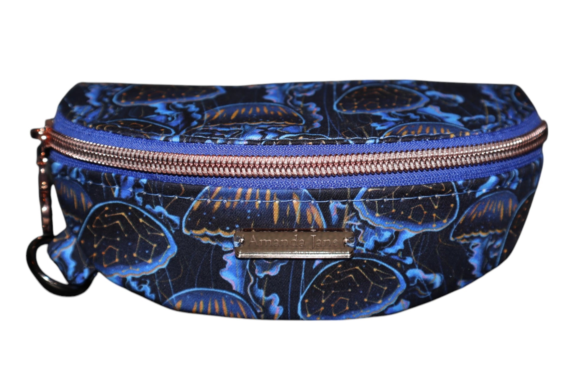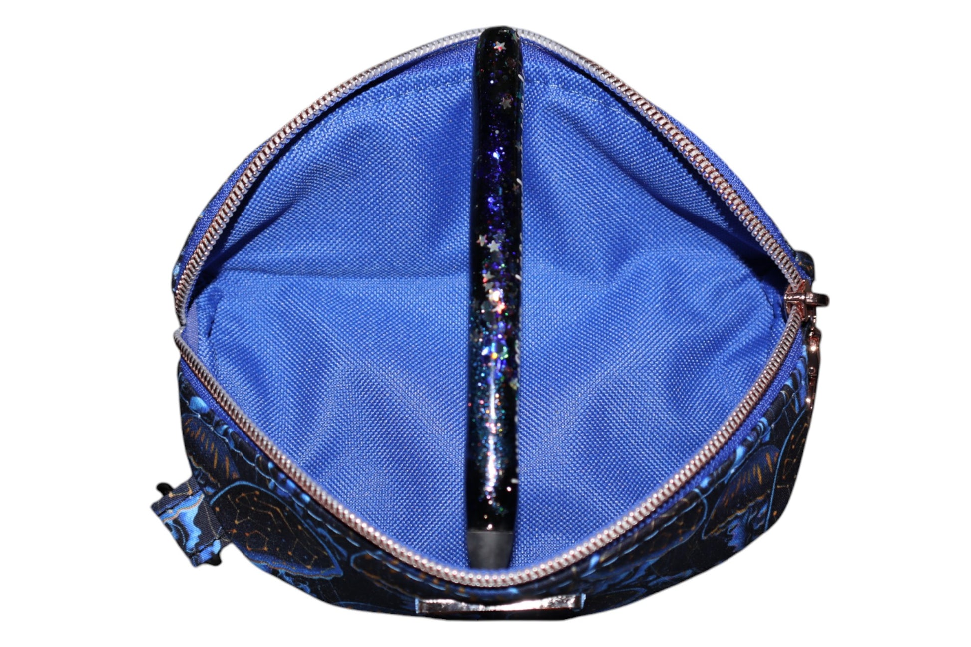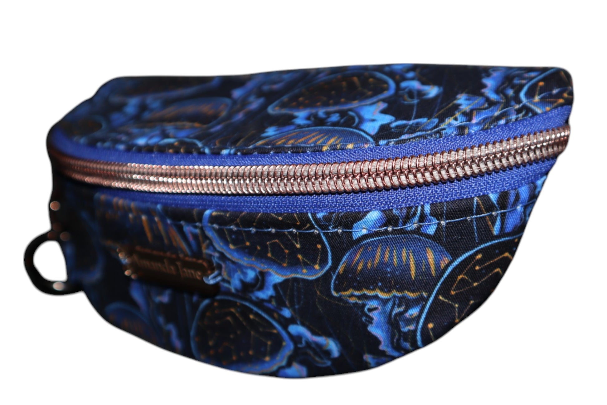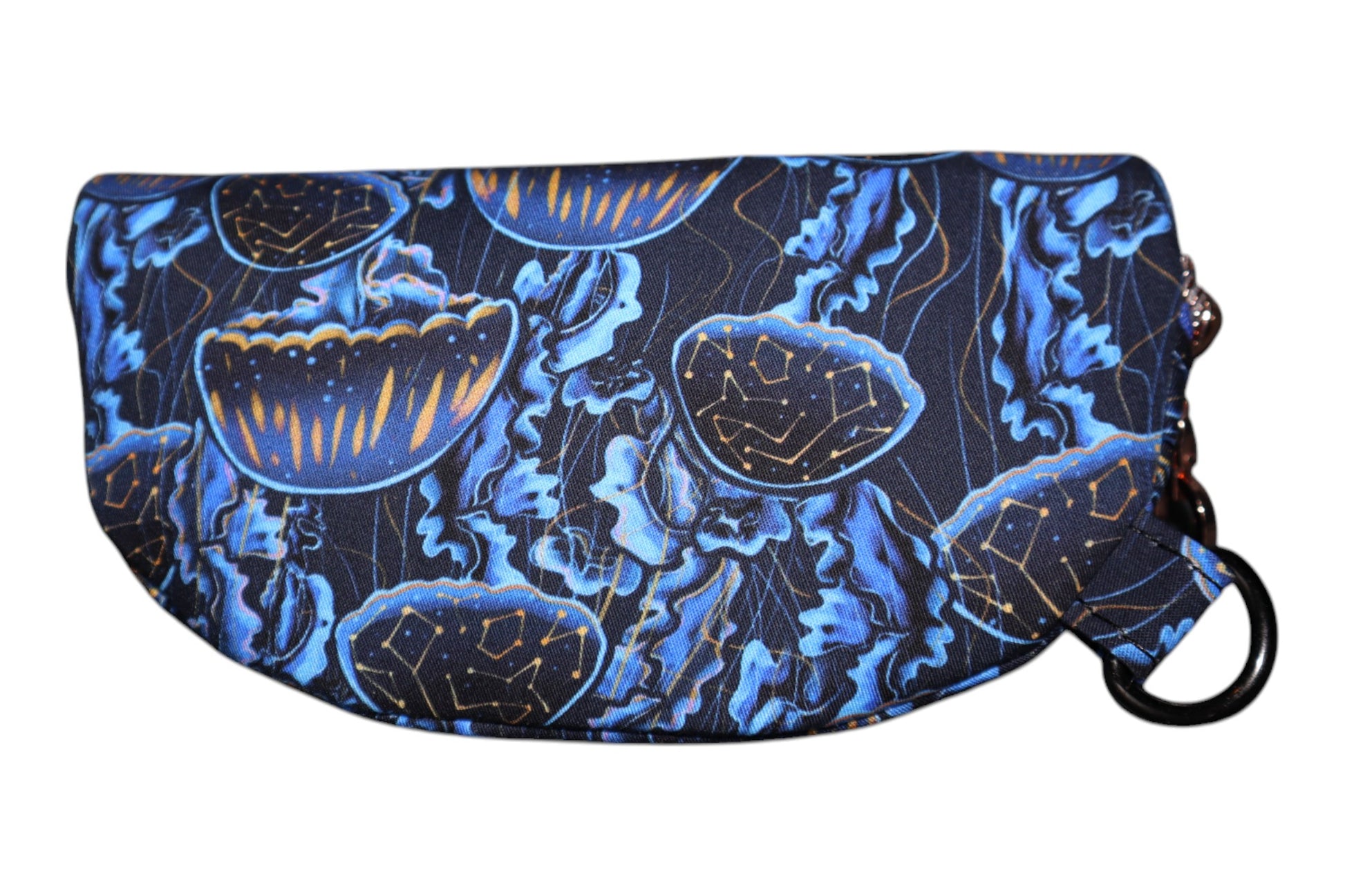 Lots of love and time was put into this sunglasses case! It has a custom print that has a gold and navy geometrical astro jellyfish design on it. The interior is a matching waterproof canvas. This case can hold up to 2 pairs of glasses/sunglasses