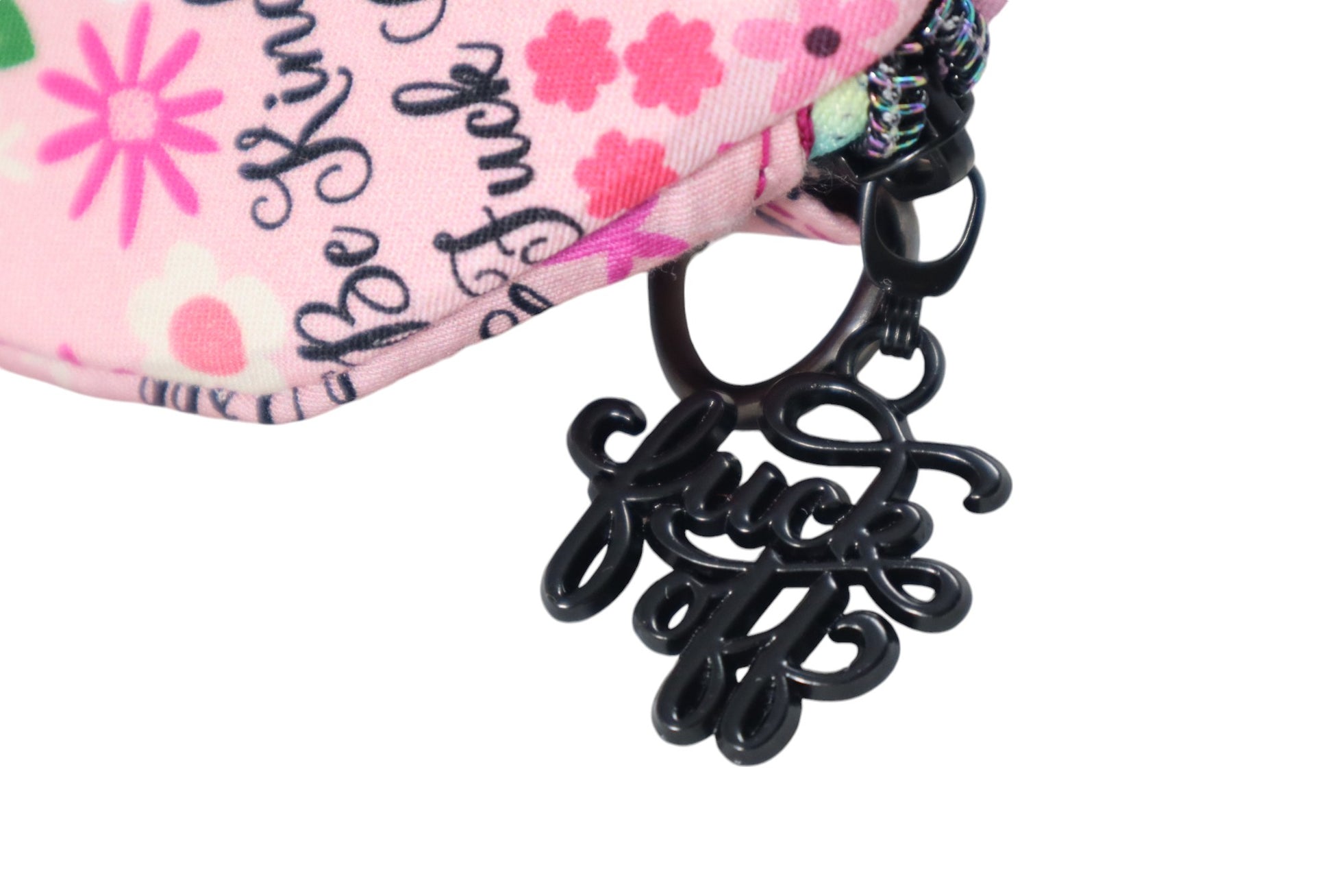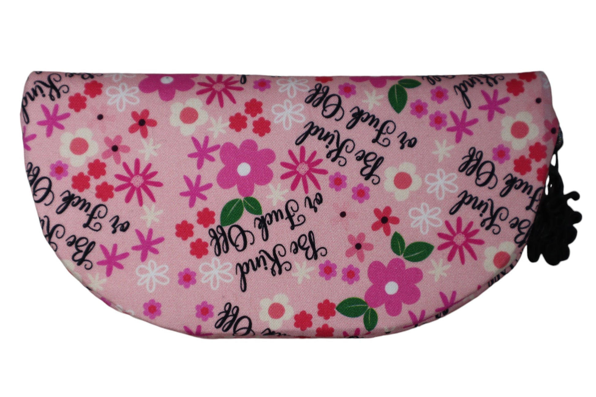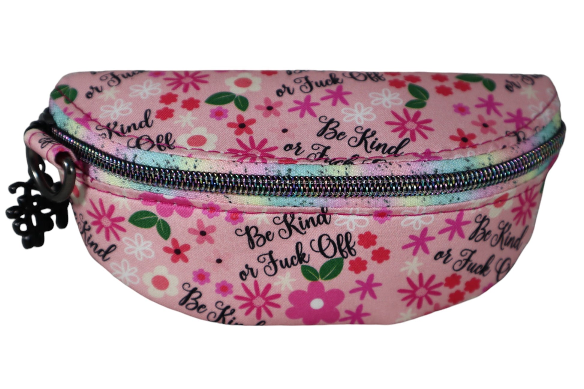 Lots of love and time was put into this sunglasses case! It has a custom print that has a floral design on it that also says "be kind or fuck off". The zipper pull is also matte black that says "fuck off". The interior is a matching waterproof canvas. This case can hold up to 2 pairs of glasses/sunglasses
