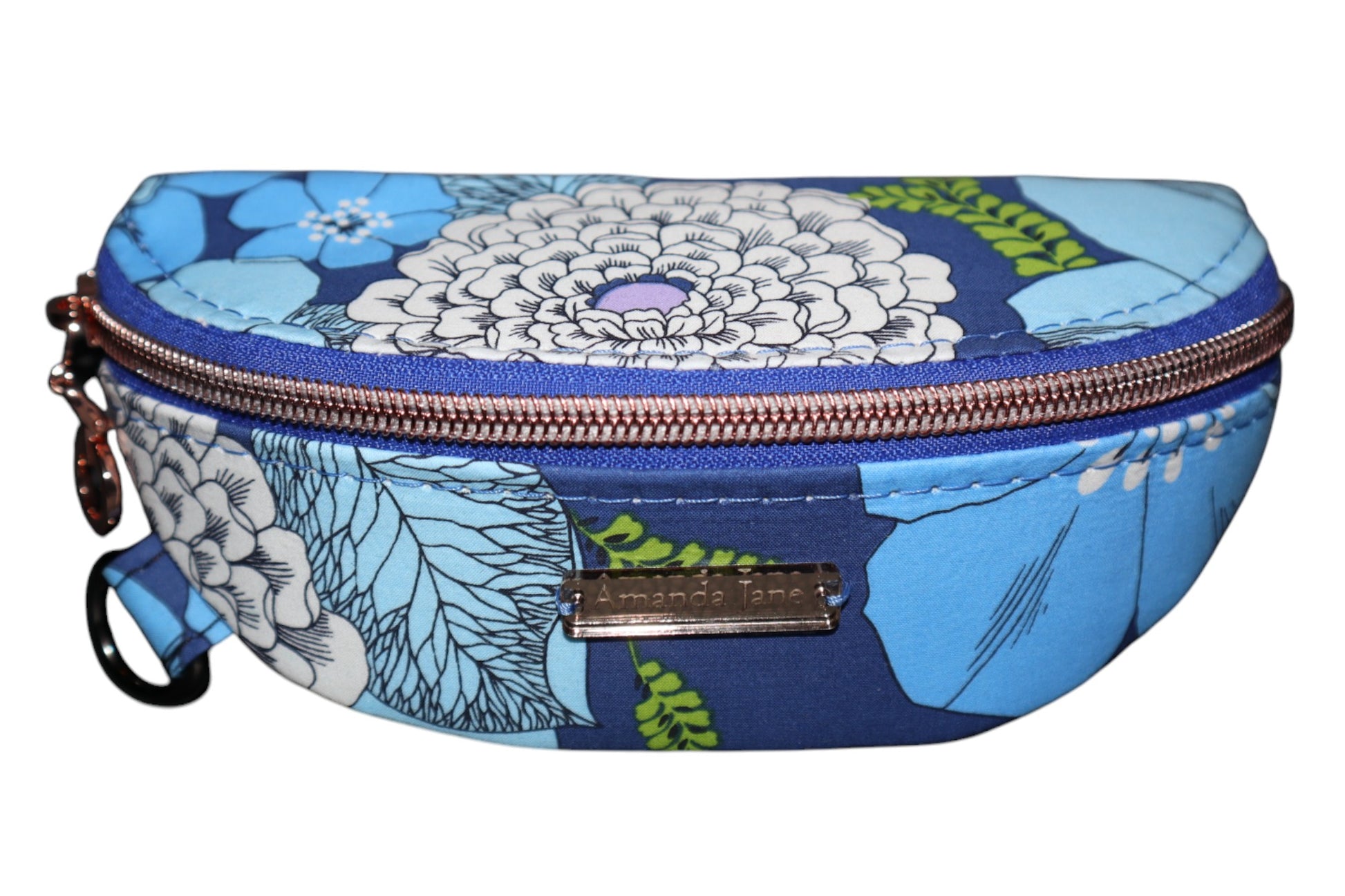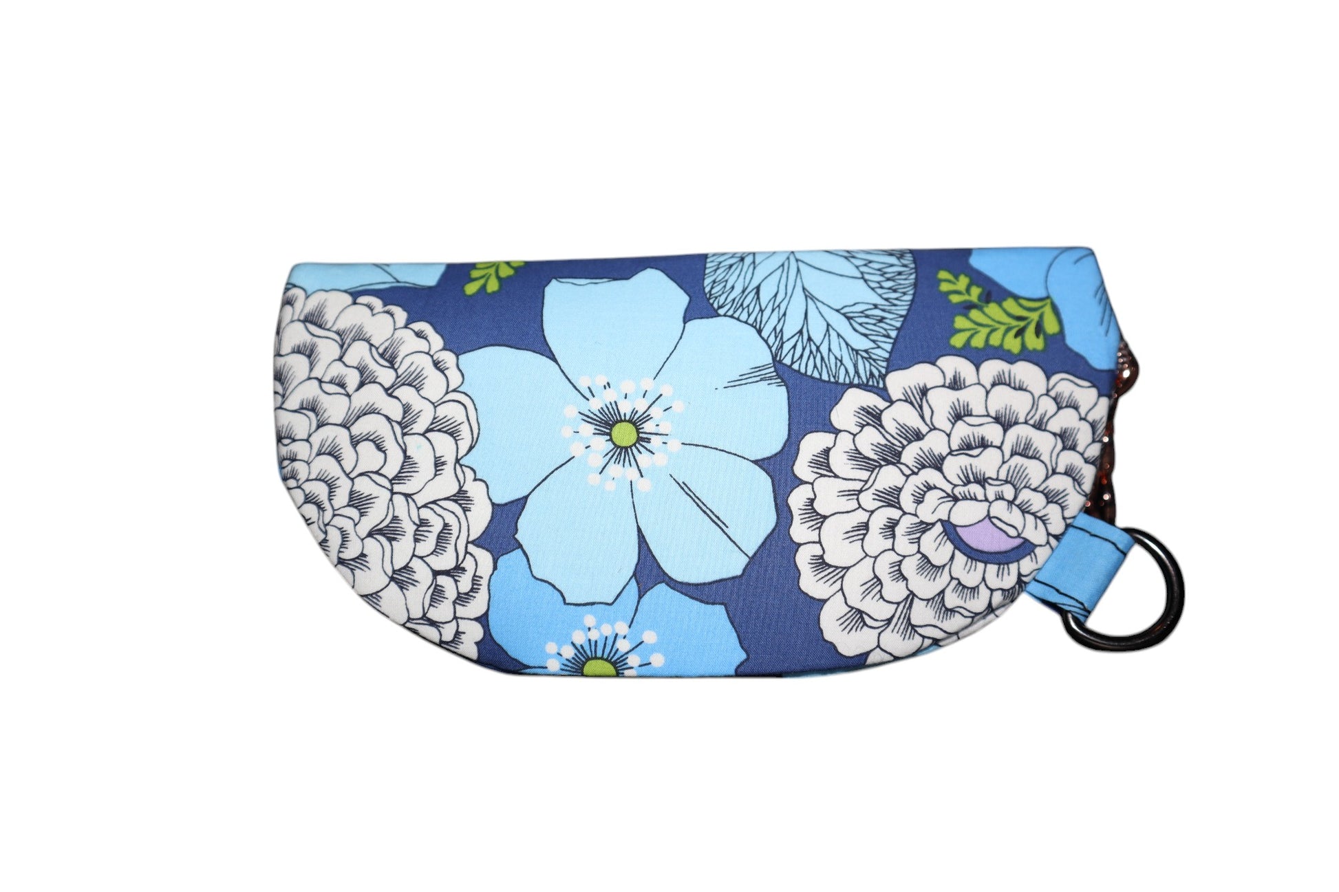Lots of love and time was put into this sunglasses case! It has a print that has a big blue floral design on it. The interior is a matching waterproof canvas. This case can hold up to 2 pairs of glasses/sunglasses