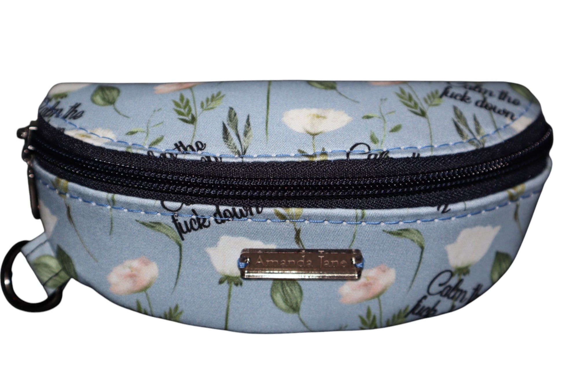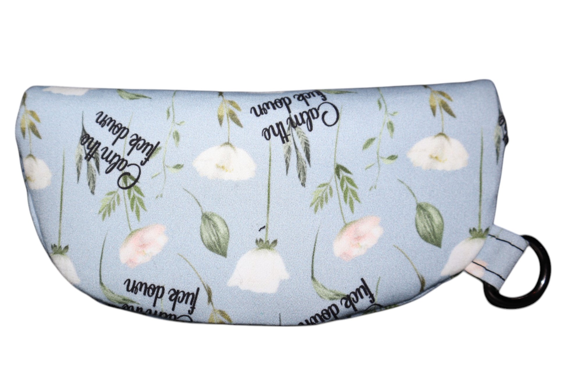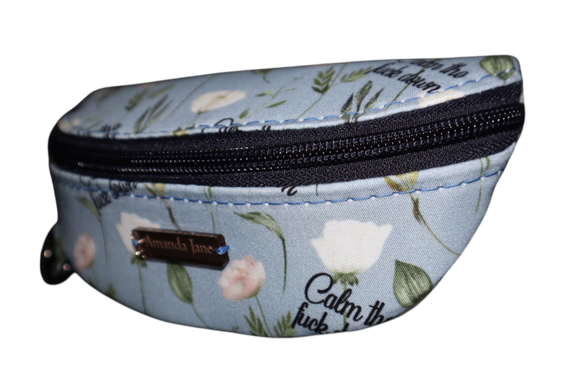 Lots of love and time was put into this sunglasses case! It has a custom print that has a blue floral design on it that also says "Calm the fuck down". The interior is a matching waterproof canvas. This case can hold up to 2 pairs of glasses/sunglasses