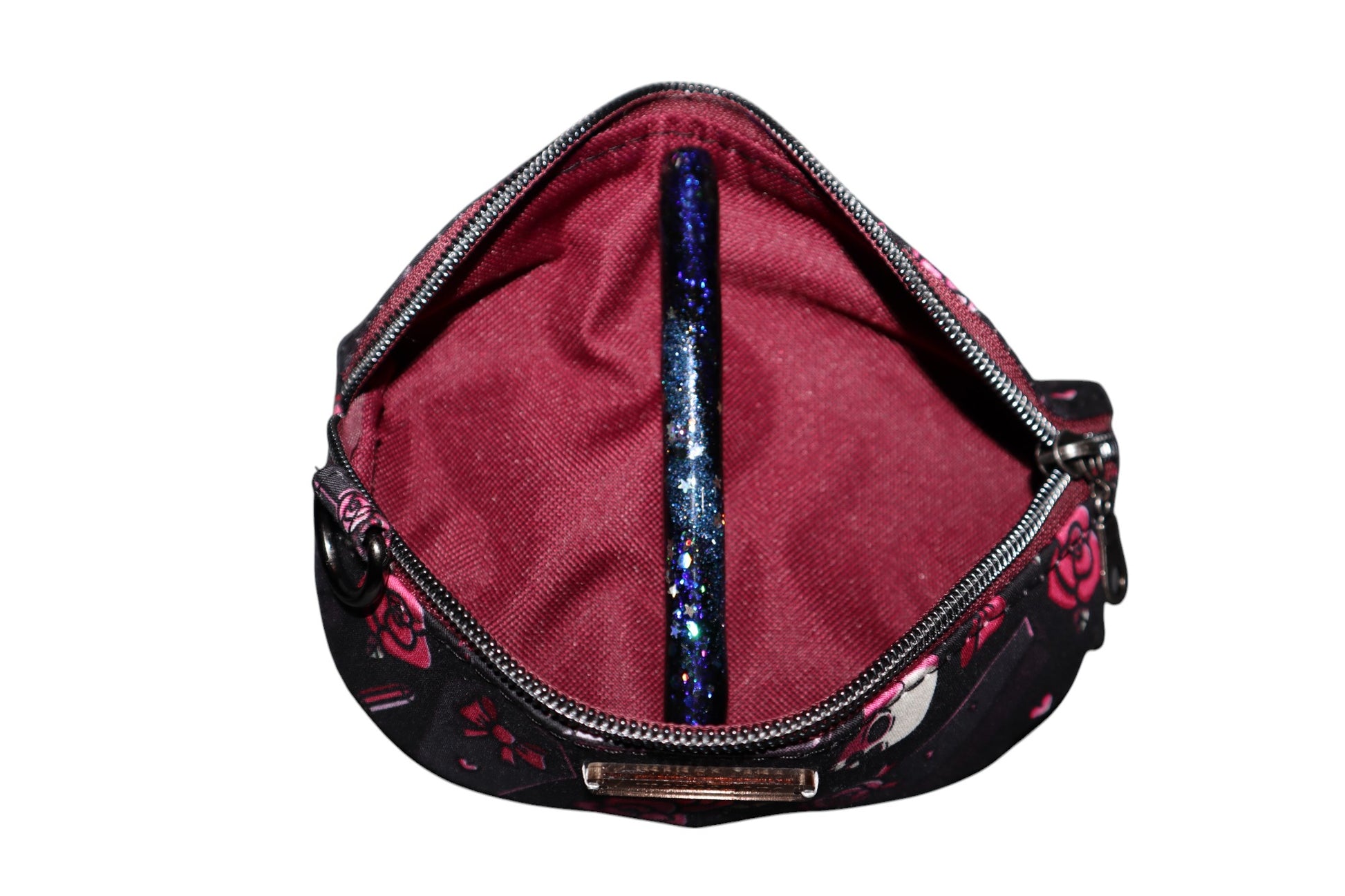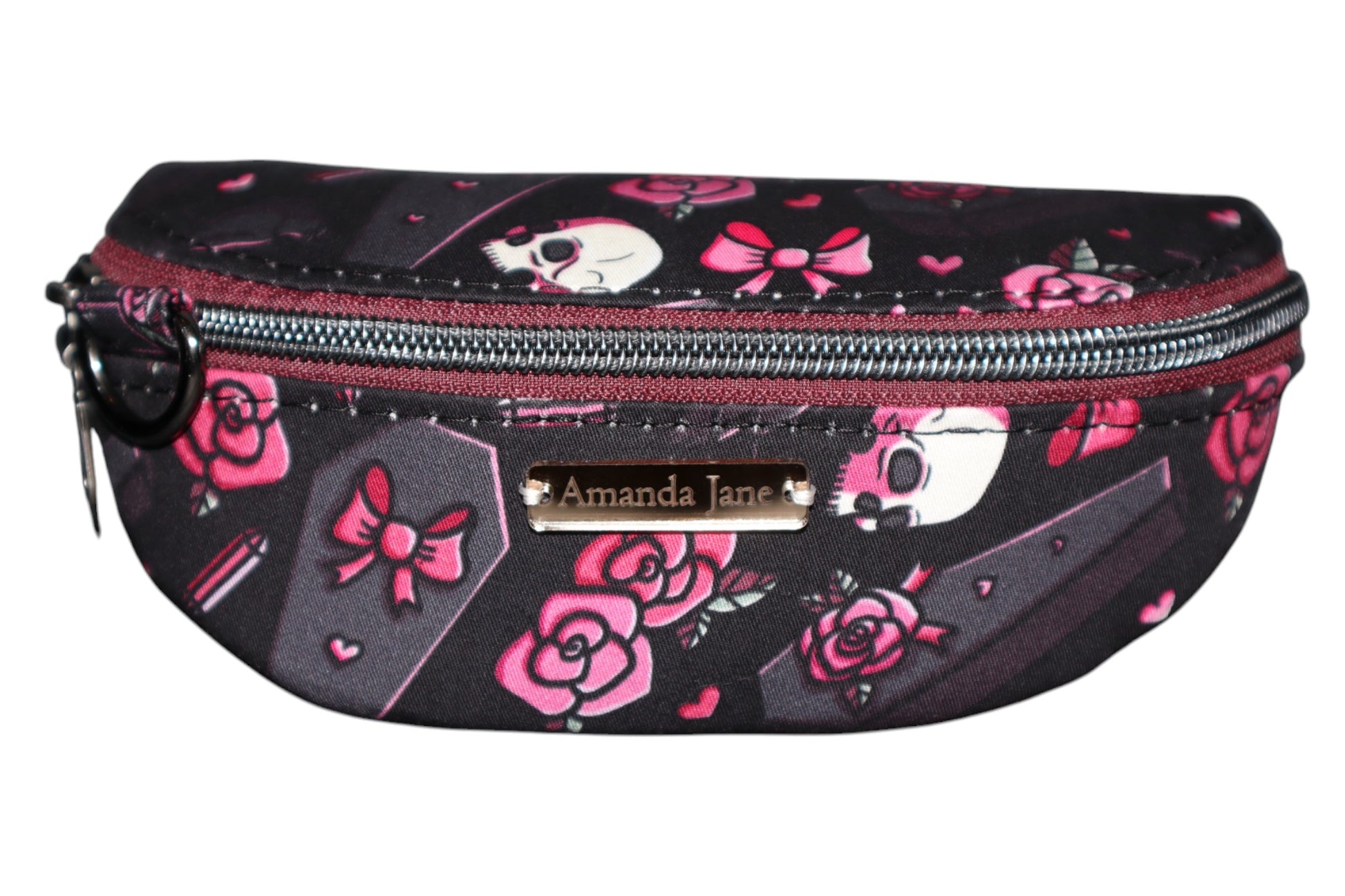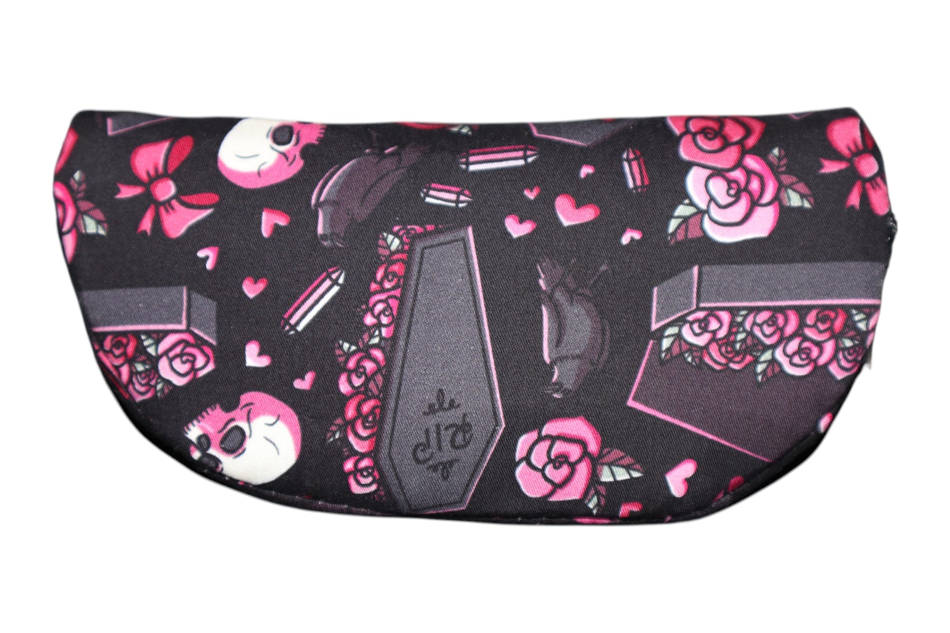 Lots of love and time was put into this sunglasses case! It has a custom print that has a pink goth and coffin design on it. The interior is a matching waterproof canvas. This case can hold up to 2 pairs of glasses/sunglasses