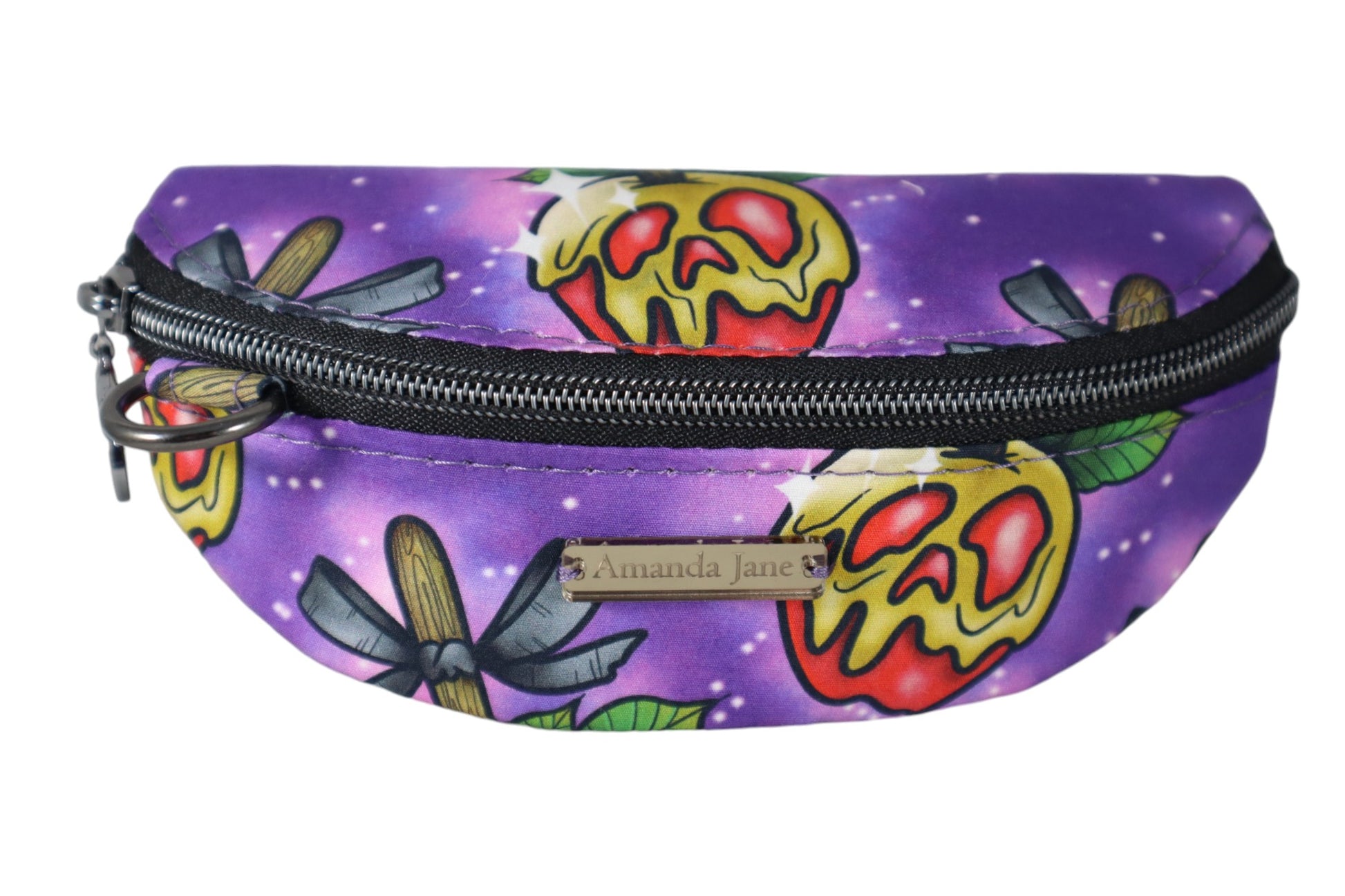 Lots of love and time was put into this sunglasses case! It has a custom print that has a purple poison apple design on it. The interior is a matching waterproof canvas. This case can hold up to 2 pairs of glasses/sunglasses