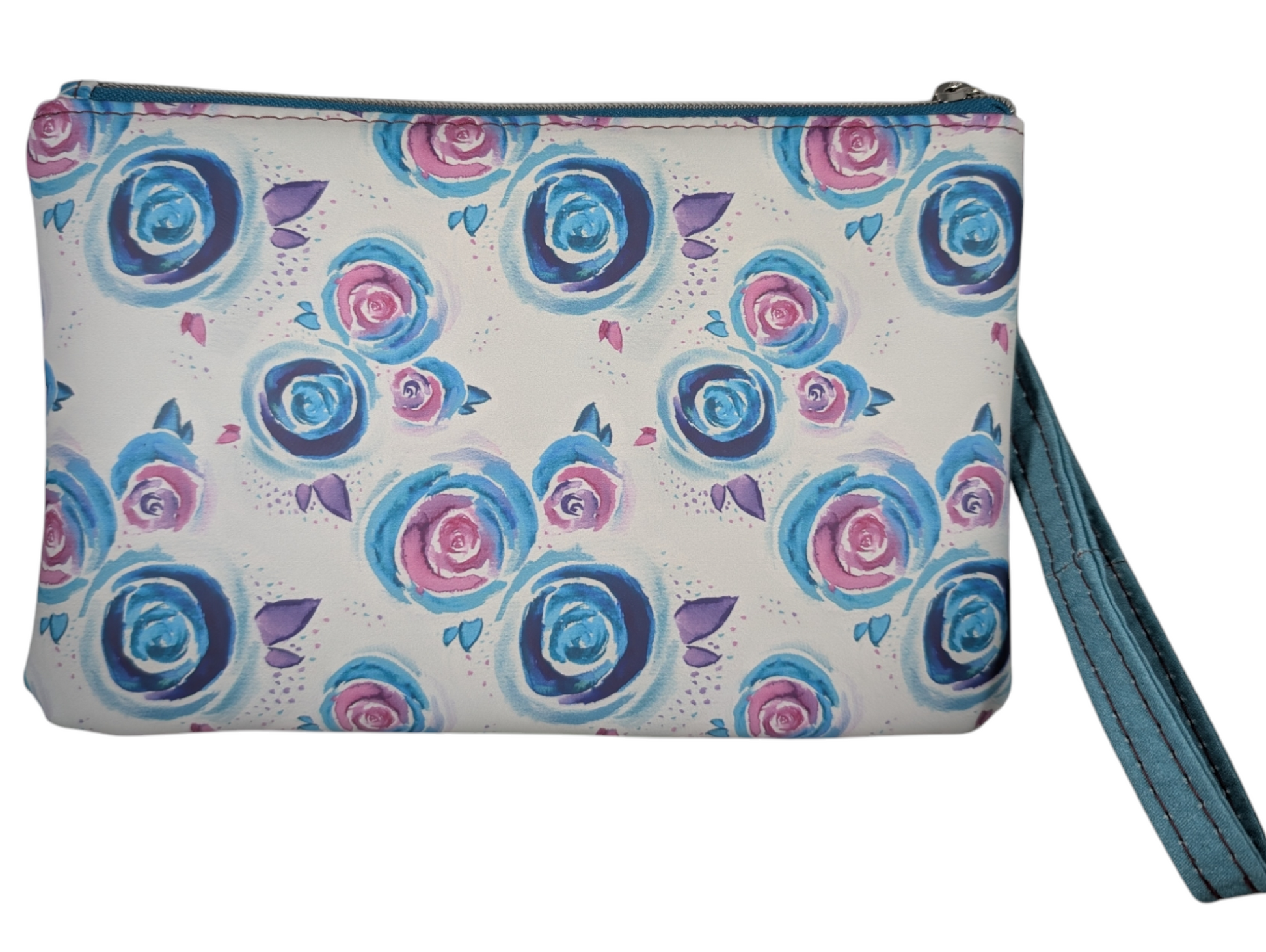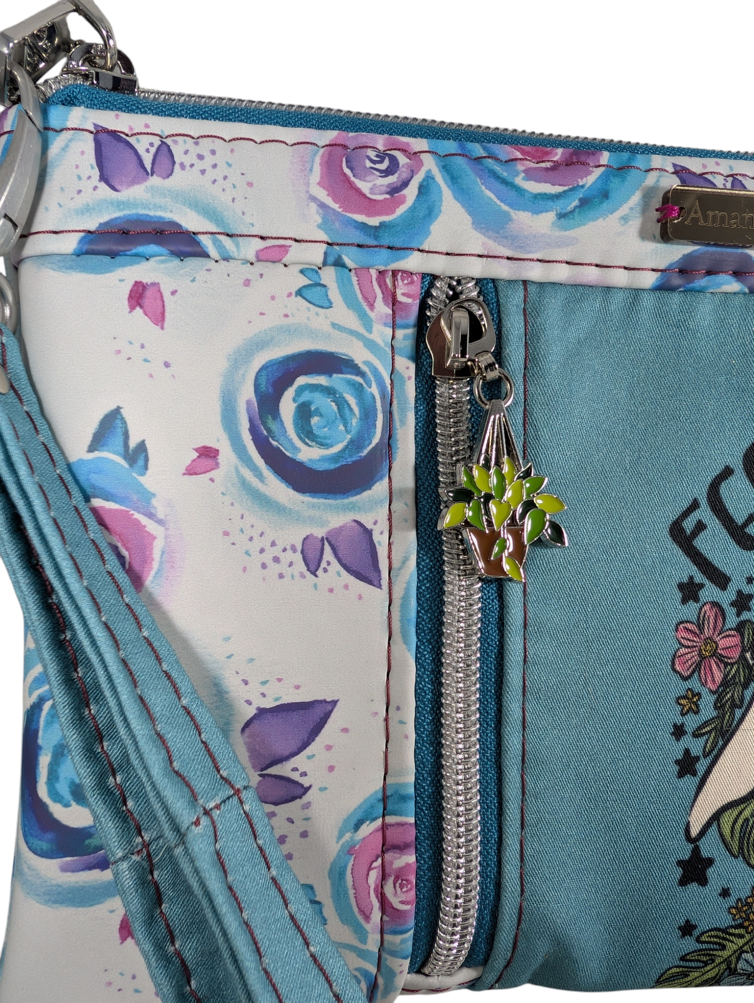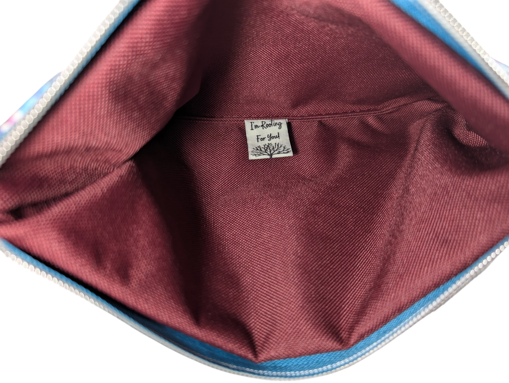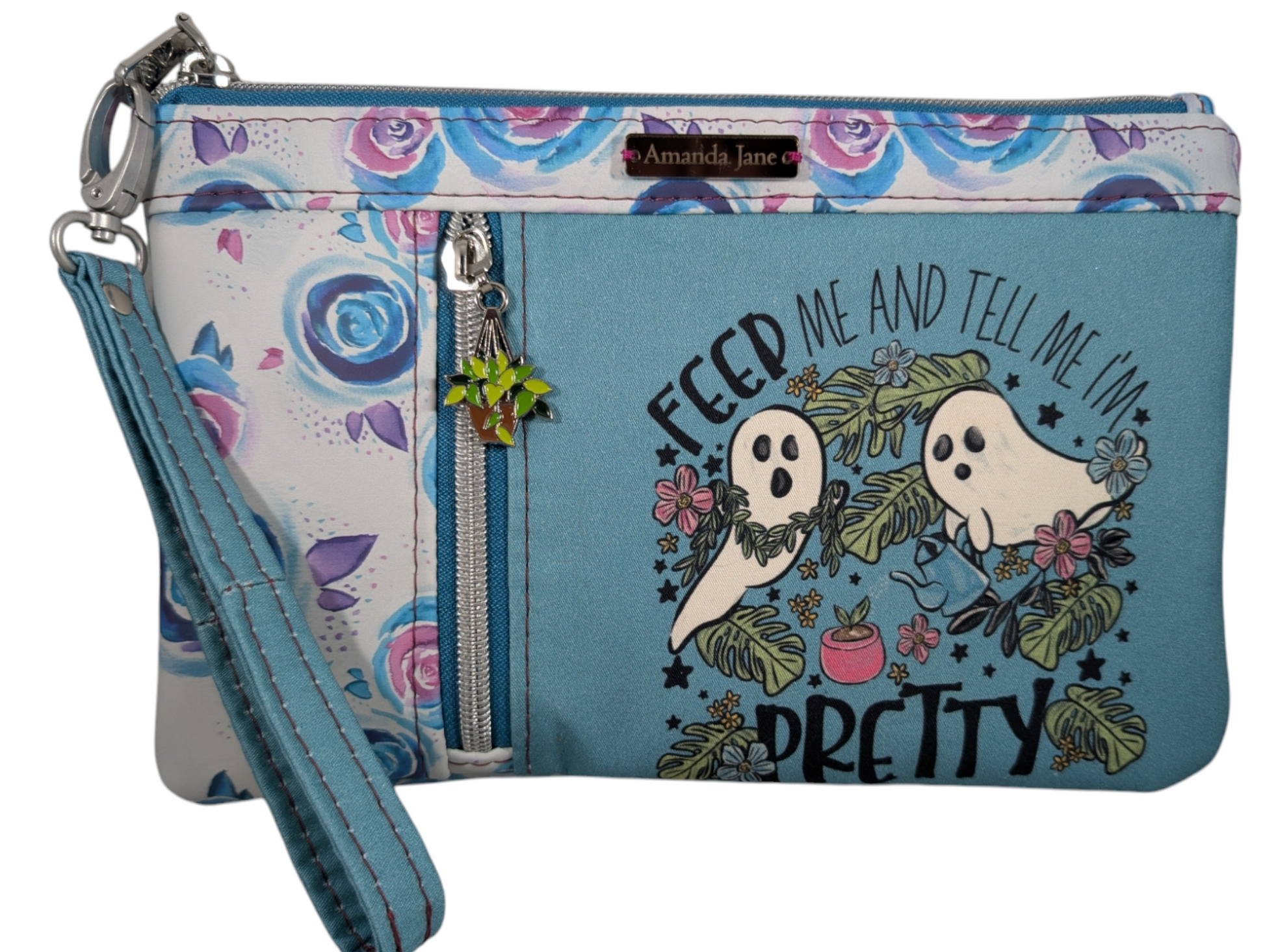 Lots of love and time was put into this purse! It has an awesome print on the outside that has a ghostie and plant design on it with UV reactive watercolor floral design vinyl front accents. The inside has a cranberry colored waterproof lining. It has a detachable hand strap.