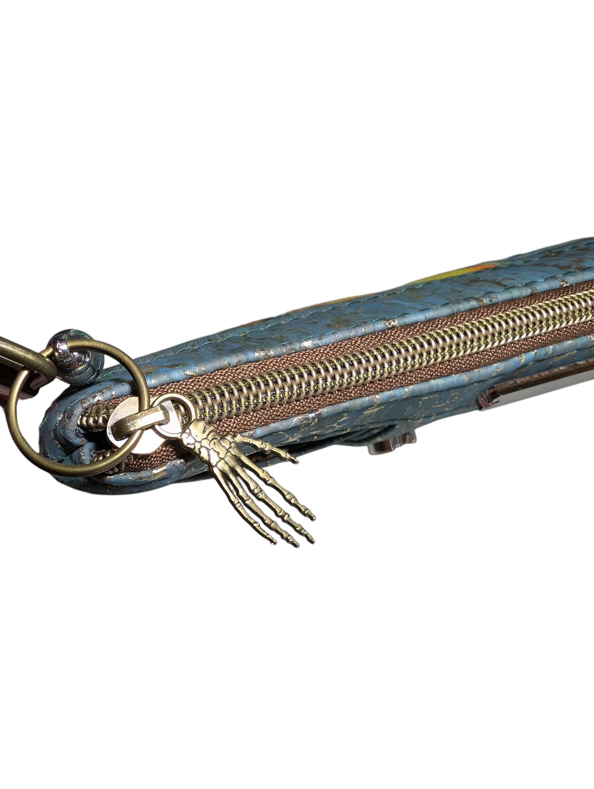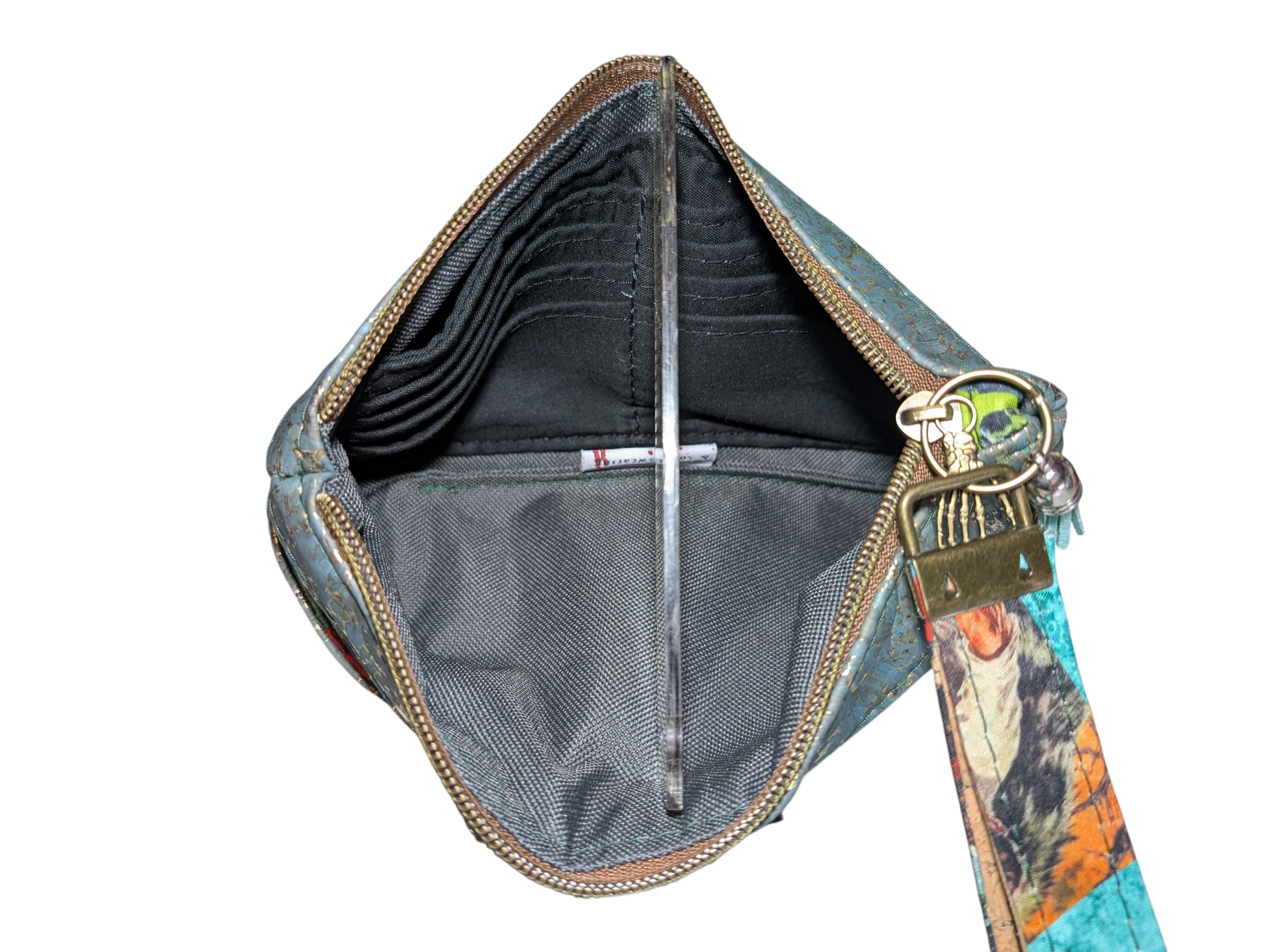 Lots of love and time was put into this purse! It has an awesome print on the outside that has a retro collage horror movie icons pattern. There is also a gold and teal Spanish cork accents. The inside has a grey waterproof lining. It has a detachable wrist strap. The inside has a spot for 8 cards with a slip pocket behind it, so no need to carry a separate wallet.