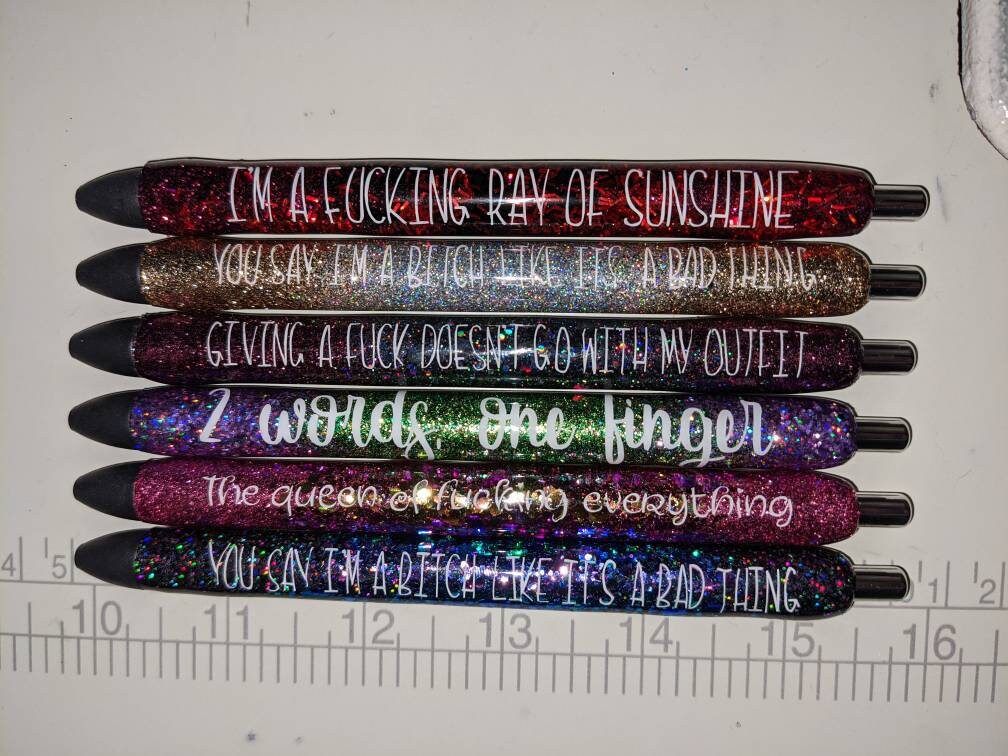 This listing is for ONE custom glitter pen. This pen is made with epoxy, glitter, and a vinyl decal. The decal is under a layer of epoxy and will last a long time! They are refillable with Energel 0.7mm gel refills. You choose the name or a short phrase and the color choices. Included are pictures of examples I have done in the past and how they will come packaged. Please note these pens are made to order and can take anywhere from 2-4 weeks to complete. Once I receive the order, I will message you about text and color choices. Please select the "I understand" box when completing your purchase stating you understand this turn around time. Sorry, I do not do deals on larger quantities.