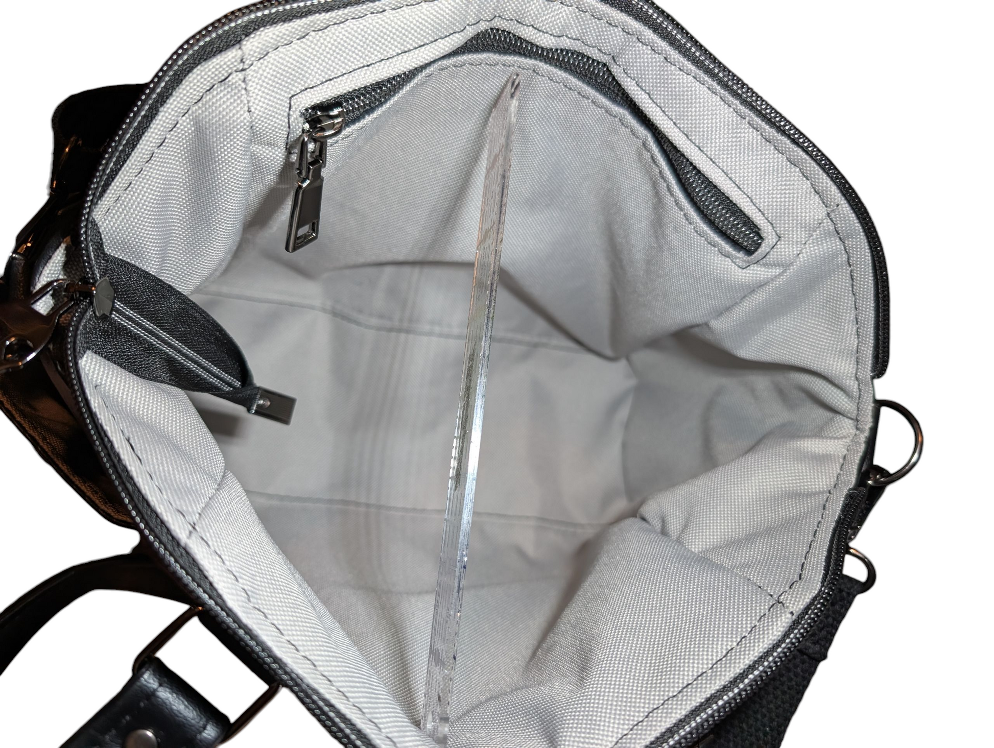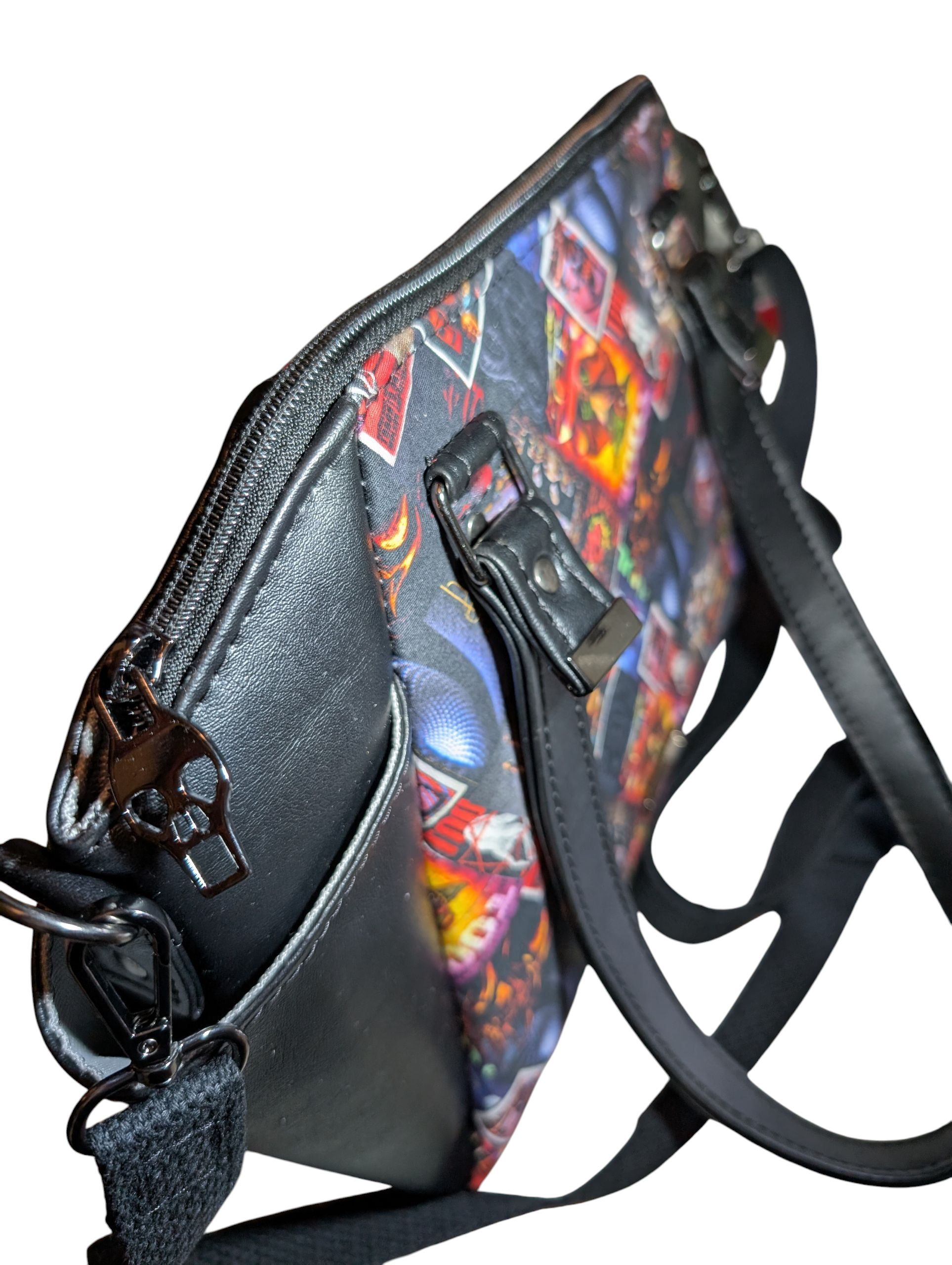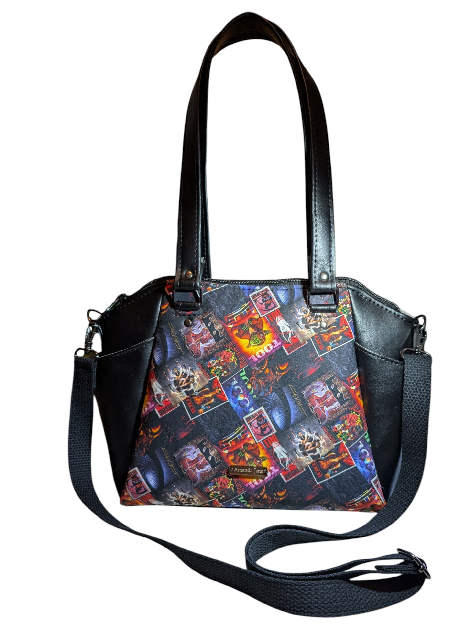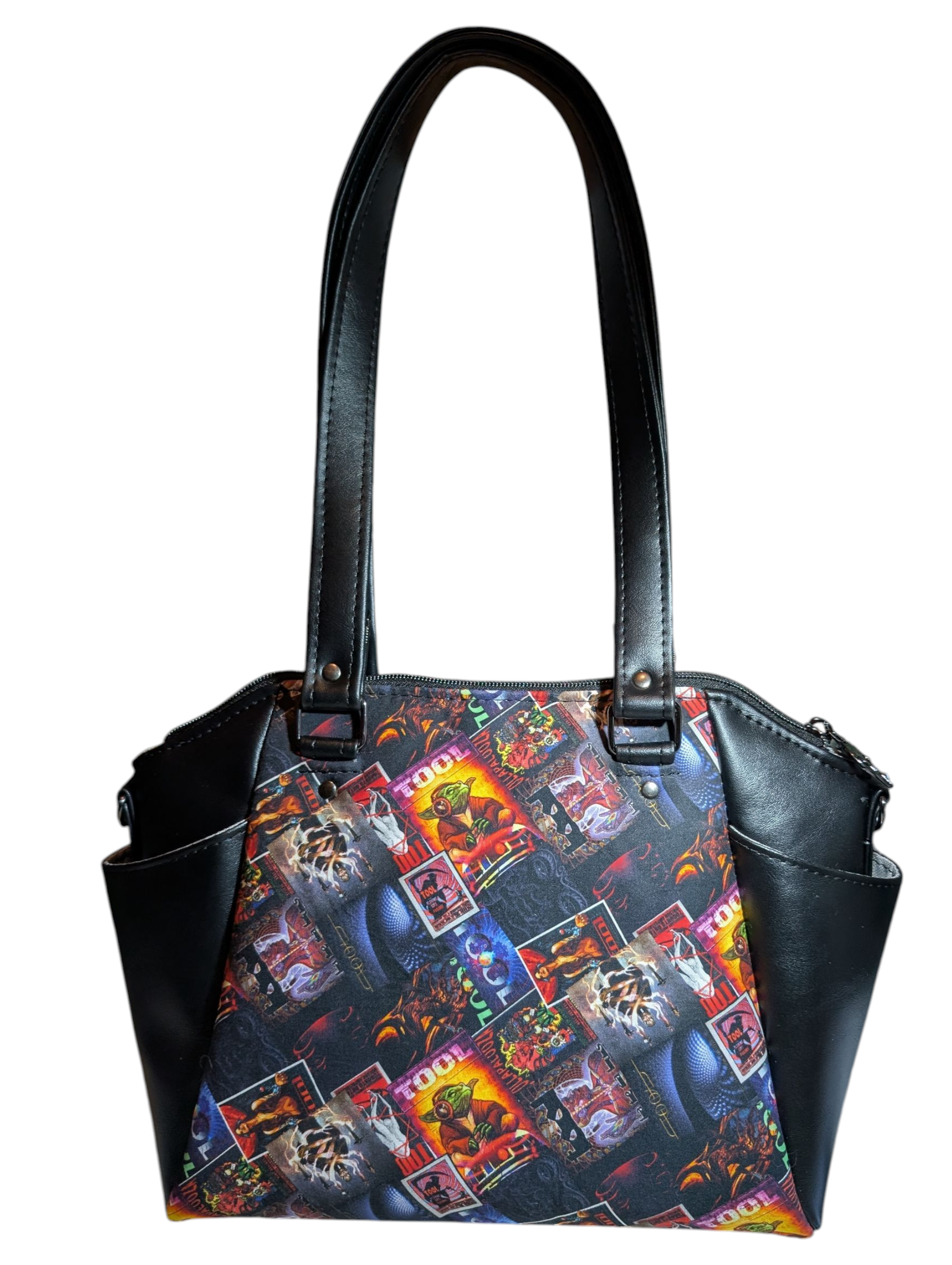 Lots of love and time was put into this purse! It has an awesome custom TOOL pattern with black vinyl pockets, handles, and bottom. All fabric has been interfaced with woven fabric and/or foam backing for stability. It has a grey waterproof canvas lining on the inside. There is also a 7 inch zipper pocket on the inside of the purse. There are side pockets as well.