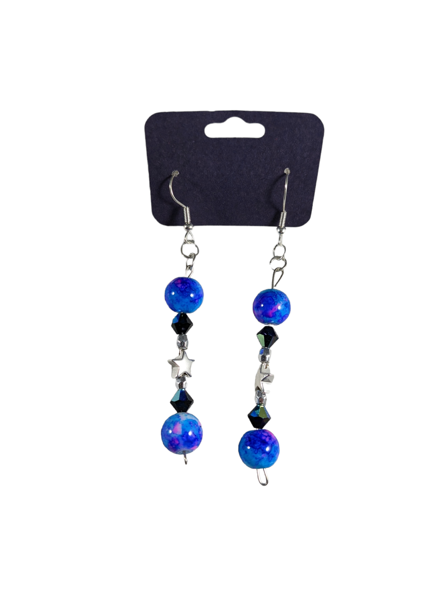 These are a pair of lovingly made beaded earrings by Lydia. They feature a mix of glass, acrylic, stone, and/or metal beads